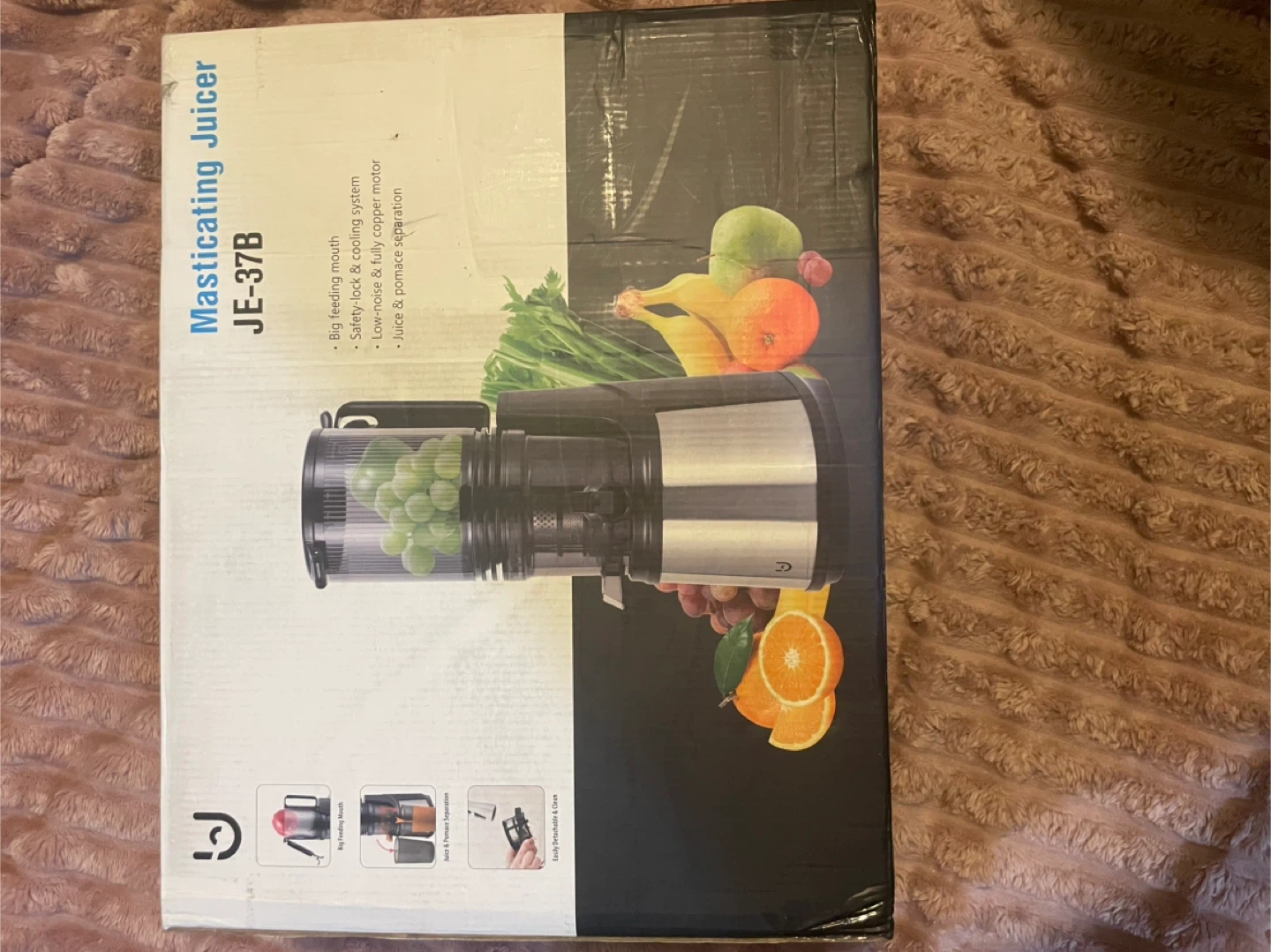 I'm selling a masticating cold pressed juicer, model JE-37B. It juices your fruits and leafy vegetables without blades, so there's no oxidation, which means more nutrition and longer freshness! It also provides fiber-rich juice with up to 98% juice yield, retaining original flavor and nutrients in your fruits and vegetables. It has a big feeding mouth, safety-lock & cooling system, and juice & pomace separation. The product specification includes voltage (VAC): 110V-120V~, frequency (Hz): 60, and it's BPA free. The box measures 43.8X19.3X34.7CM