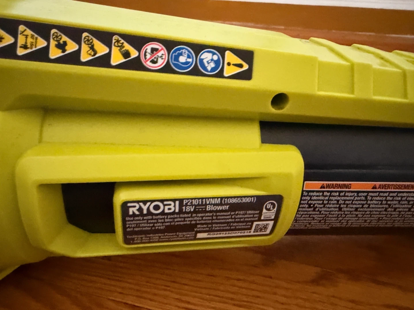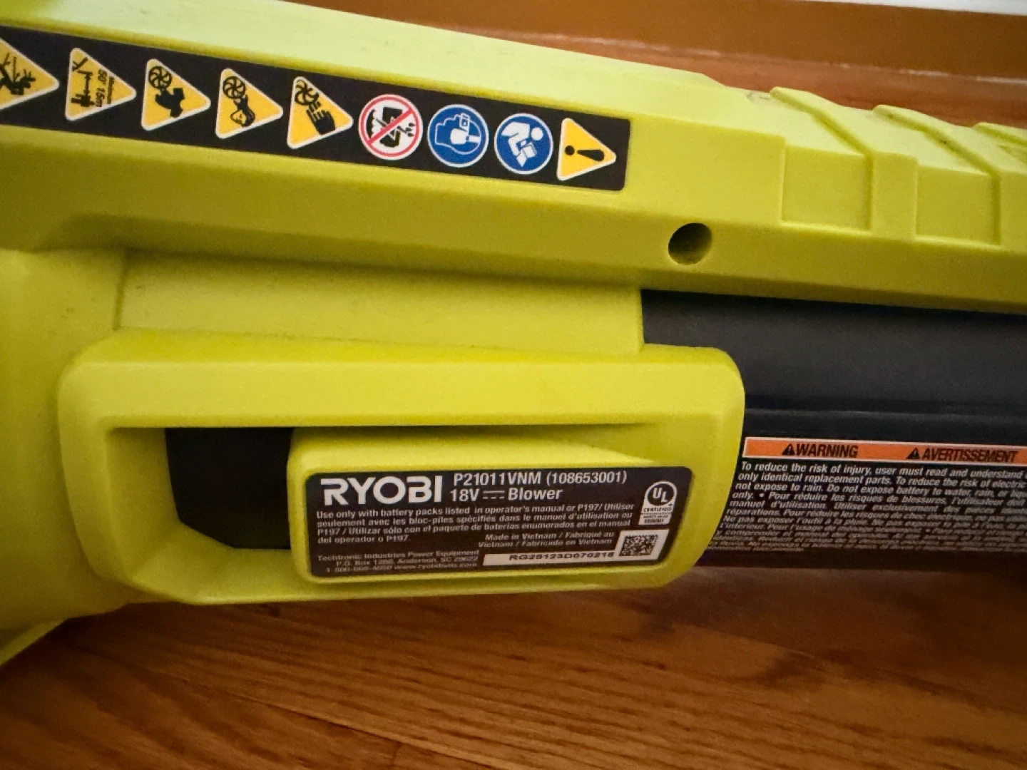 This is a Ryobi 18V blower. Model P21011VNM. It's yellow and black. Comes with a built-in nozzle. Perfect for clearing leaves and debris!