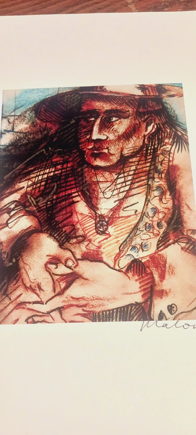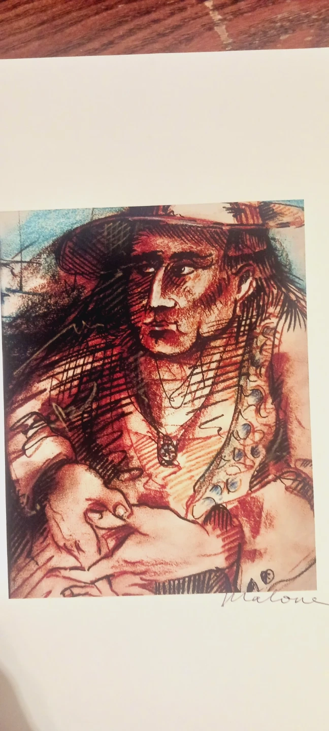 Signed Malone artwork depicting a man wearing a hat. The artwork is done in a colorful, expressive style. It's signed by the artist in the lower right corner. 11"×8". It is not framed. ALL MY PRICES ARE NEGOTIABLE !!