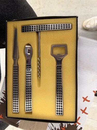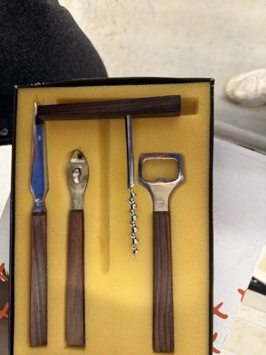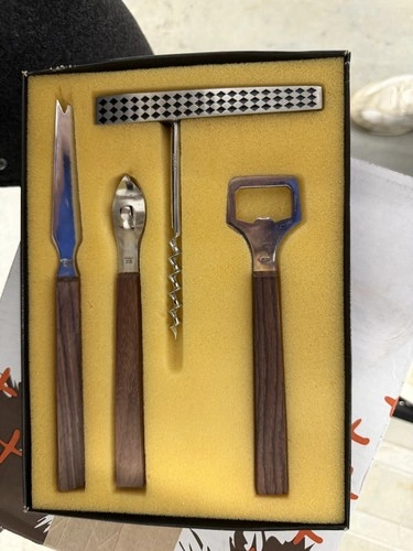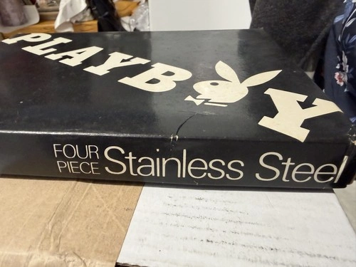 This is a vintage Playboy 4 Piece Stainless Steel Bar Set, originating from Japan in the 1970s. The set features a unique design with checkered steel over teak wood, adding a touch of sophistication to any home bar or entertaining area. This stylish and functional set includes all the necessary elements for serving drinks in style. Feel free to message if you have any questions!