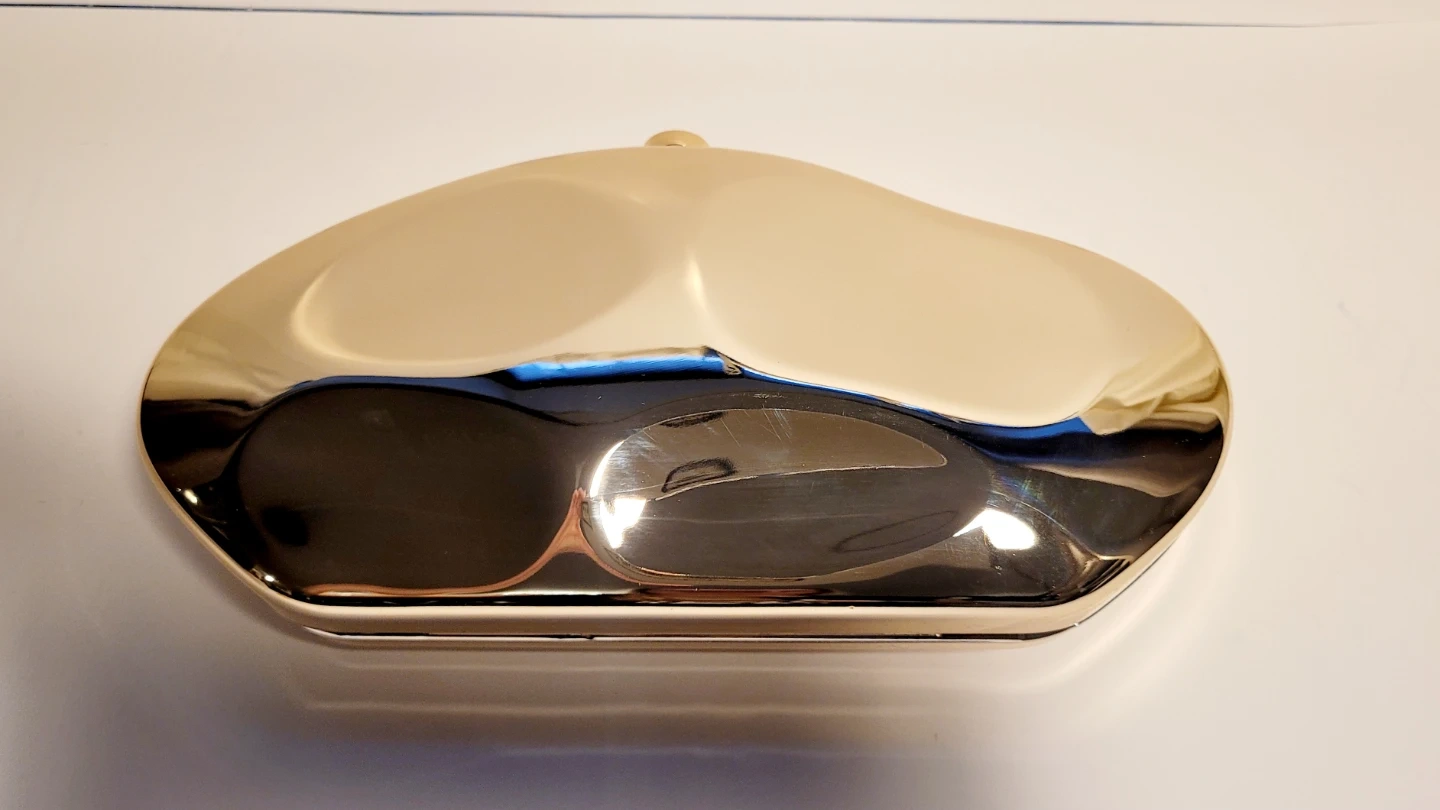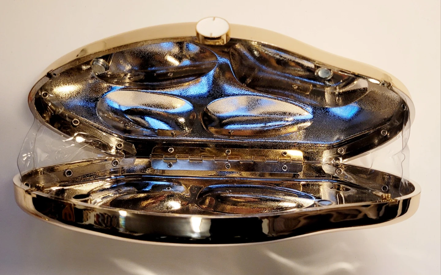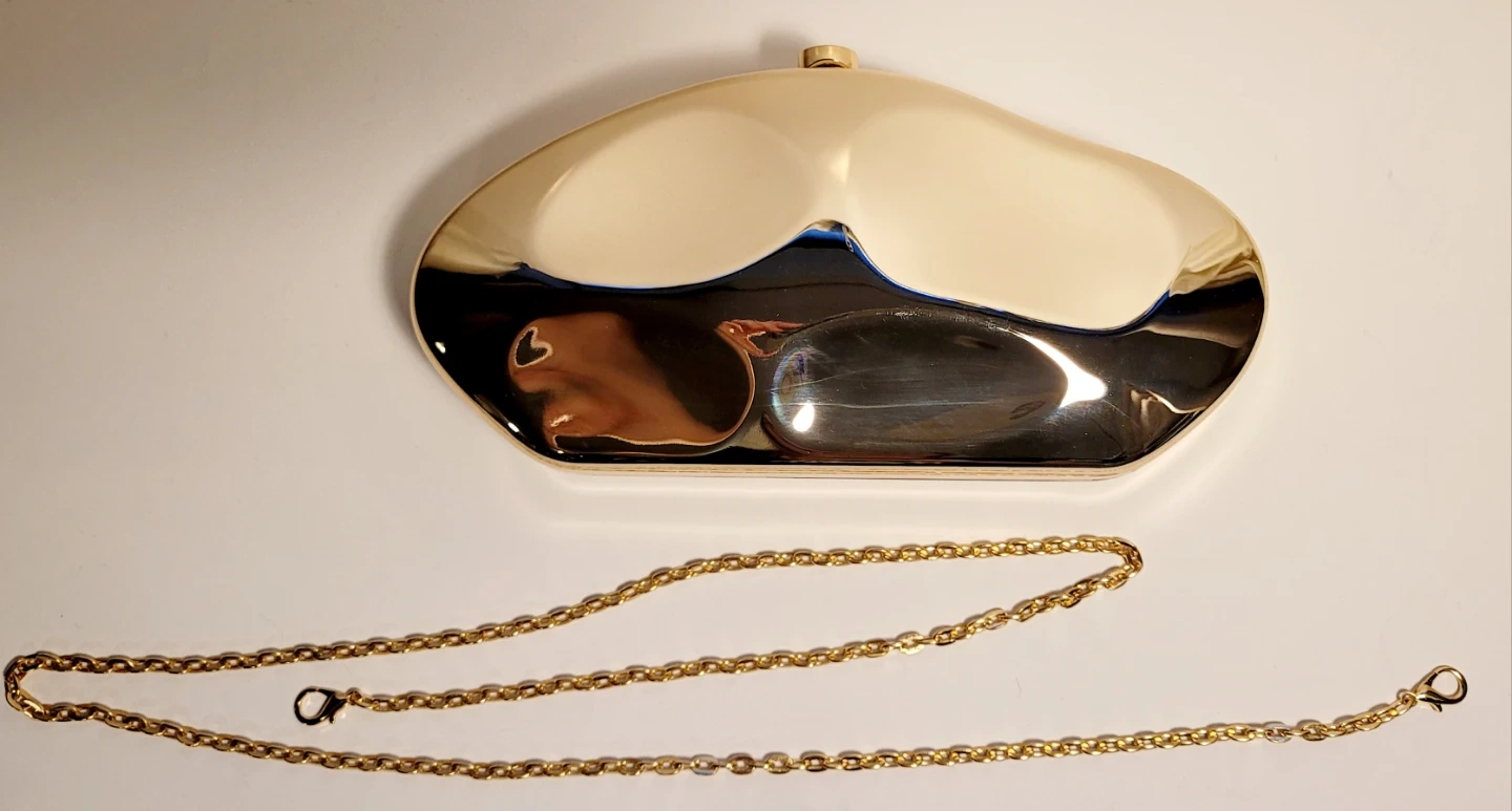 This striking clutch features a unique gold-tone exterior and a detachable gold chain strap. 10.5" by 5.5", so it fits most phones, detachable chain is 44" long for crossbody use. Used once, no scratches. Perfect for evening events or a glamorous night out!