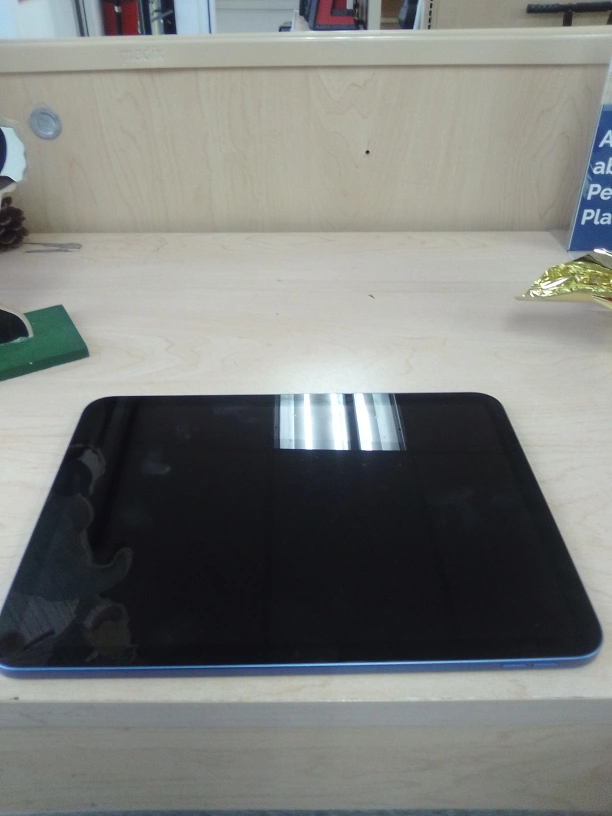 Blue iPad with a black screen. 32GB. The device is in good condition and working order. Layaway and in house financing available open Mon-Fri. 10am-6pm Sat 10am-5pm sunday-closed 2337 w cermak ASK FOR IARELY