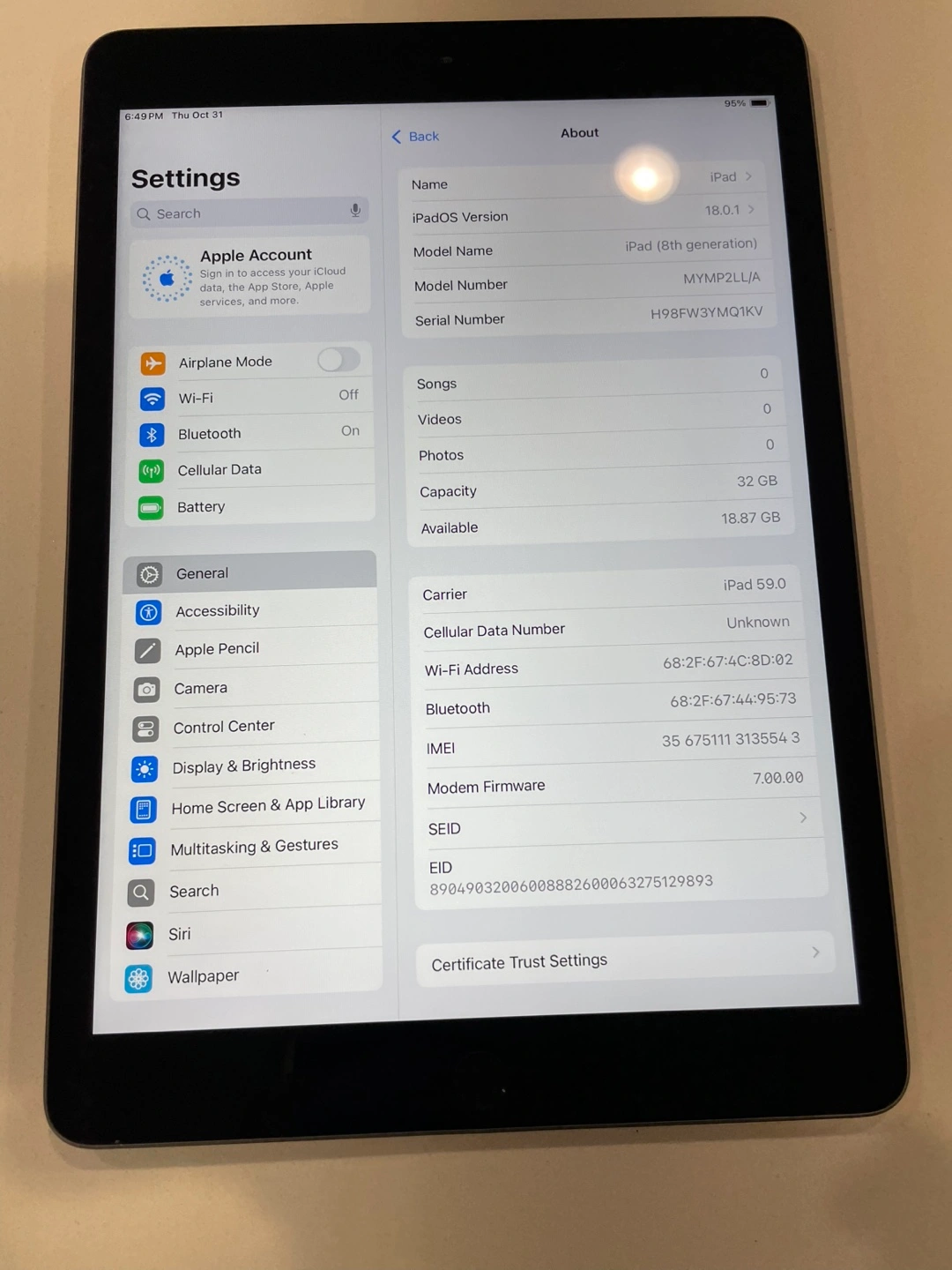 142Apple iPad 8th Generation 32Gb Cellular color Space gray Unlocked to any carrier