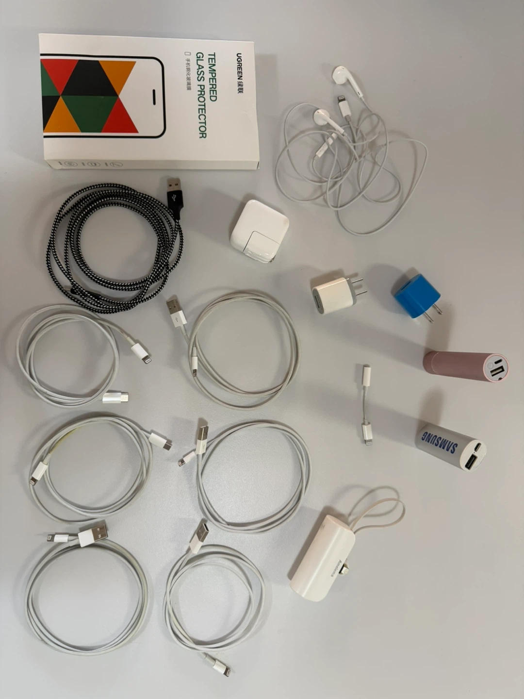 60Selling a bundle of iPhone 11/12/13/14 accessories! Included are various charging cables (USB-A to Lightning, USB-C to Lightning), wall adapters, tempered glass screen protector (for pro), apple headphone, headphone connector, and portable chargers. Open to selling a subset. Feel free to contact.