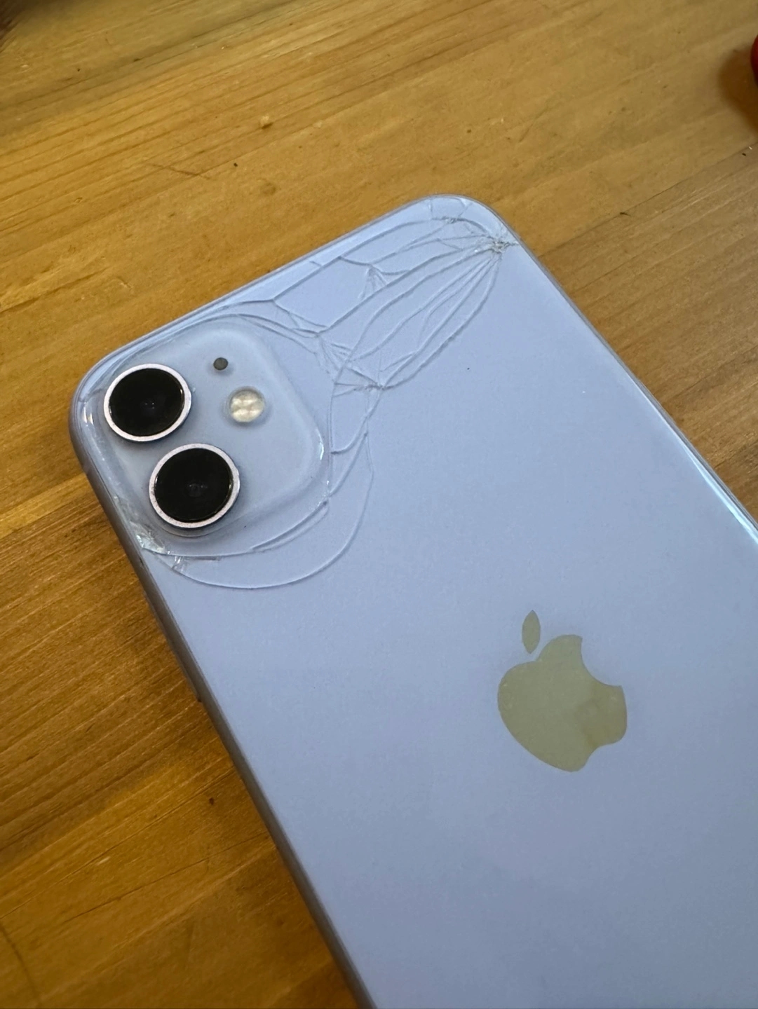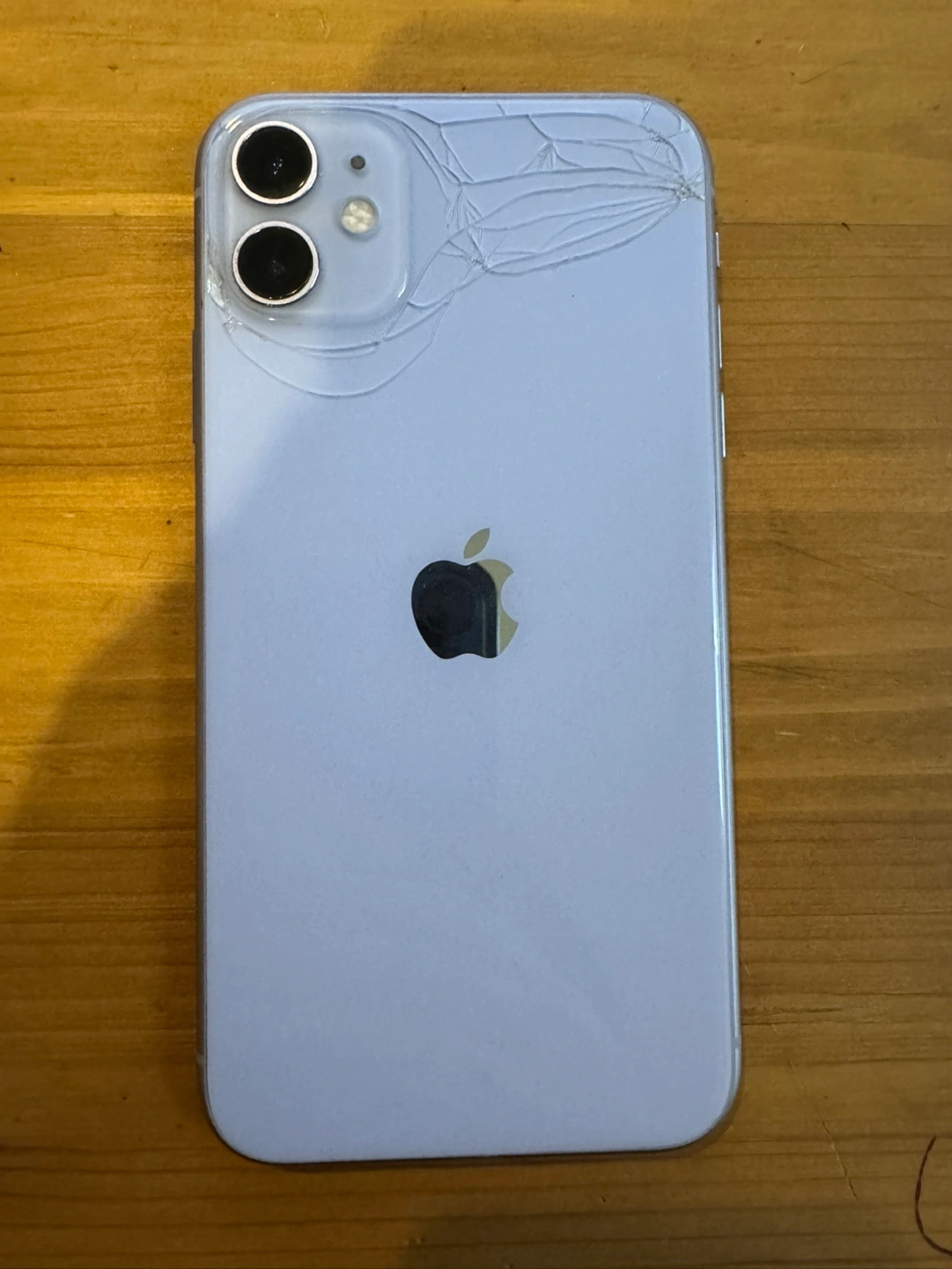 Used iPhone 11. Purple color. Cracked back and front screen has two hair like cracks as seen in photo. No problem with camera and software works fine.