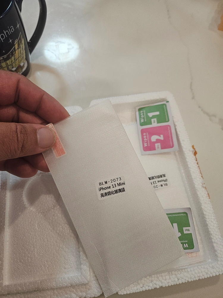 273 Screen protector for iPhone 13 Mini. Includes wet wipes and dry wipes.
