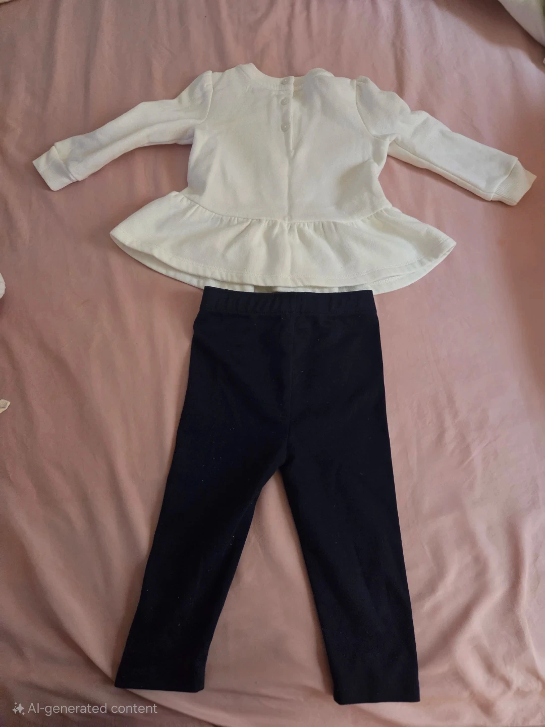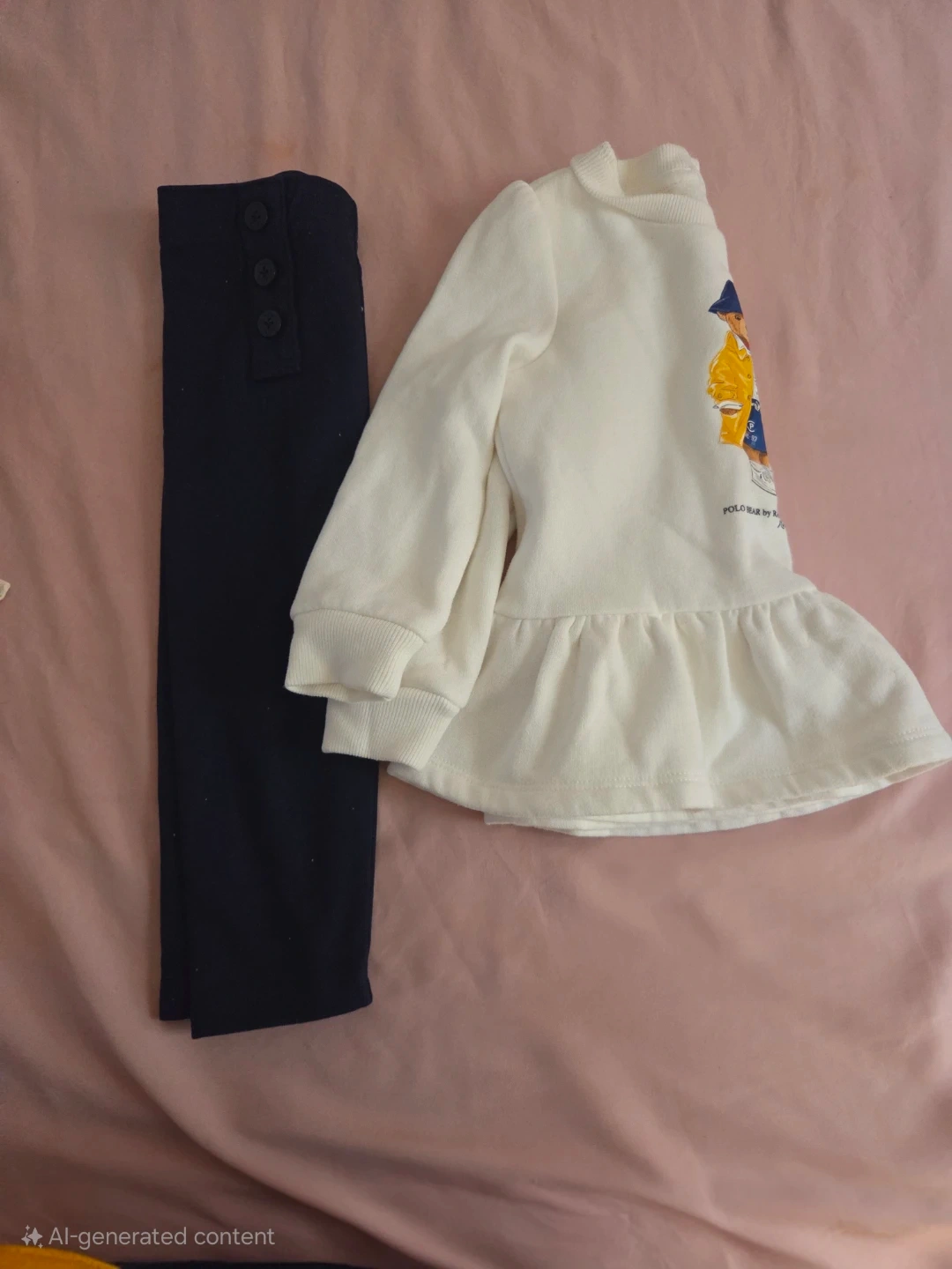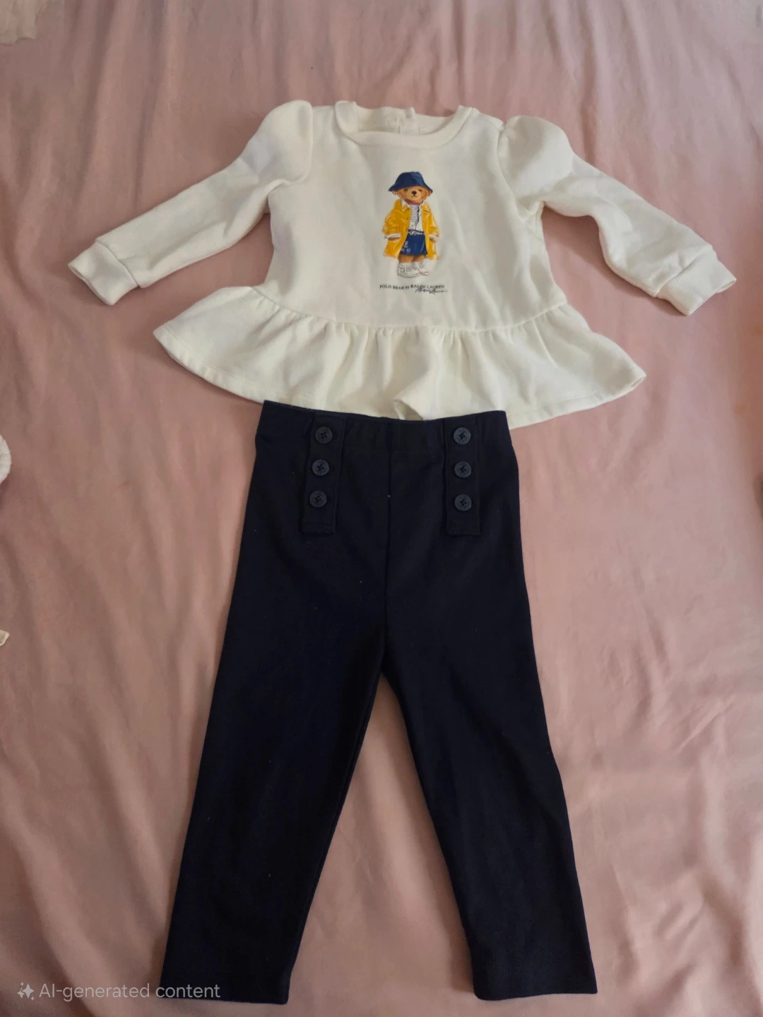 White long-sleeve peplum top with a graphic bear print. Navy pants with decorative buttons. Cotton blend material. Perfect for play dates or casual wear!