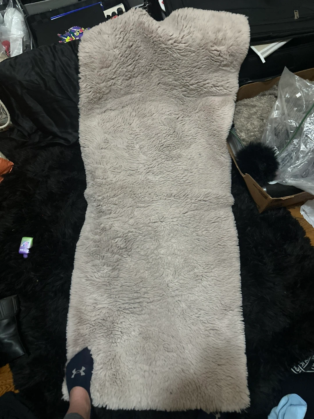 Selling a fuzzy rug. It has a light grey color and a soft texture. Perfect for adding a cozy touch to any room u can’t tell in the picture but it mauve pink