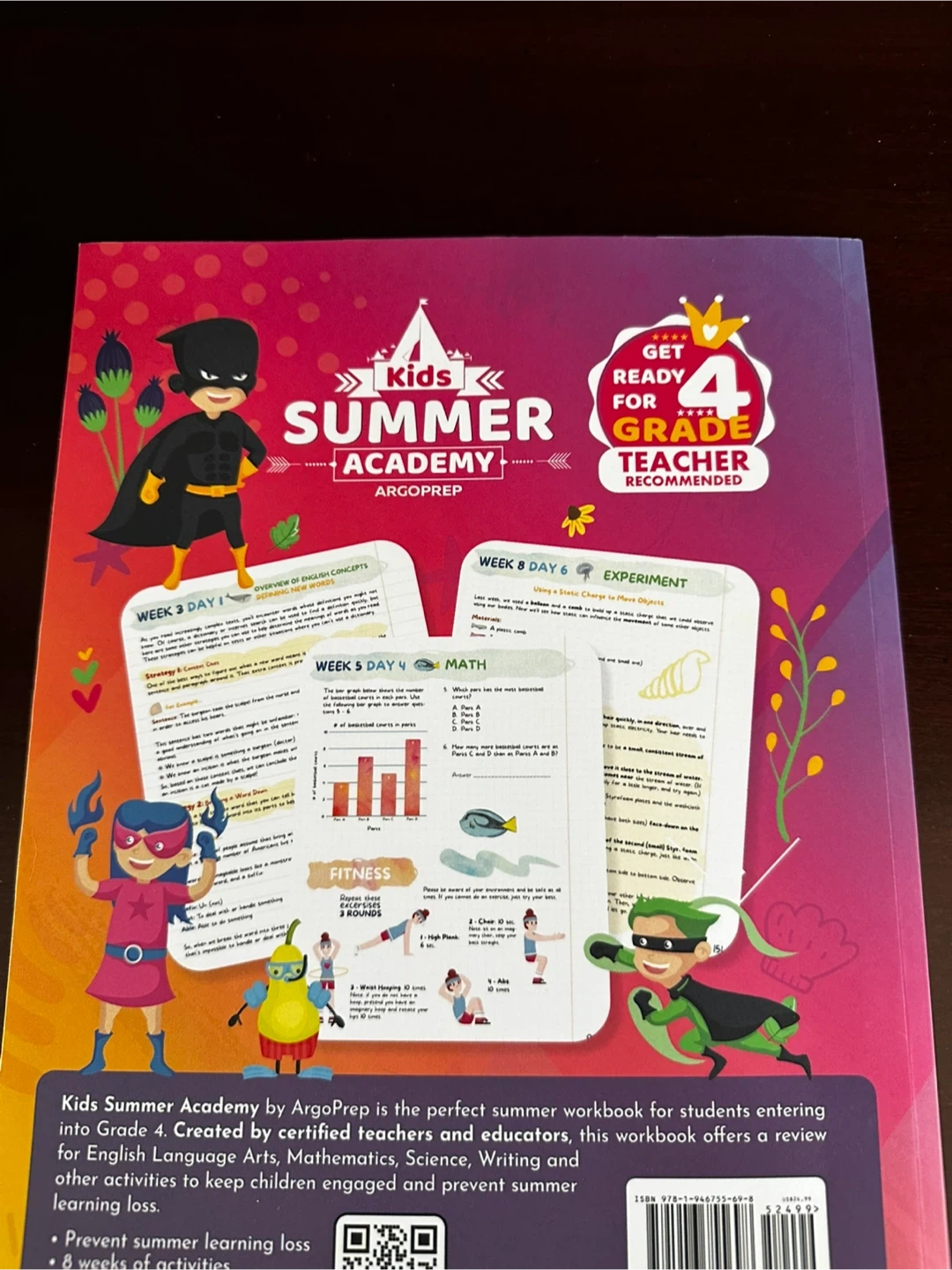 This workbook is for students entering Grade 4, offering a review for English, Math, Science, Writing, and other activities. It's designed to keep kids engaged and prevent summer learning loss with 8 weeks of material. Includes mathematics, experiments, mazes, puzzles, and fitness activities.