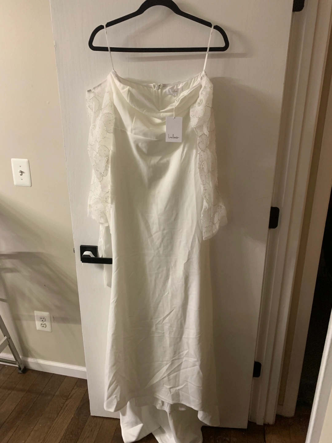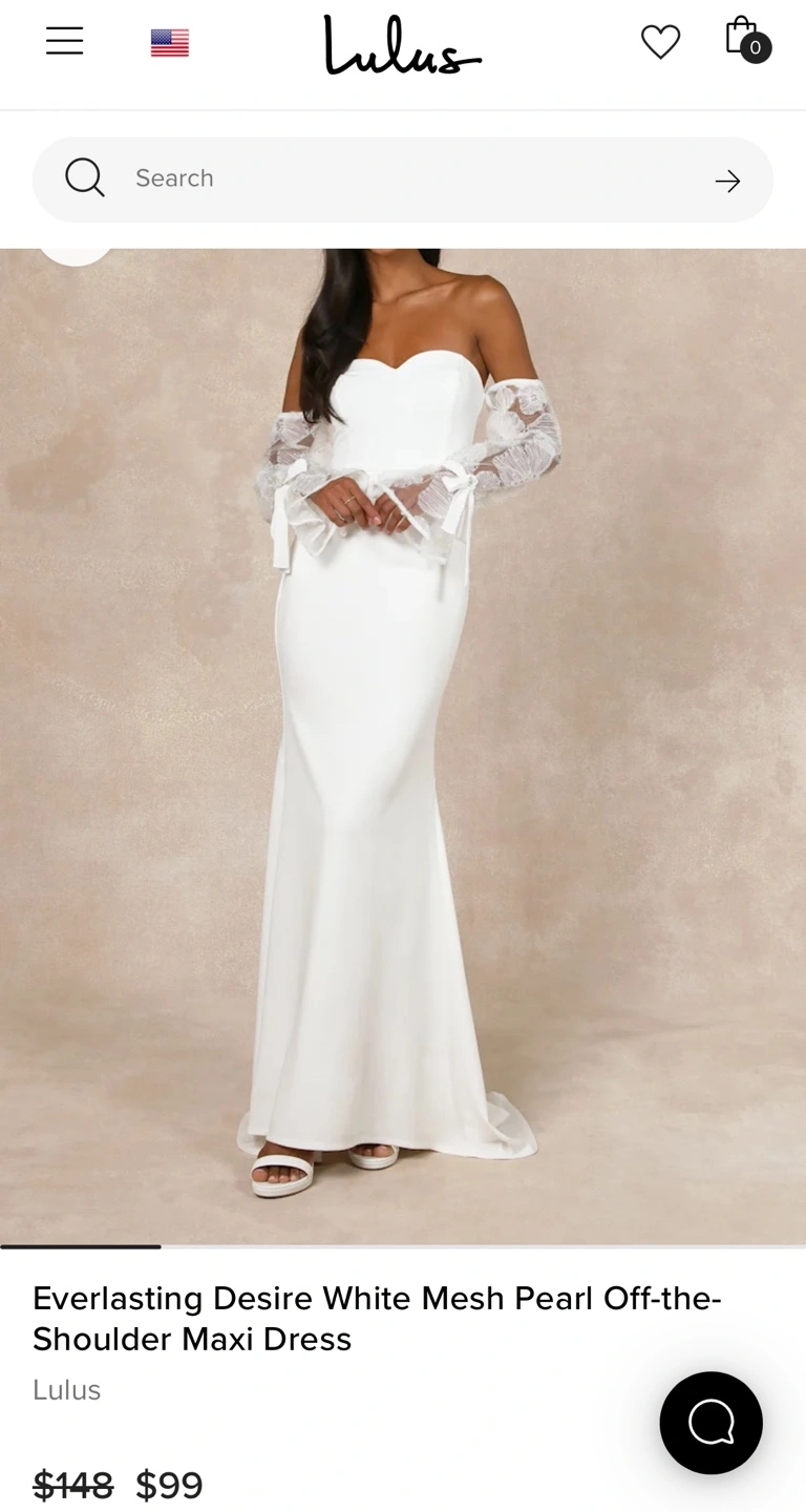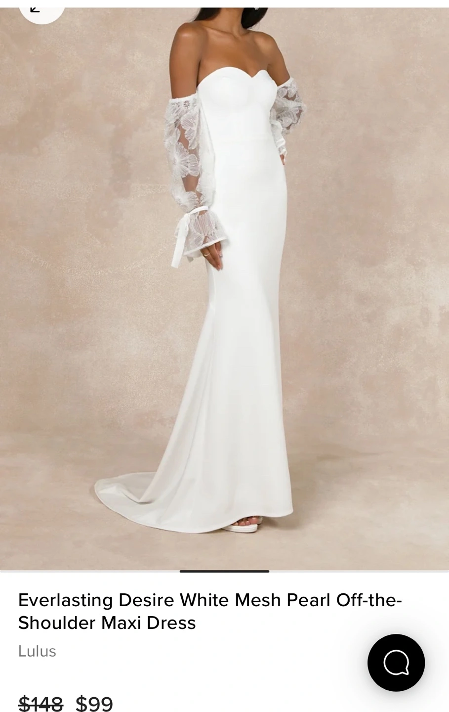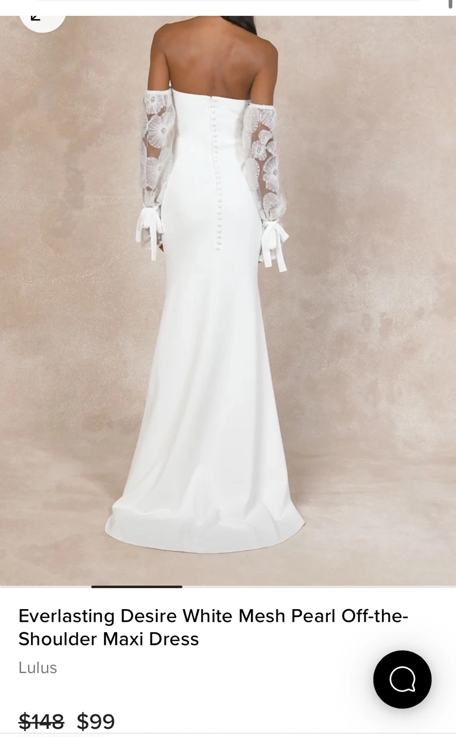 Beautiful white maxi dress. Off-the-shoulder neckline. Mesh pearl sleeves. Fitted bodice and flowing skirt.