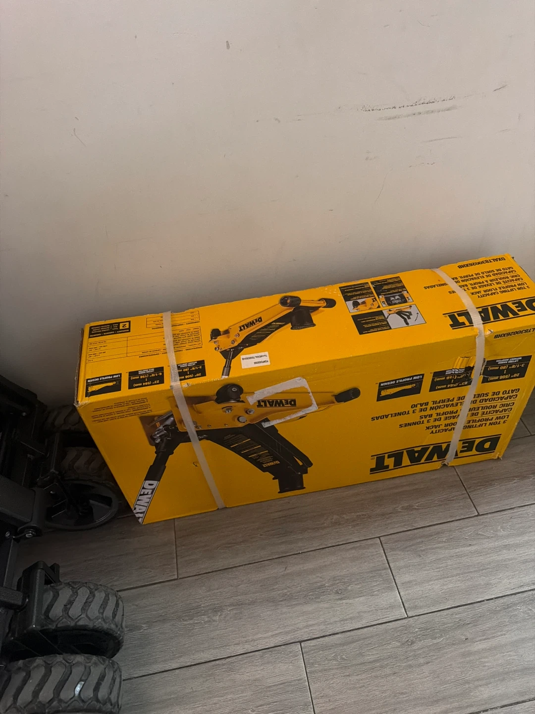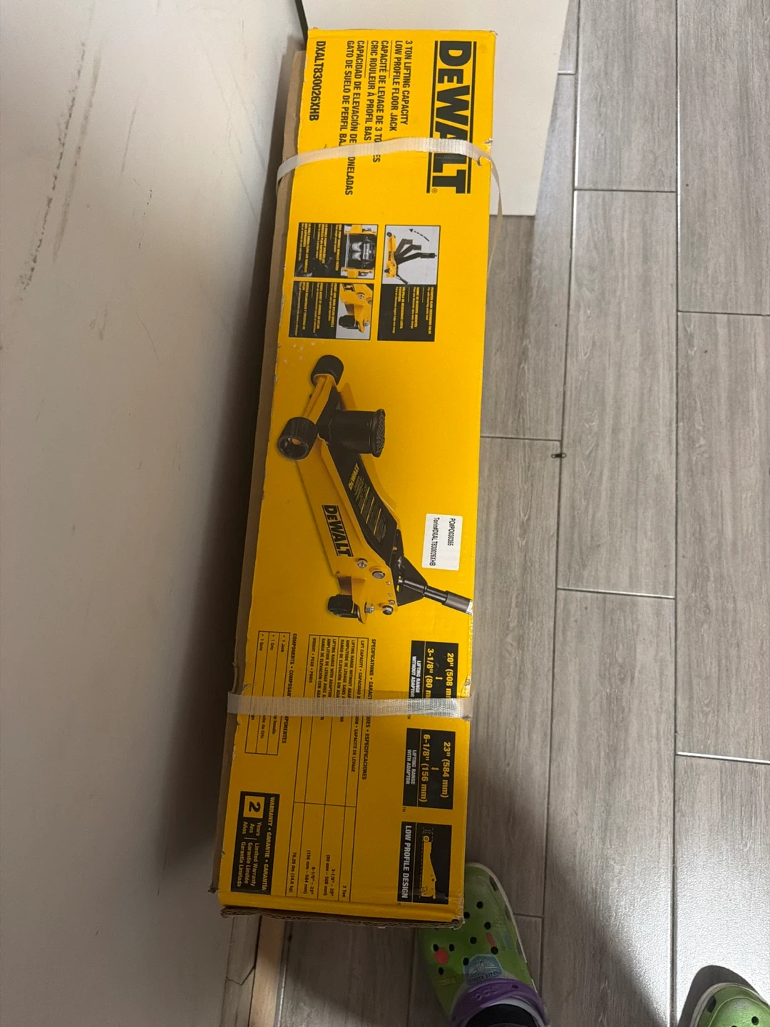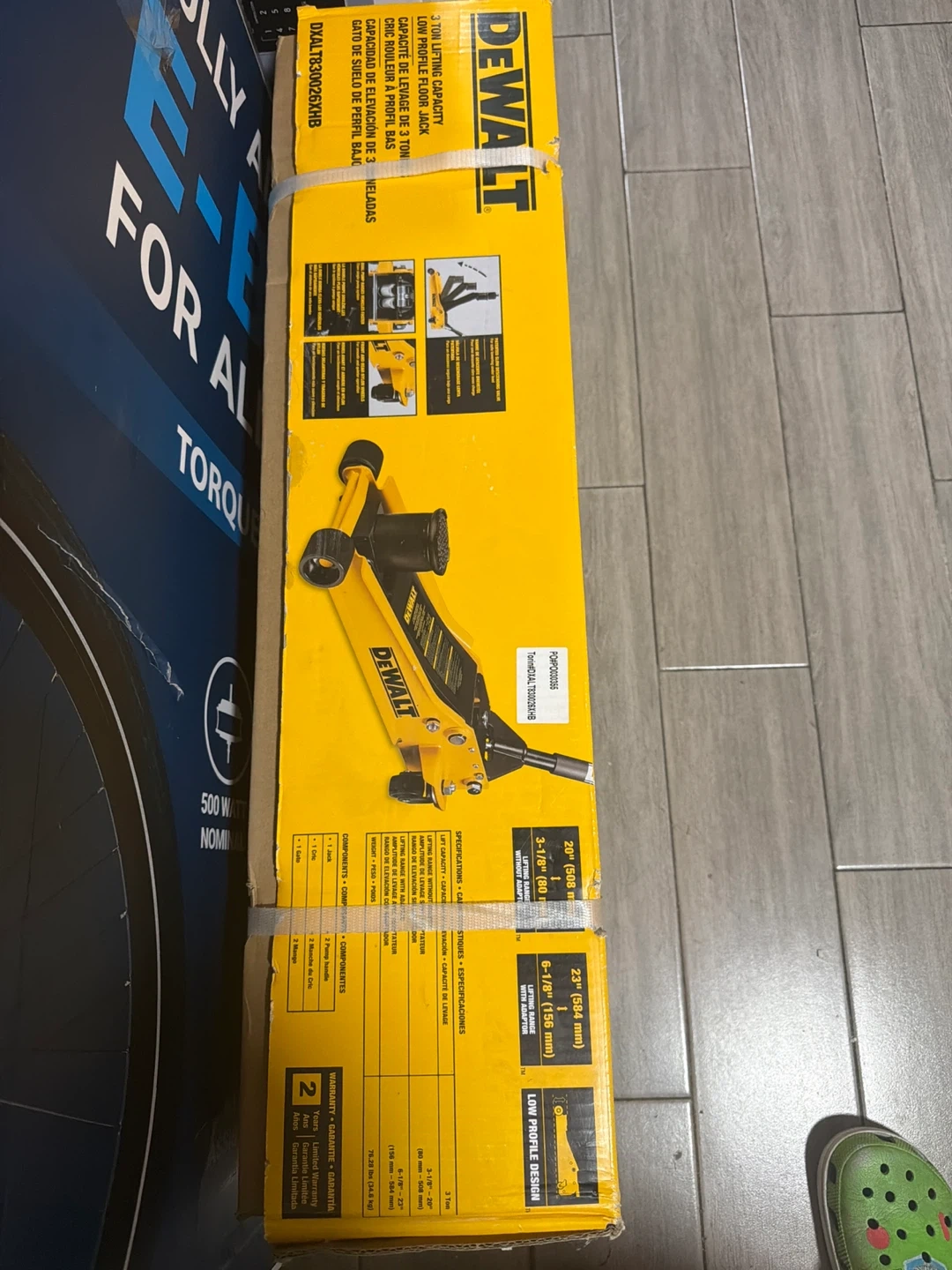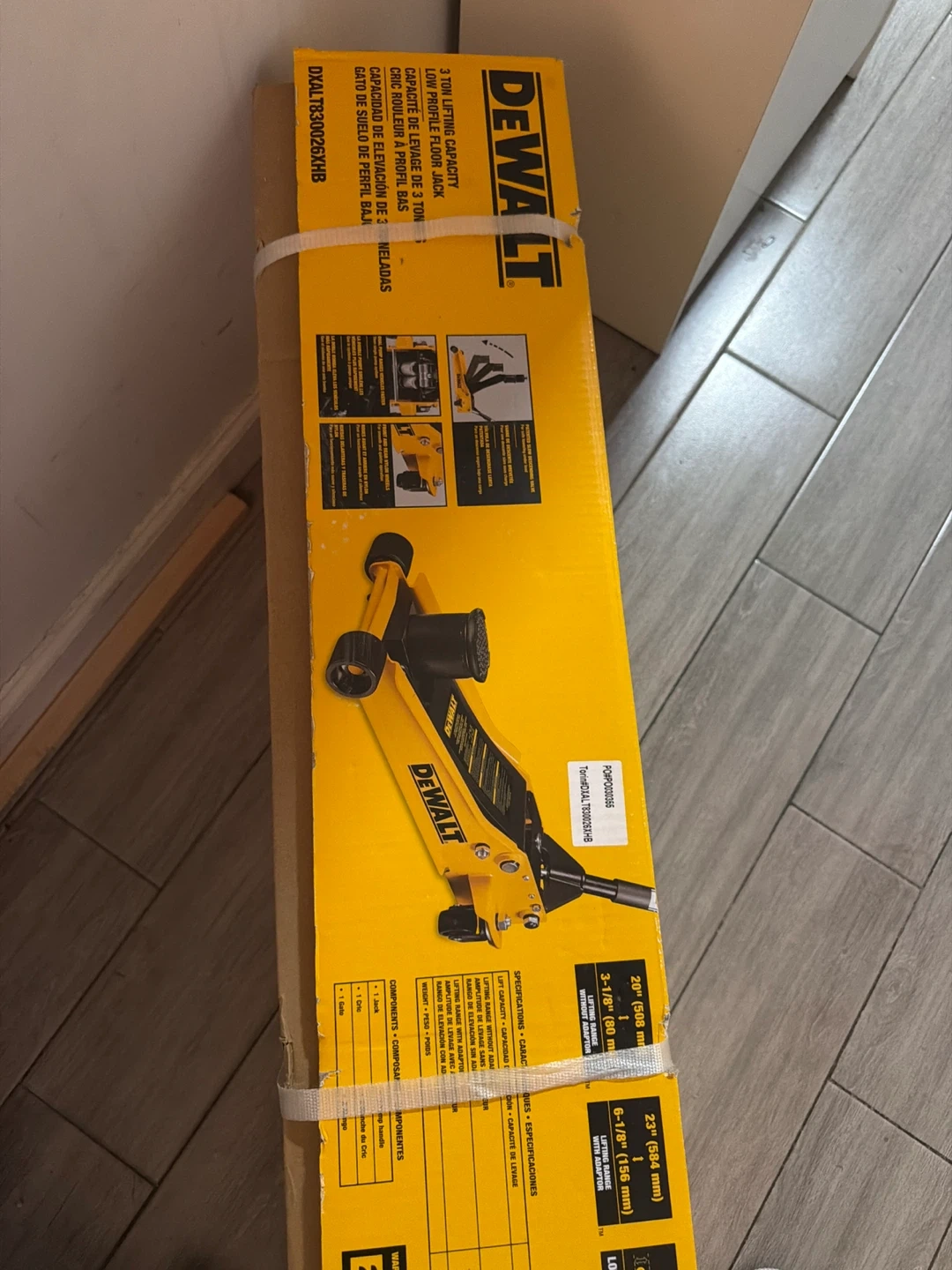 Brand new DeWalt 3 ton low profile floor jack. It's designed for quick lifting with a minimum height of 3-7/8" and a maximum height of 23". Comes with a durable construction for heavy-duty use.