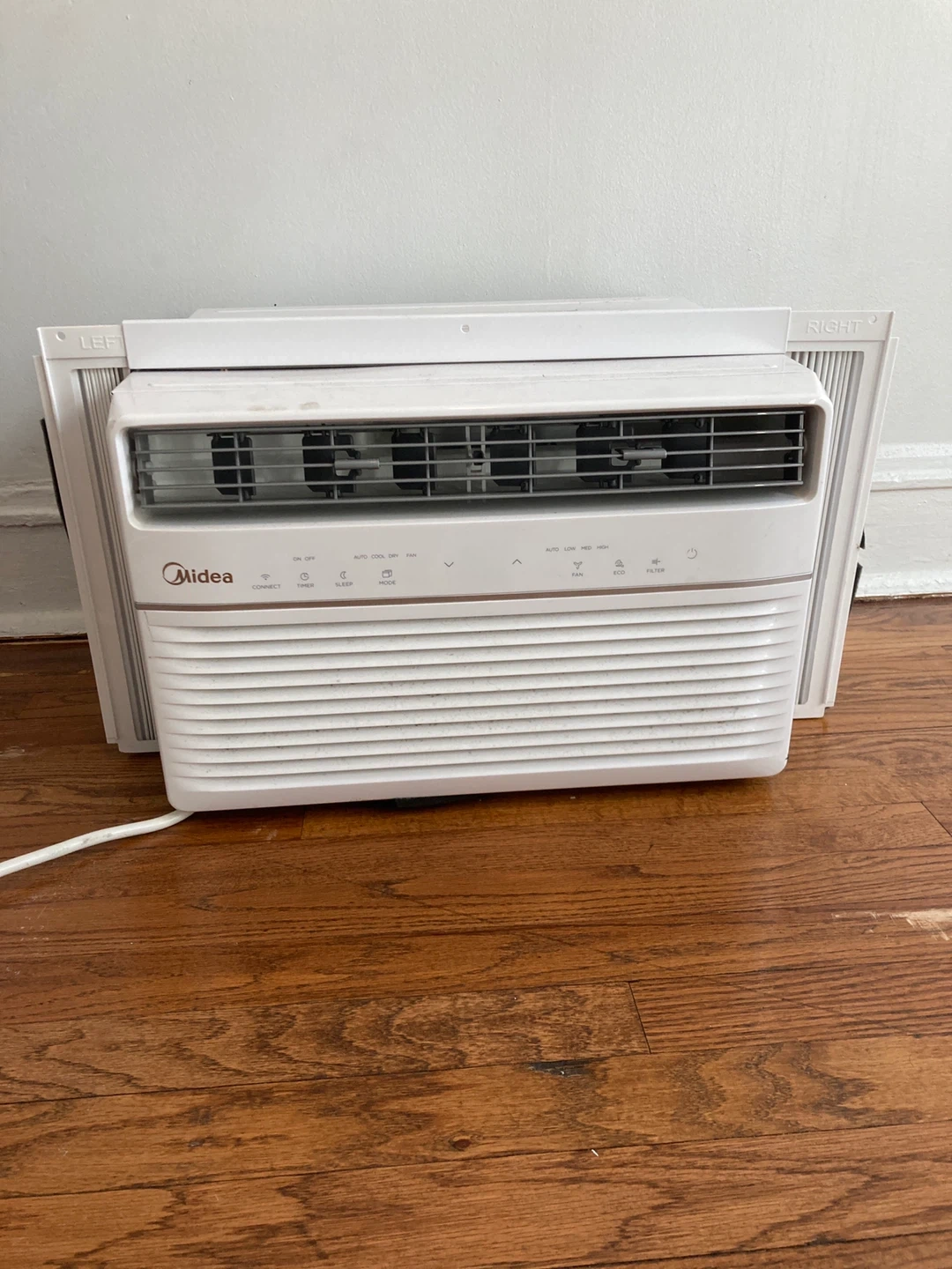 Midea window air conditioner. Features auto, cool, dry, and fan modes. Includes timer and sleep functions. The unit has multiple fan speeds: auto, low, med, and high. Works geeat used for 4 months