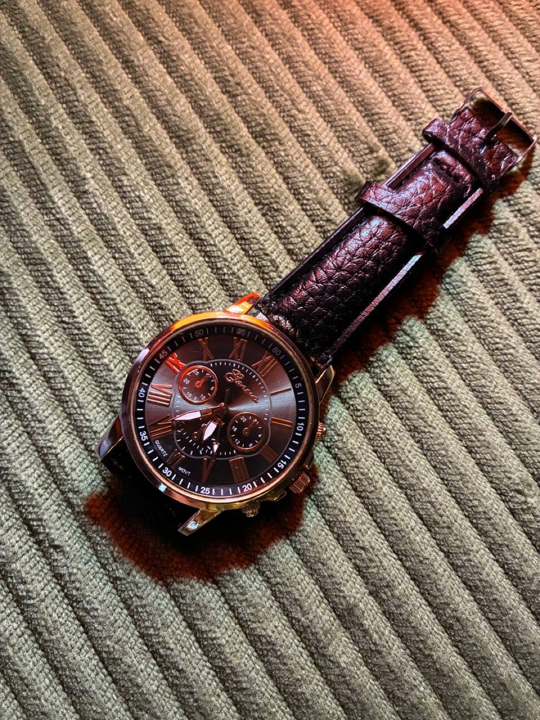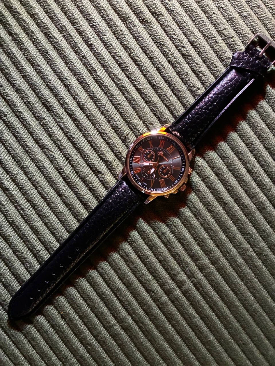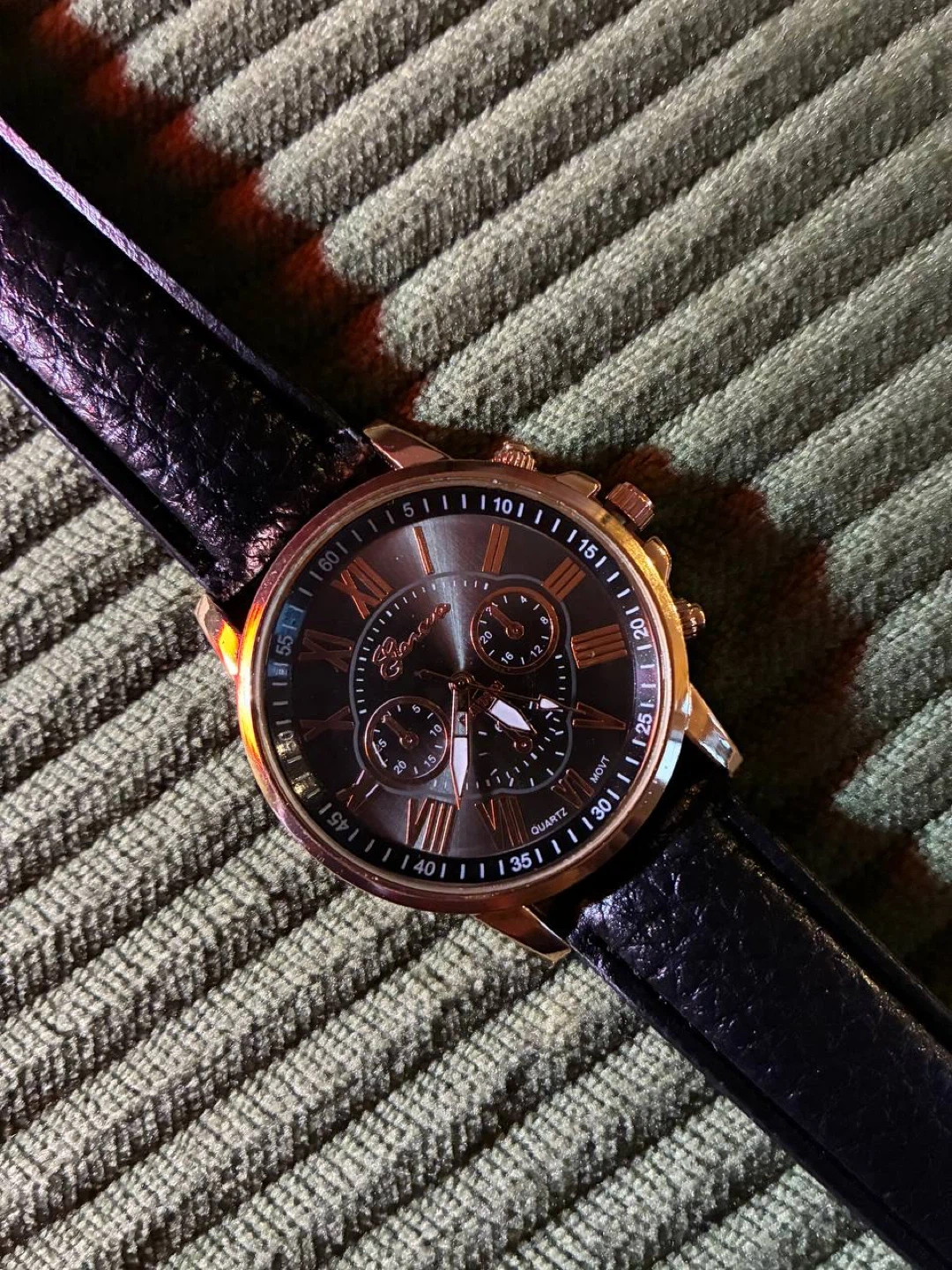 This is a Geneva quartz chronograph watch. It features a black leather band and a rose gold-tone case. The watch has Roman numerals on its dial and three subdials.