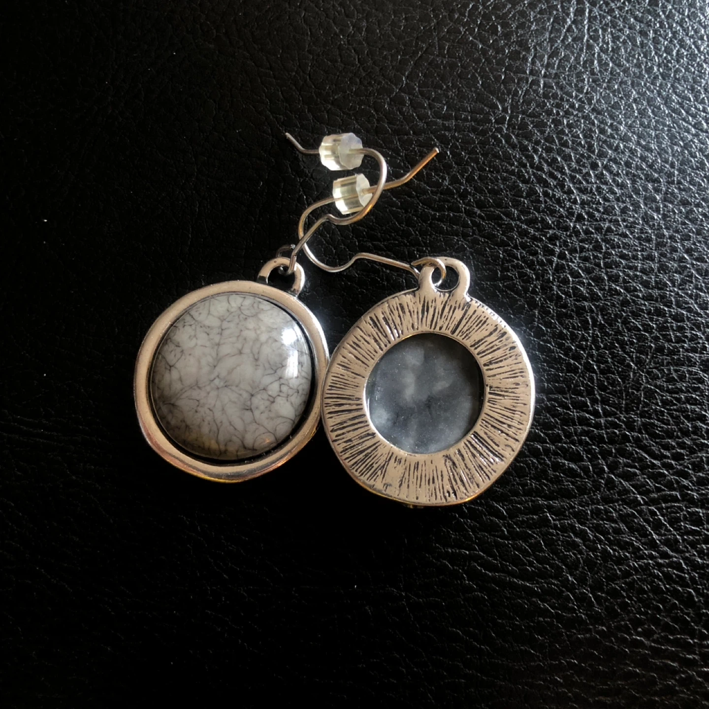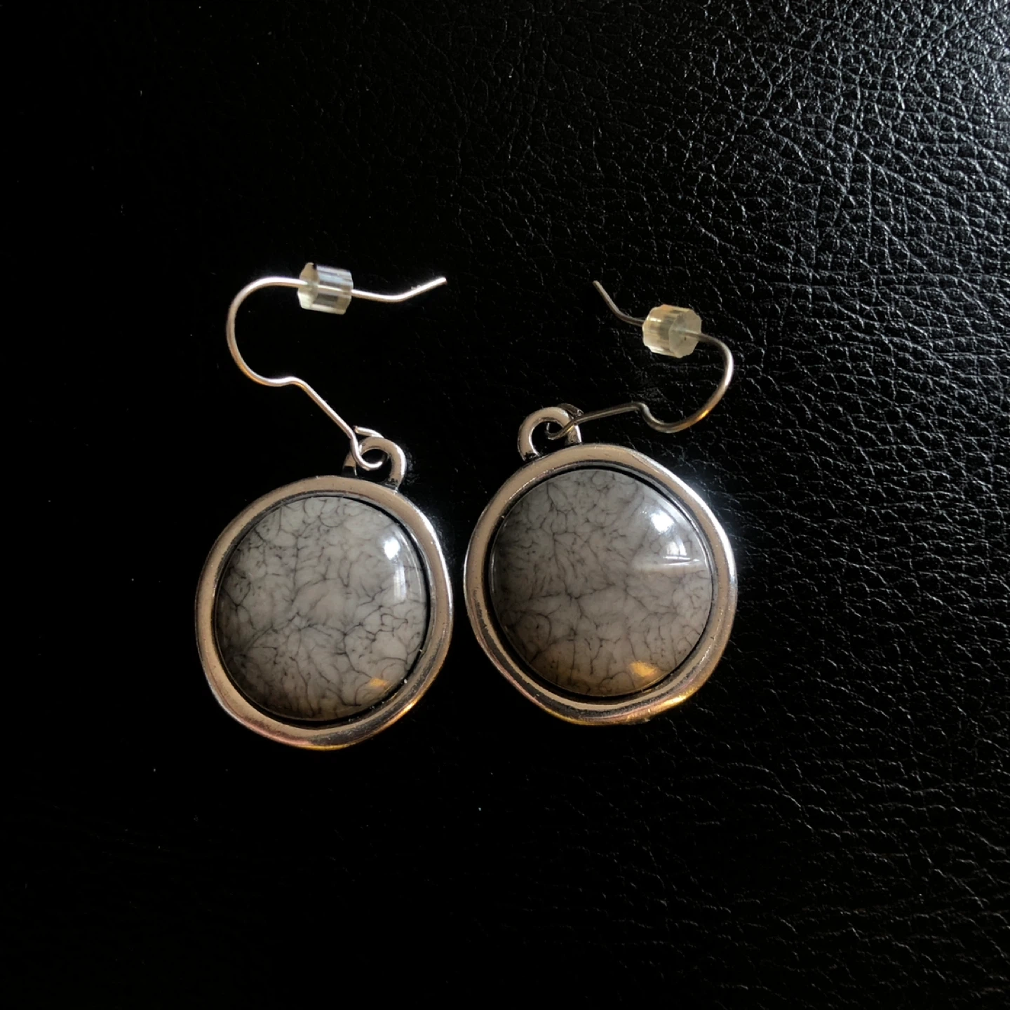 These round pendant earrings feature a silver-tone setting with a unique stone inlay. The inlay has a marbled grey and white pattern. They hang from silver-tone fishhook closures.