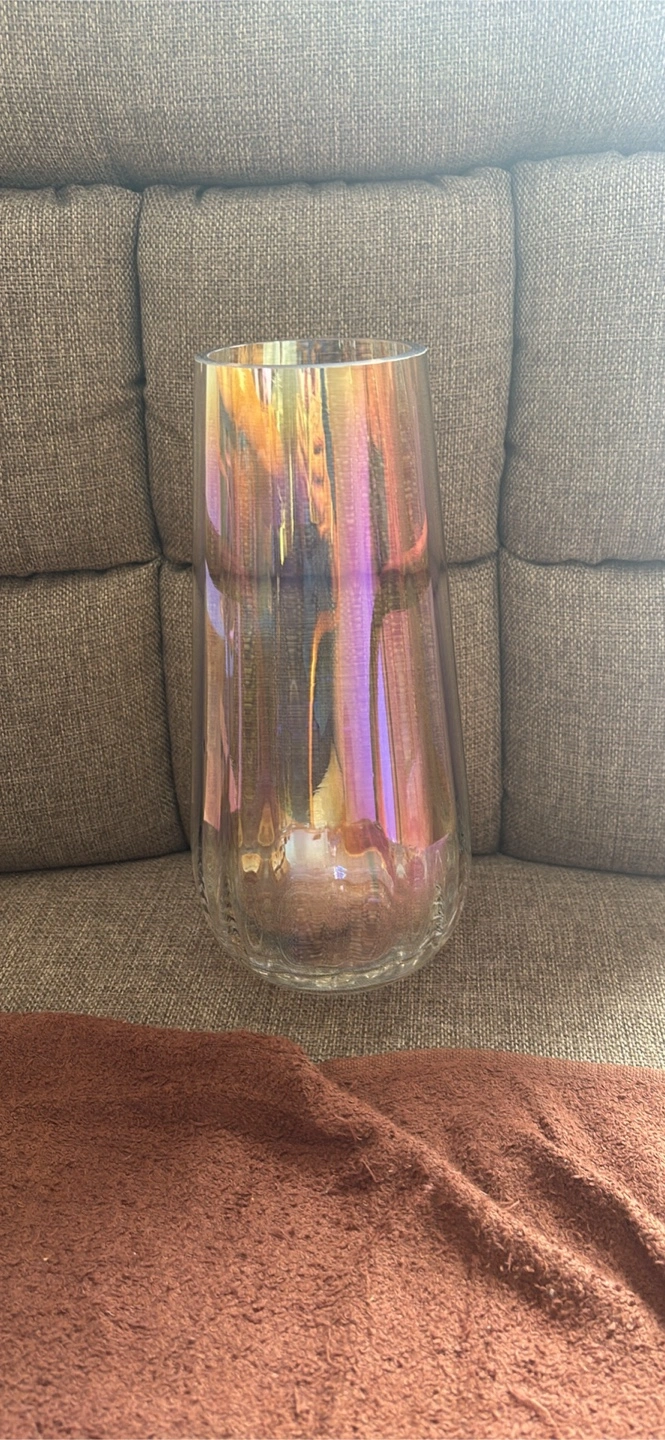 This vase features a unique iridescent finish. The shape of the vase is rounded with a tapered top. It would make a beautiful addition to any home when filled with flowers, or used on its own.we can do porch pickup near 60th and Narragansett by midway airport