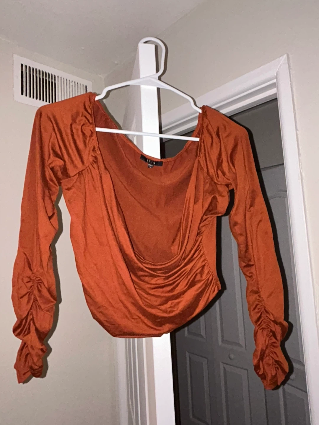 Here's a cute orange long sleeve top from Iris! It features a ruched design on the front and sleeves. Perfect for a night out or a casual day.
