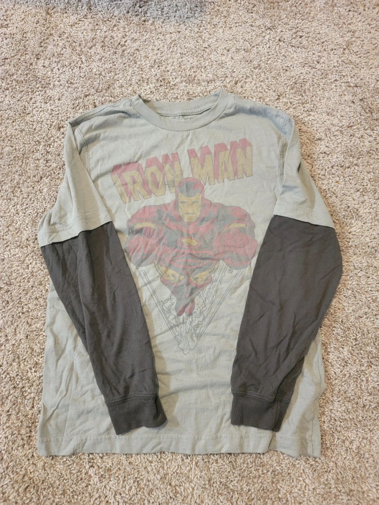 Here's a long-sleeve Iron Man shirt! It features a cool design of Iron Man on the front. The sleeves are a contrasting color, adding a bit of style to the shirt. Size 12-14
