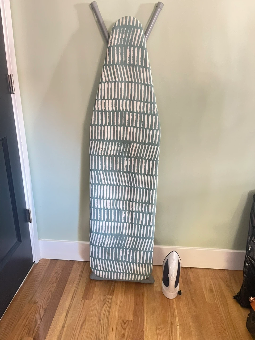 60Here's an ironing board with a patterned cover. It's in good condition and ready to help you get those wrinkles out!