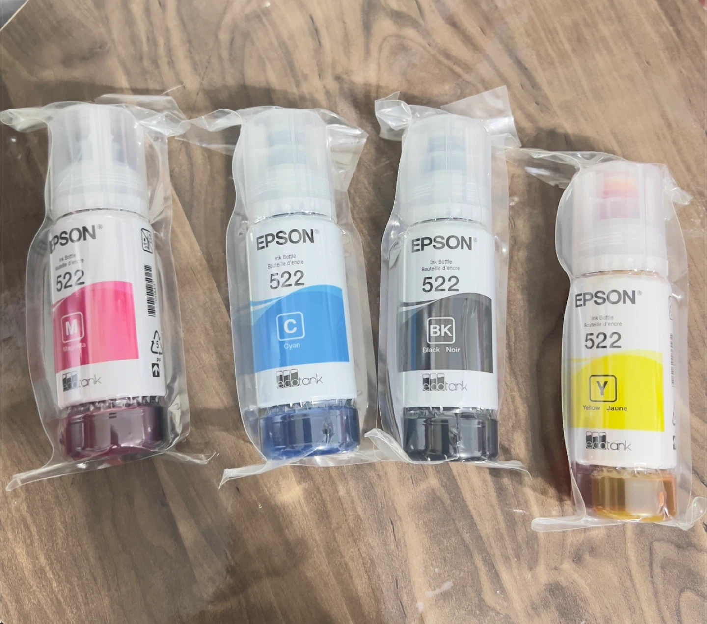 Set of four Epson EcoTank 522 ink bottles. Includes Magenta, Cyan, Black, and Yellow. Ink bottles are sealed 65ml. These are replacement ink bottles for Epson EcoTanks.