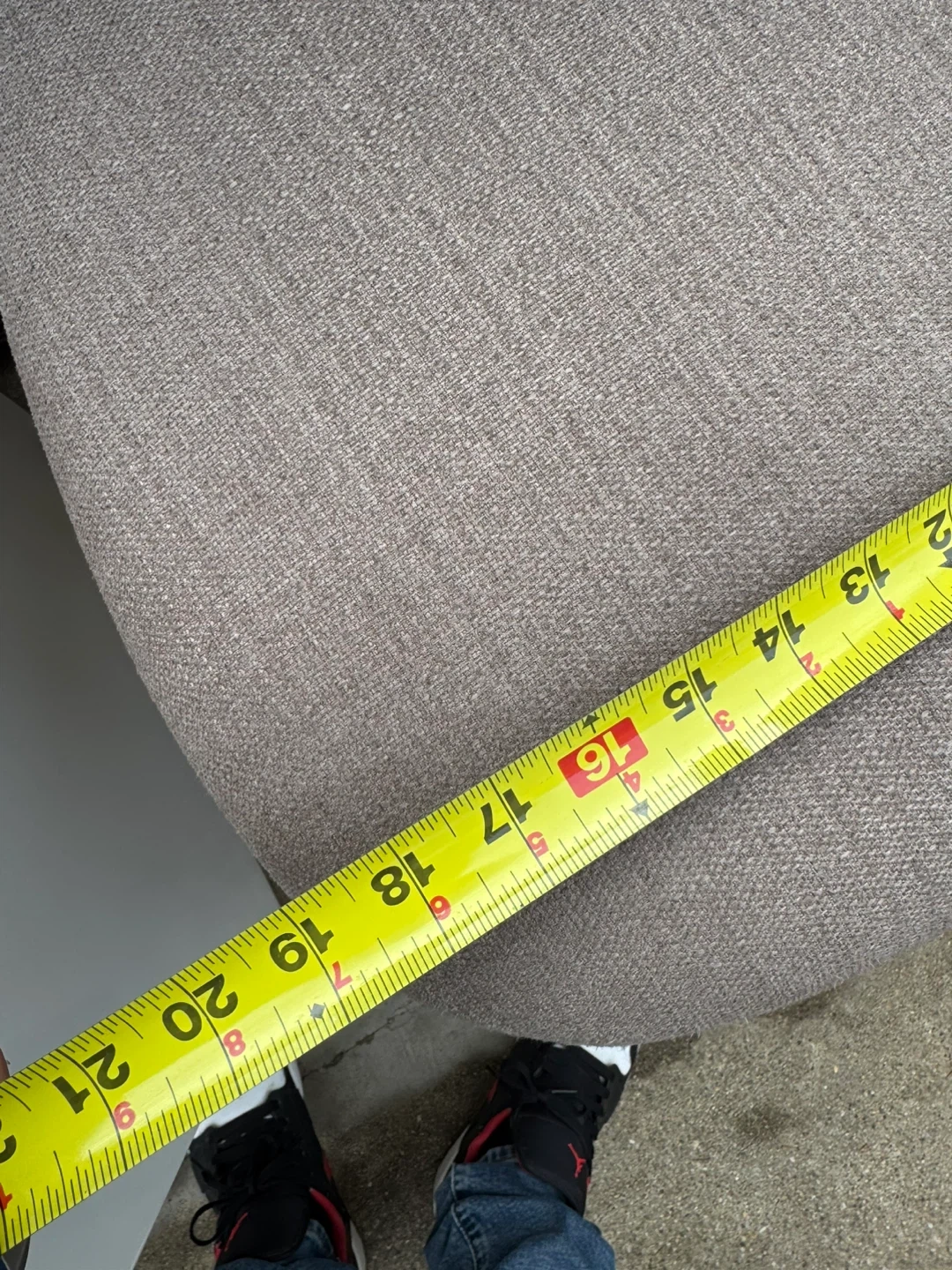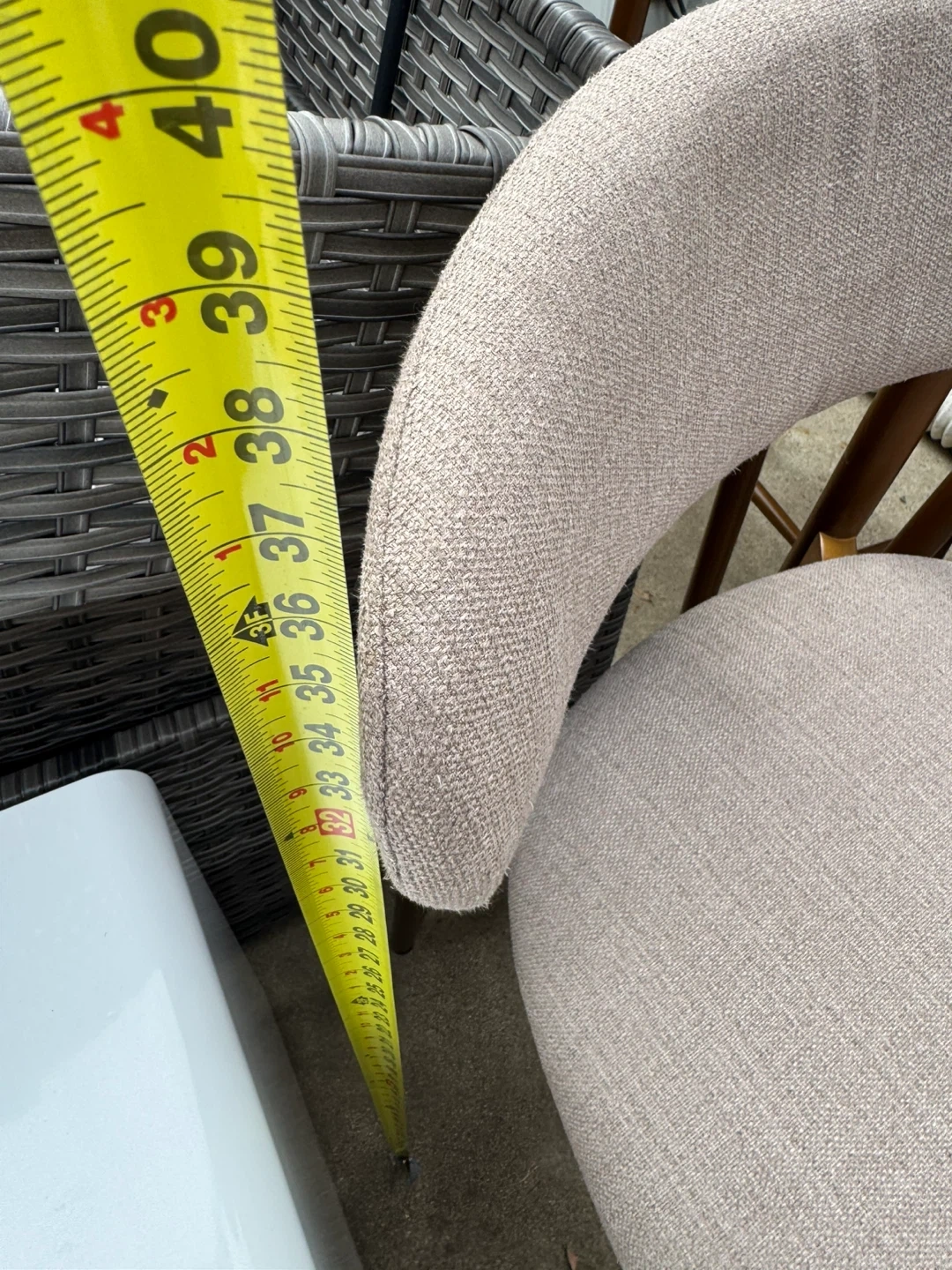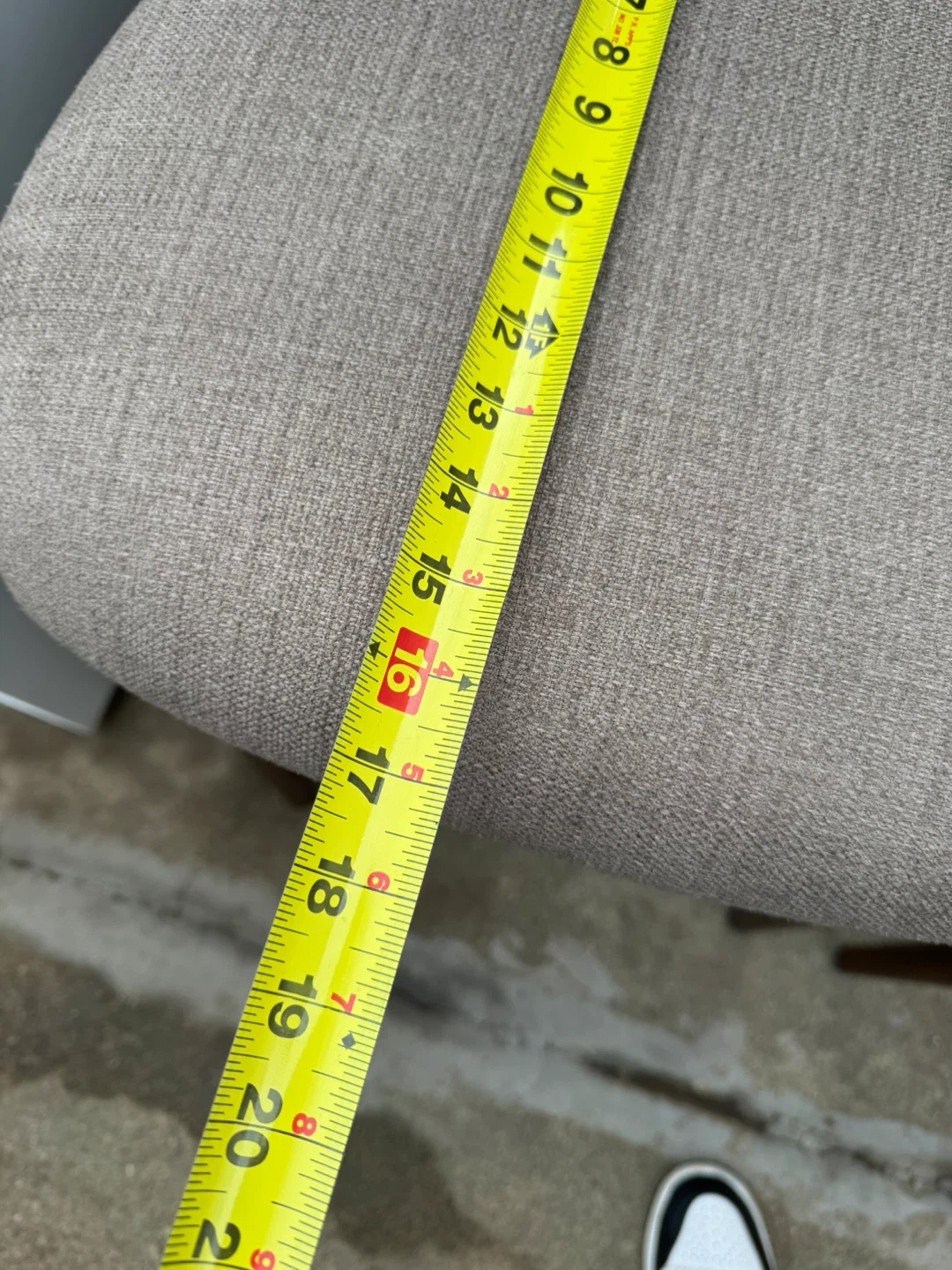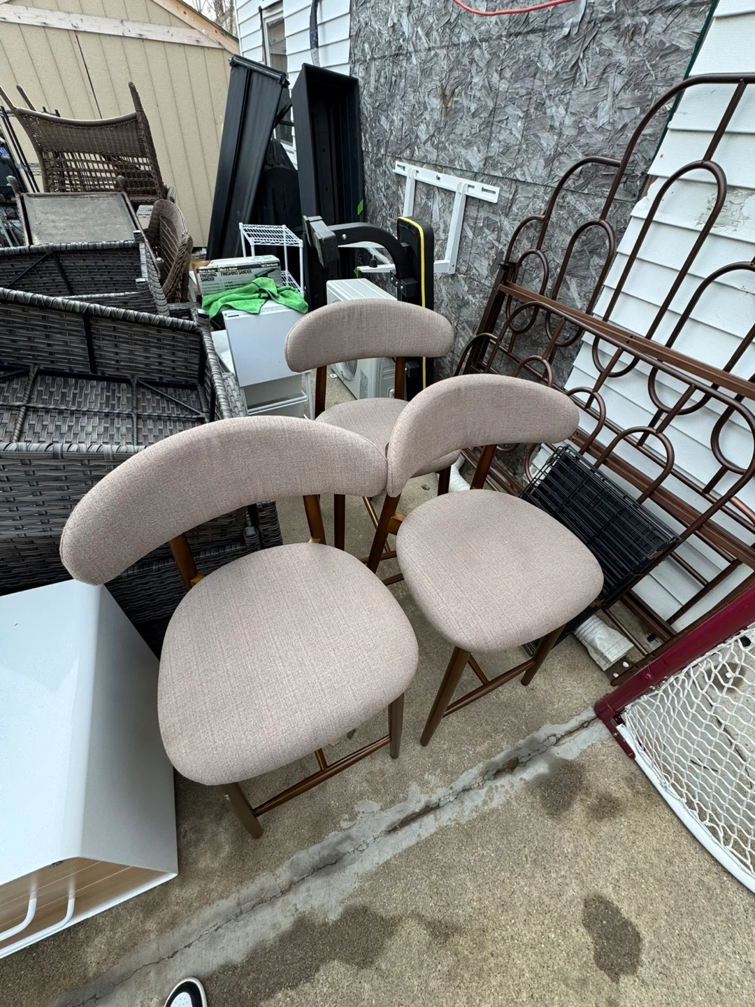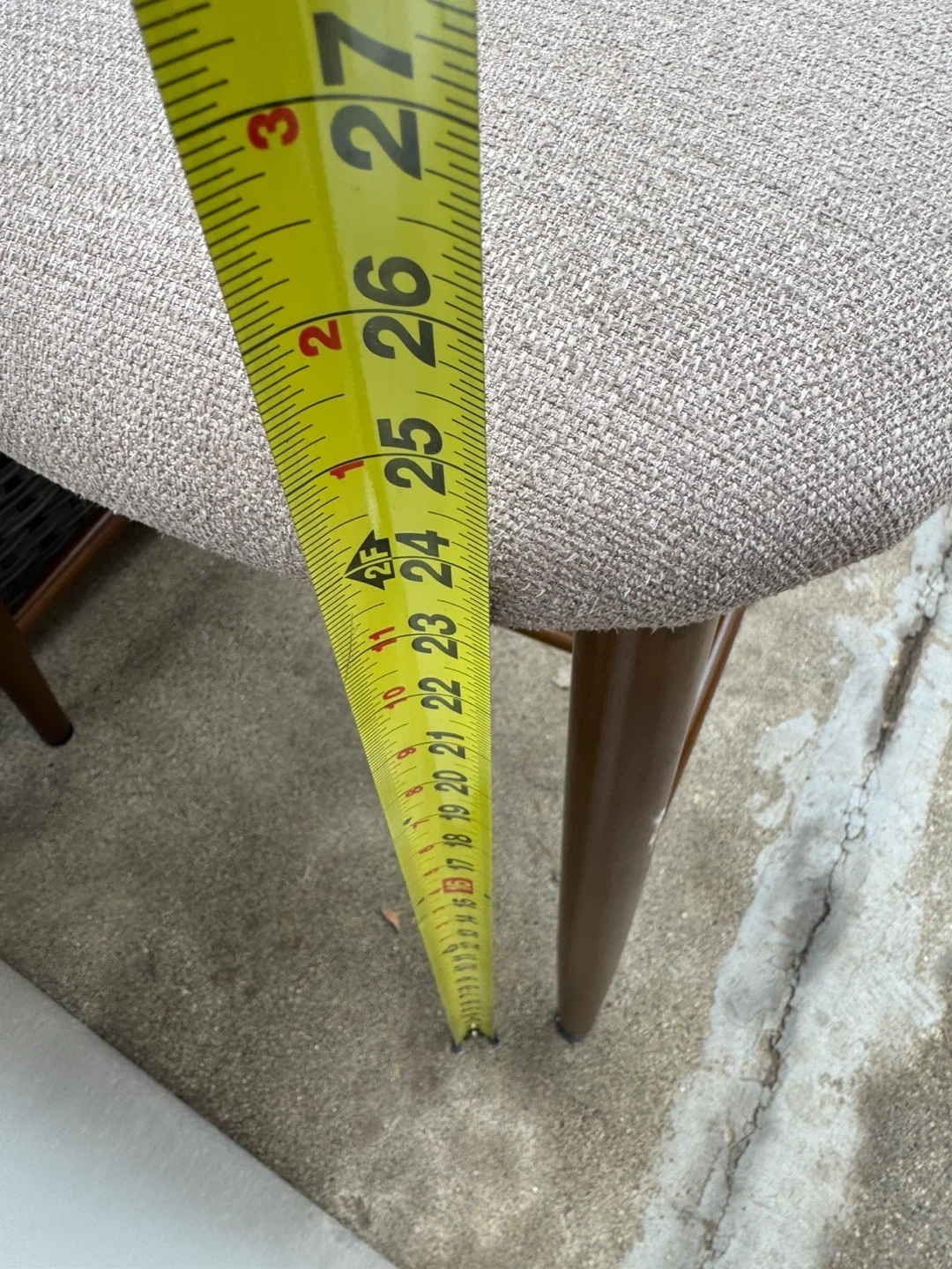 These three bar stools feature light tan fabric upholstery and wooden legs. They're comfortable and stylish additions to any kitchen or bar area. Seat depth is approximately 16 inches.