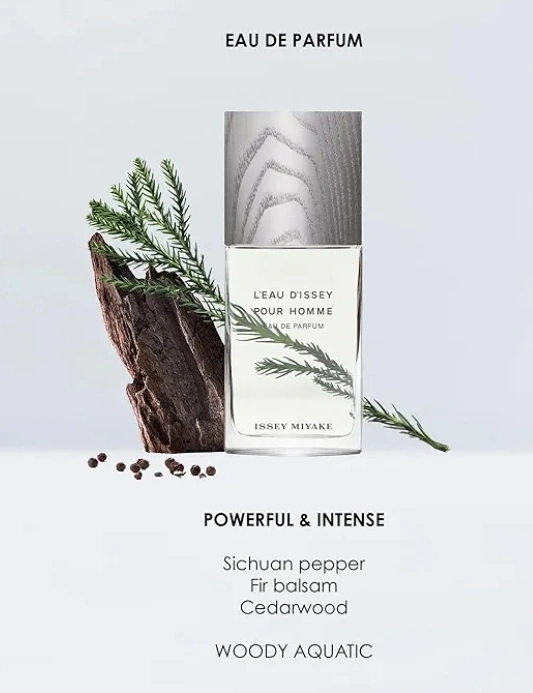 Selling a bottle of Issey Miyake L'Eau d'Issey Pour Homme Eau de Parfum. It's a 4.2 fl oz (125ml) bottle. The scent is described as woody aquatic, with notes of Sichuan pepper, fir balsam, and cedarwood. The bottle comes in its original box