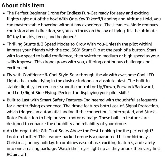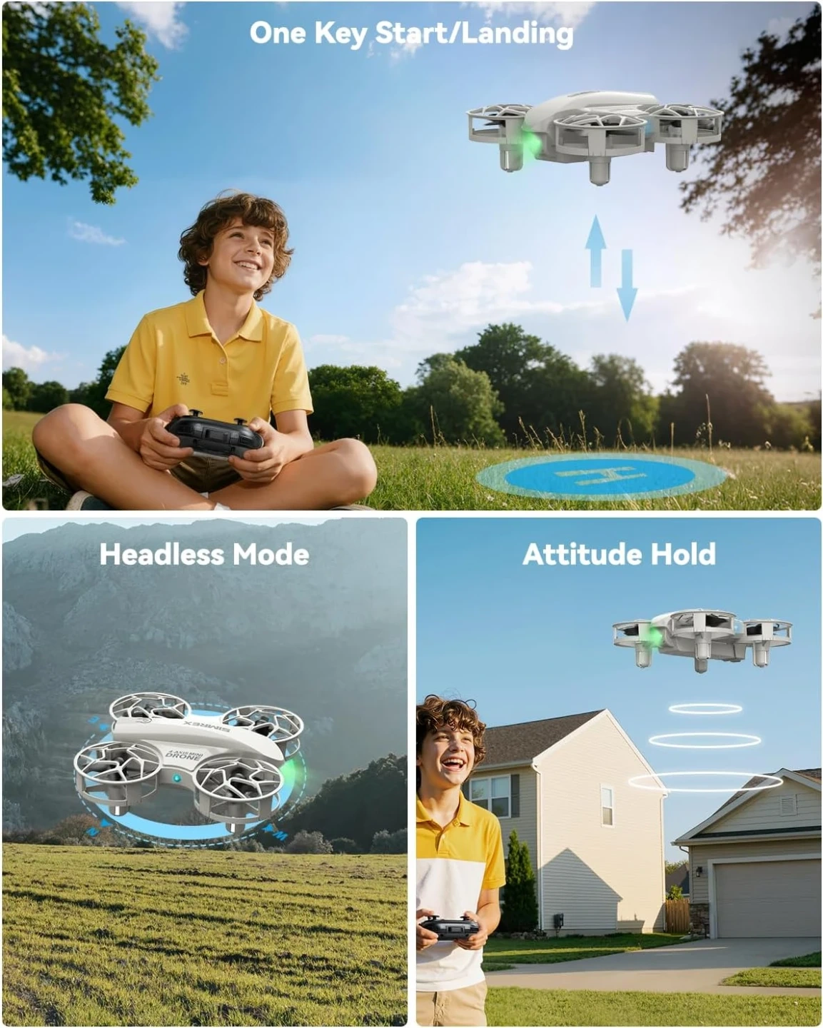 The Perfect Beginner Drone for Endless Fun-Get ready for easy and exciting flights right out of the box! With One-Key Takeoff/Landing and Altitude Hold, you can master stable hovering without any experience. The Headless Mode removes confusion about direction, so you can focus on the joy of flying. It's the ultimate RC toy for kids, teens, and beginners!