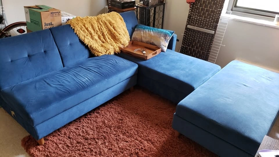 ✓ 4 Piece Teal Blue Sofa set w/ Mustard Yellow blanket (3pcs contain storage)