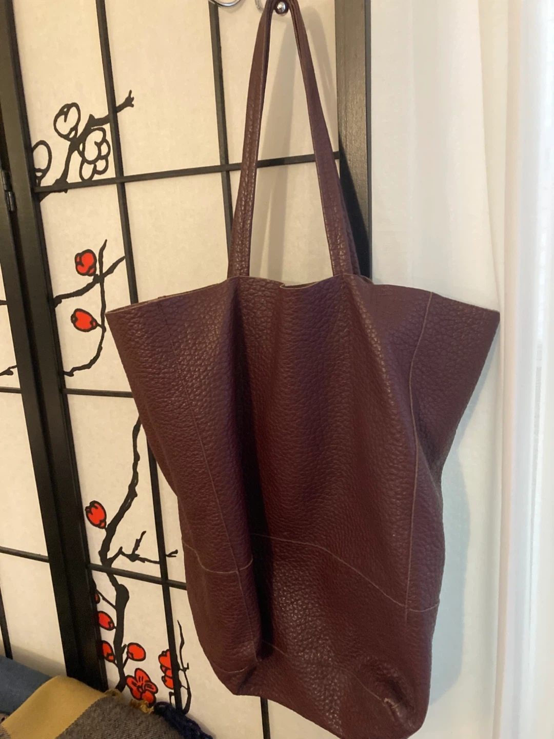 27Here's a large Italian leather tote bag in a beautiful burgundy color. It's an oversized bag perfect for everyday use or travel. The leather has a nice texture and feels great!