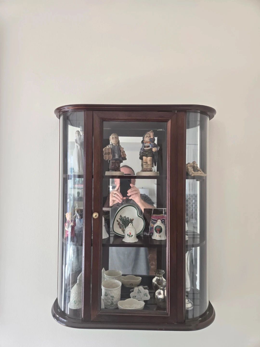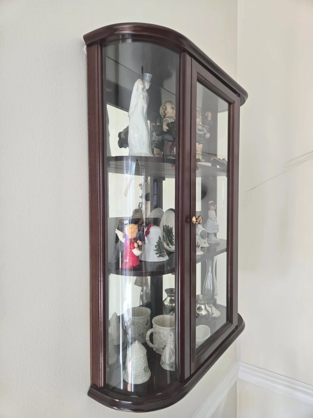 These Bombay Co. wall-mounted curio cabinets feature a rich wood finish and curved glass doors. It's perfect for displaying small collectibles, figurines, or decorative items. Three shelves offer ample space for your treasures. Contents not included. Sold as a pair.