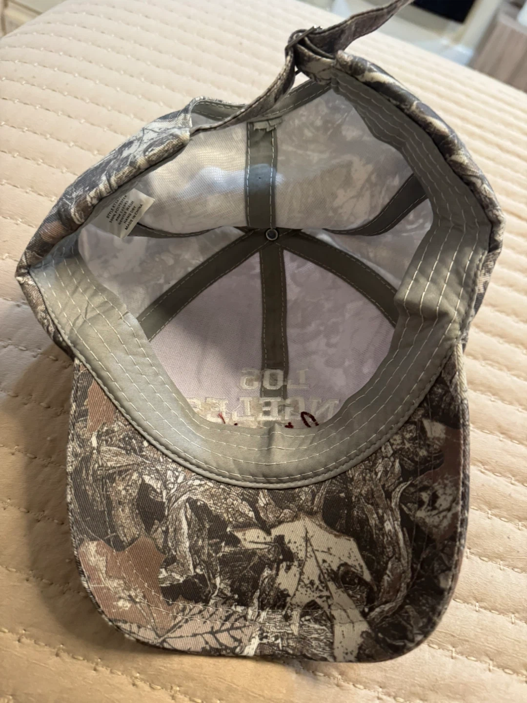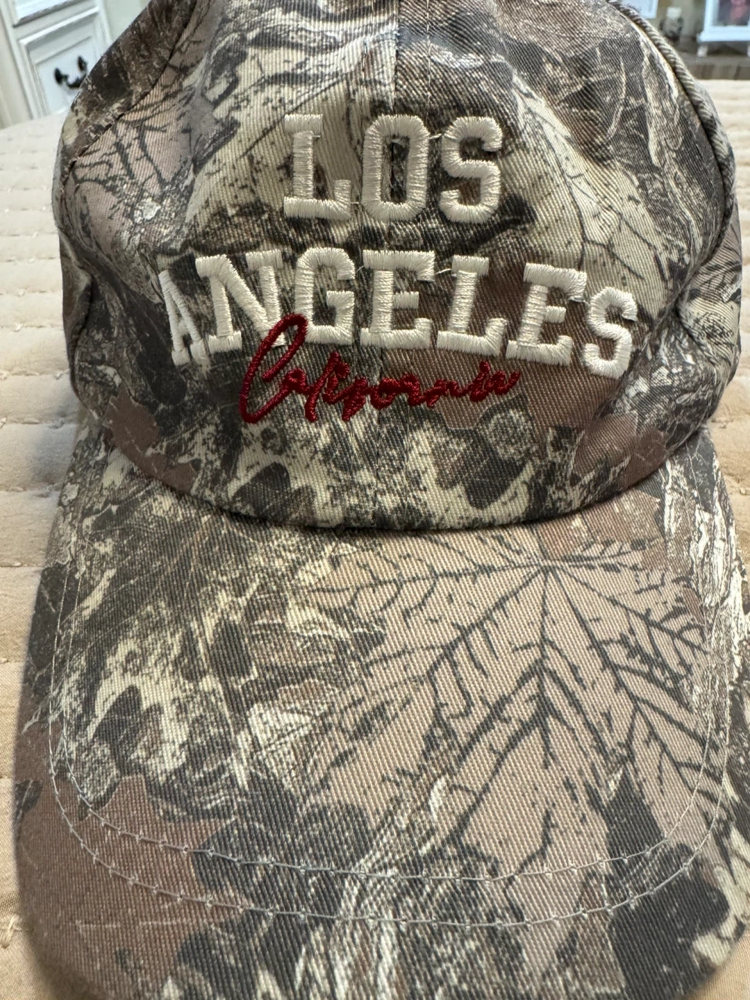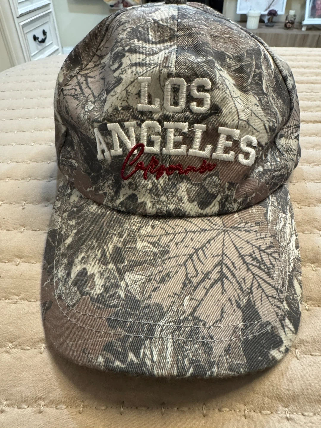 This is a camouflage baseball cap with 'LOS ANGELES California' embroidered on the front. It has an adjustable strap with a metal buckle closure. Great for outdoor activities or casual wear!
