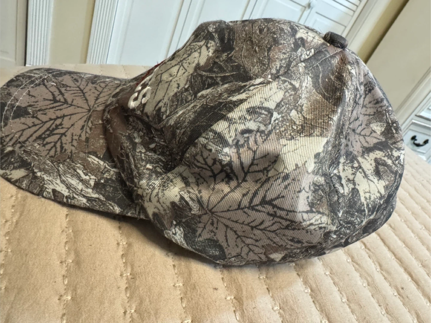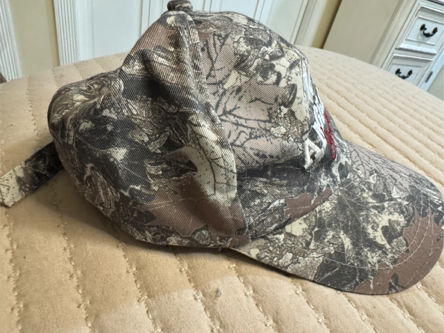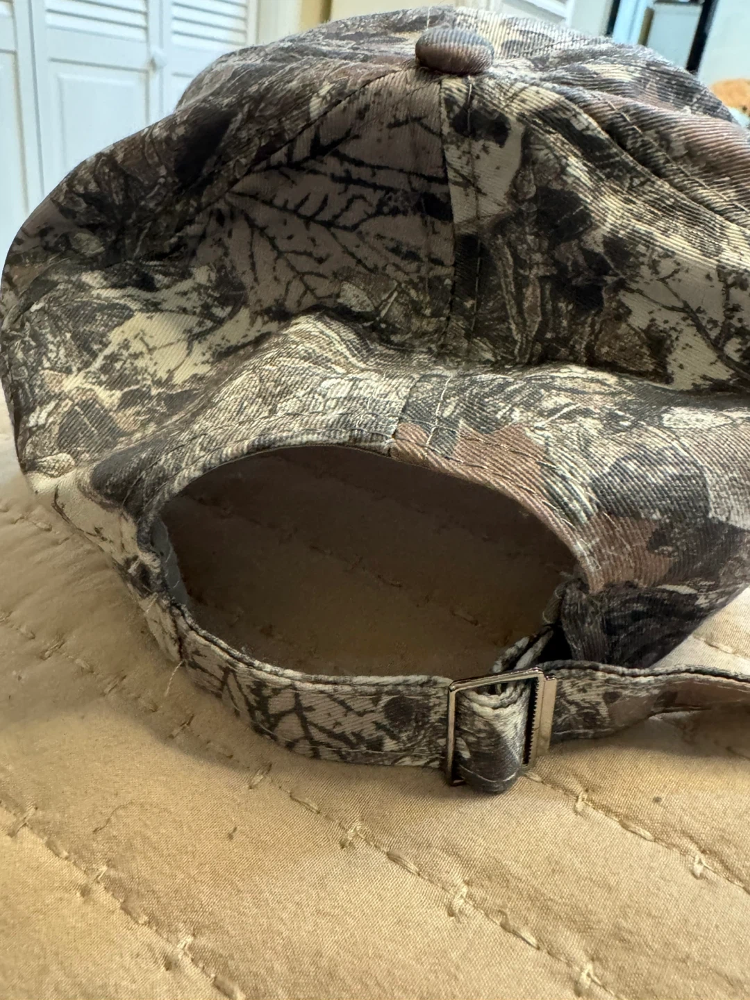 This is a camouflage baseball cap with 'LOS ANGELES California' embroidered on the front. It has an adjustable strap with a metal buckle closure. Great for outdoor activities or casual wear!