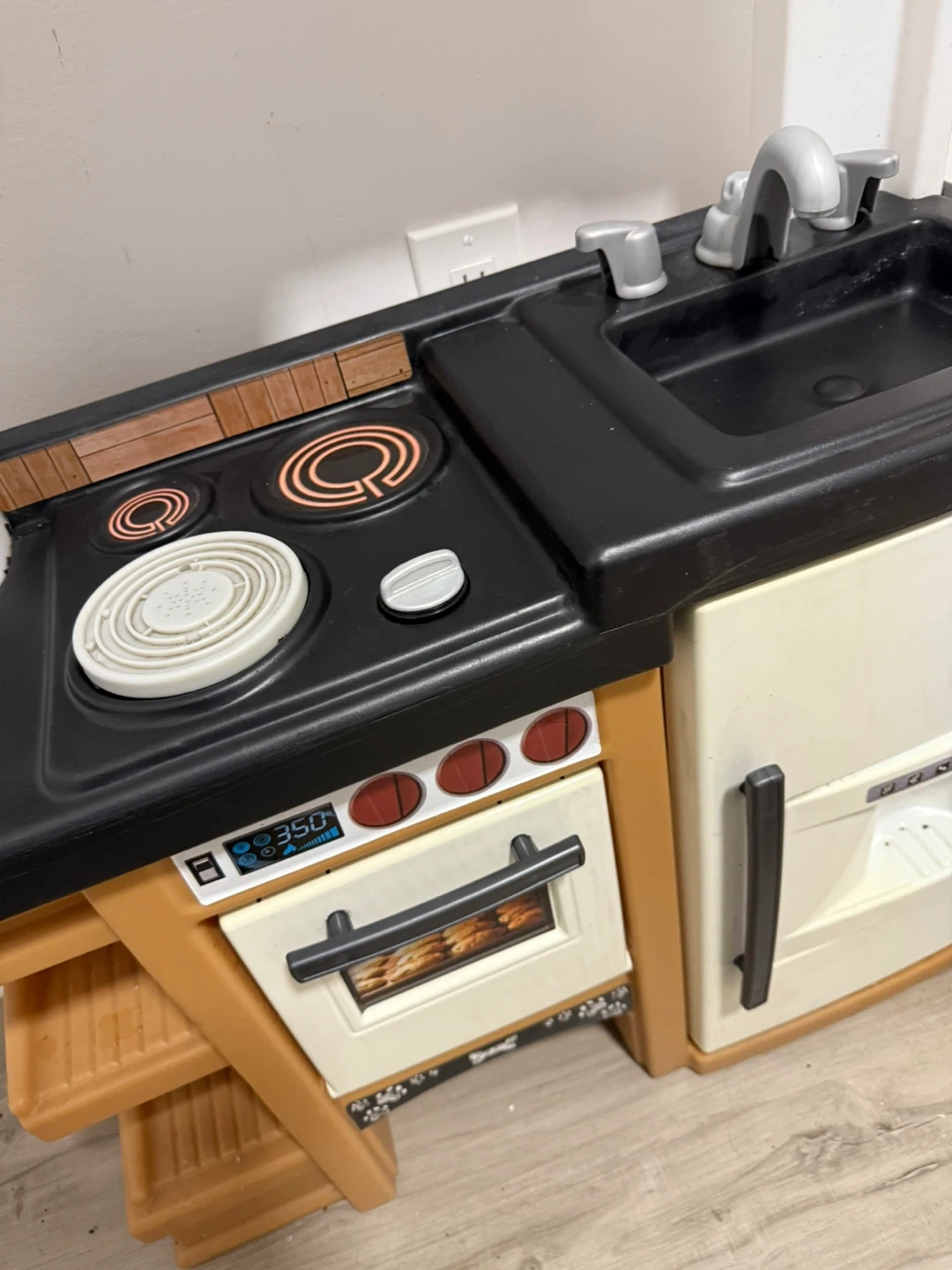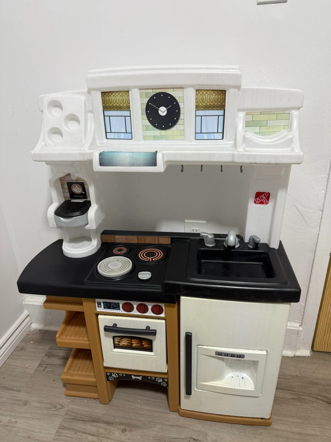 This Step2 play kitchen features a coffee maker, stove burners, and a sink with faucet. It's designed for imaginative play with realistic details. Includes oven with baking rack and refrigerator.