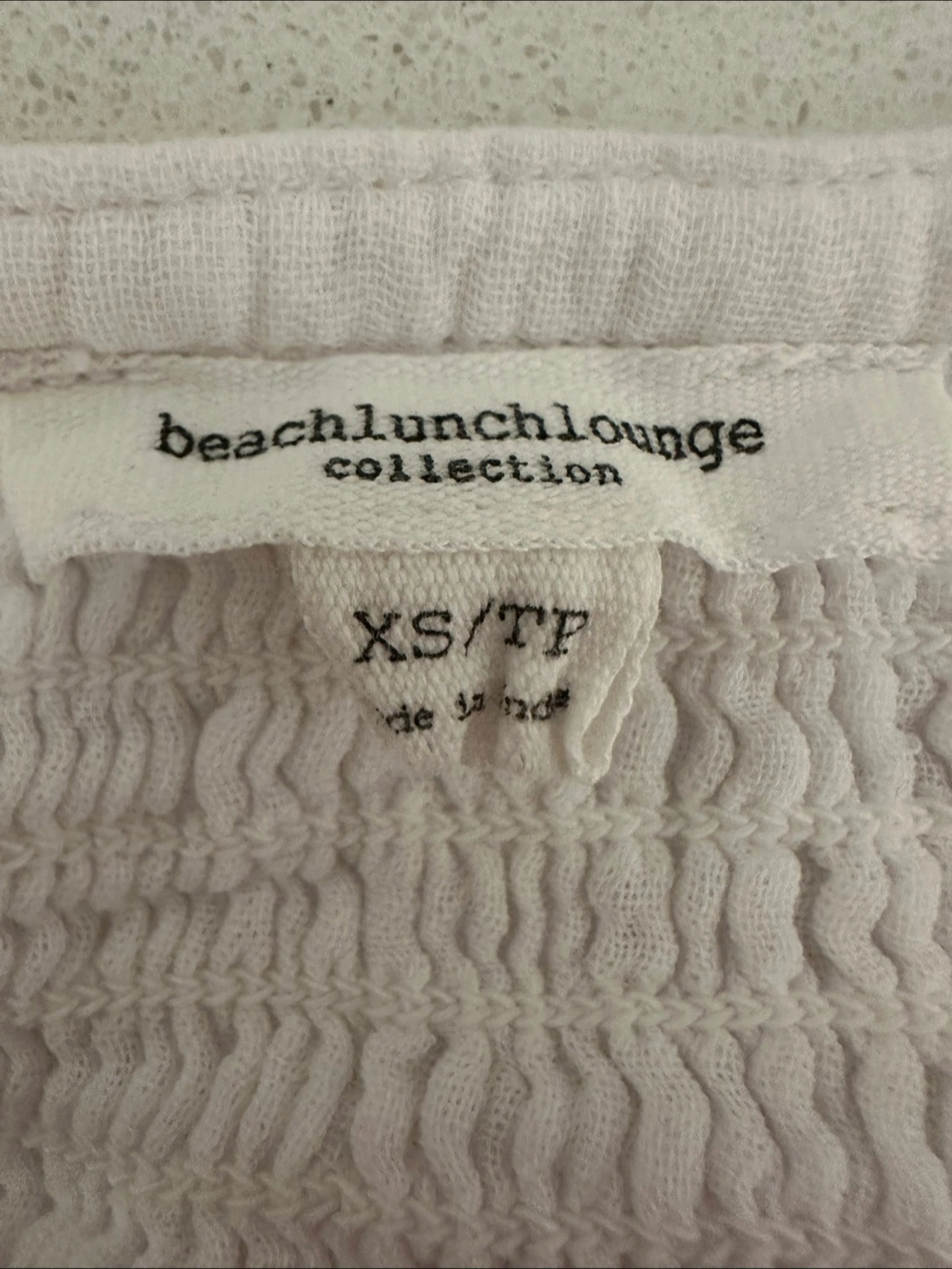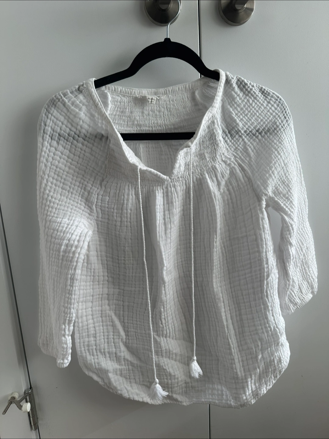 White peasant blouse. Three-quarter sleeves. Drawstring neckline. Textured fabric. Size XS/TP.