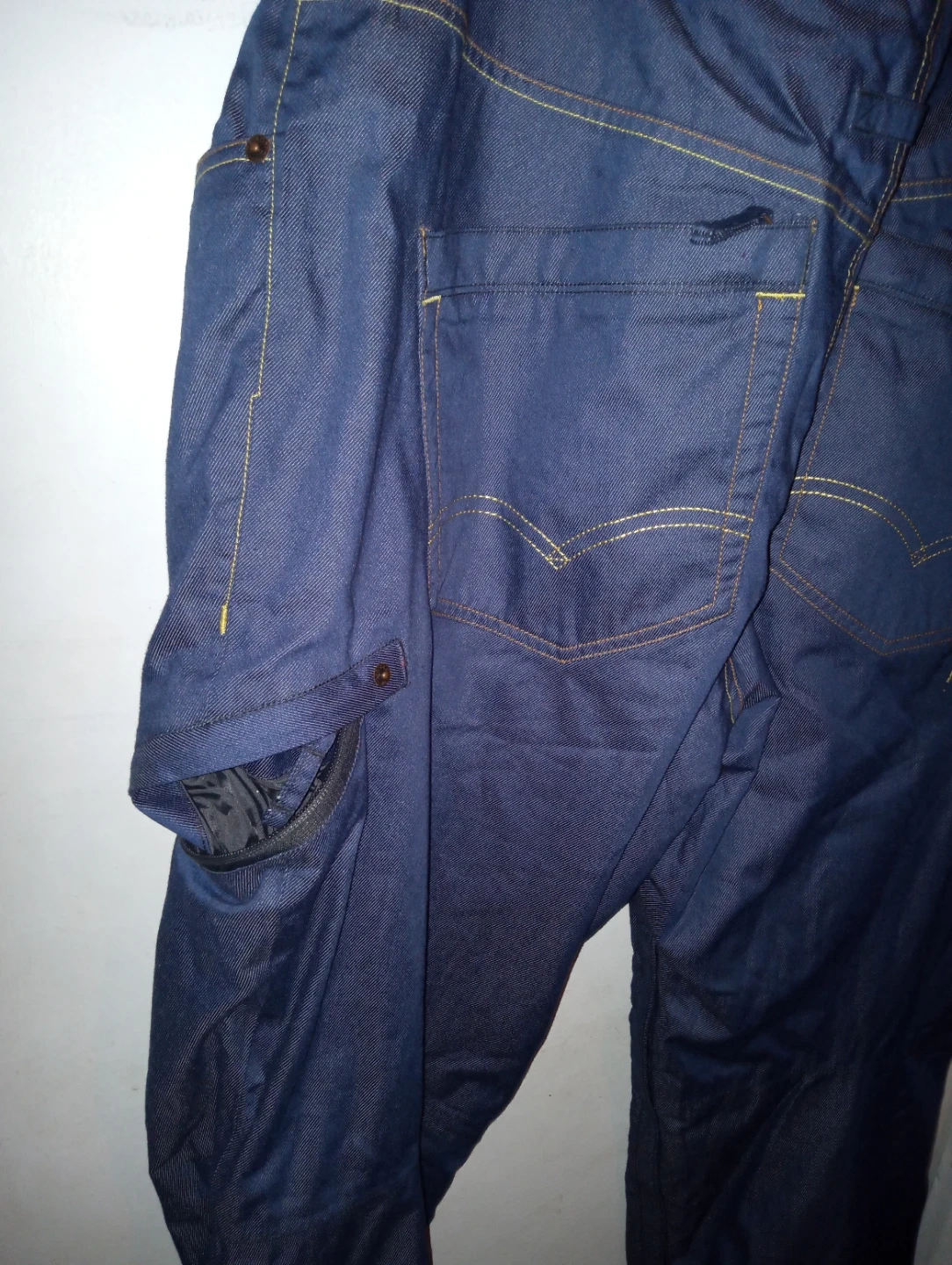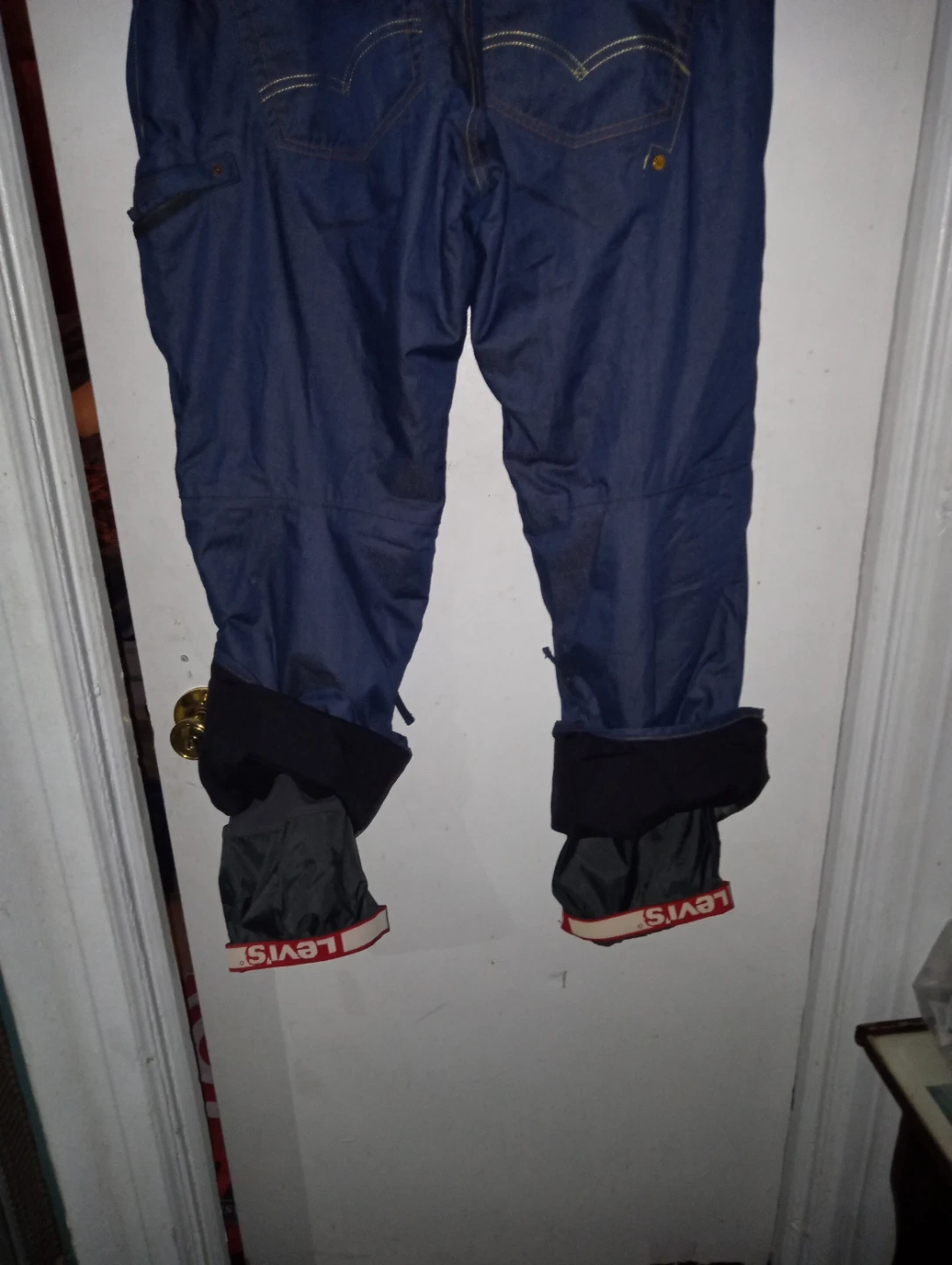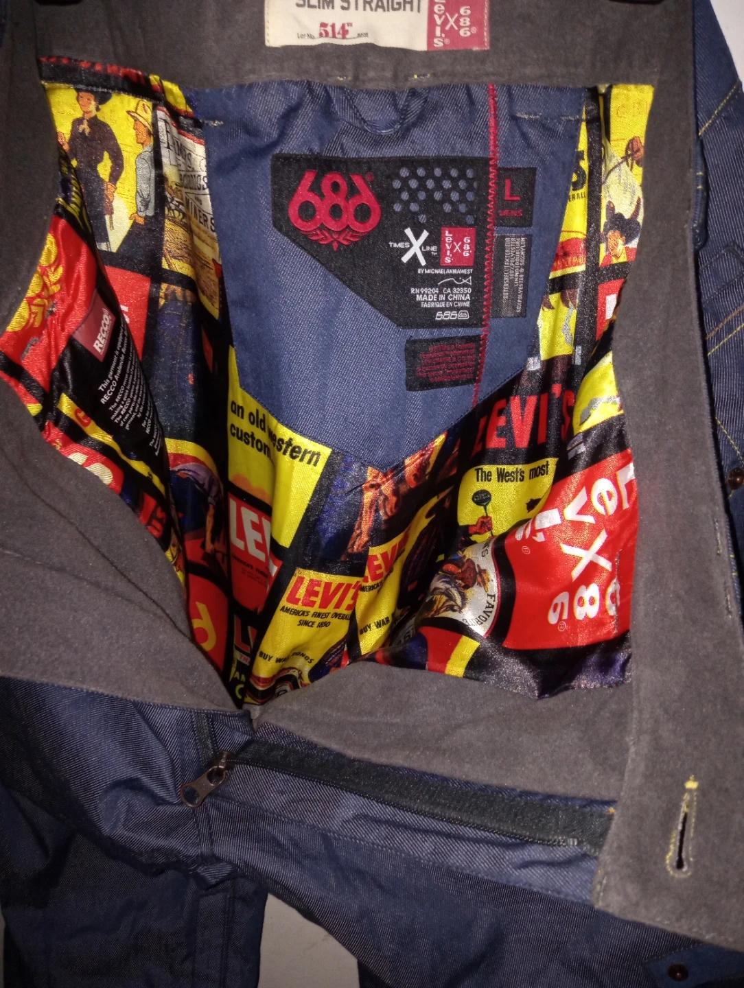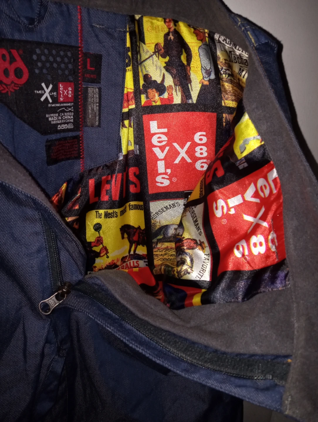 These are 686 x Levi's collaboration denim ski or snowboard pants. They feature a bold, custom lining with vintage Levi's graphics. They're size large and ready for your next winter adventure!