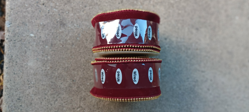 Two rolls of wired burgundy velvet ribbon with gold trim! These are perfect for crafts, decorations, or gift wrapping. The wired edge helps the ribbon hold its shape beautifully. Great for adding a touch of elegance to any project