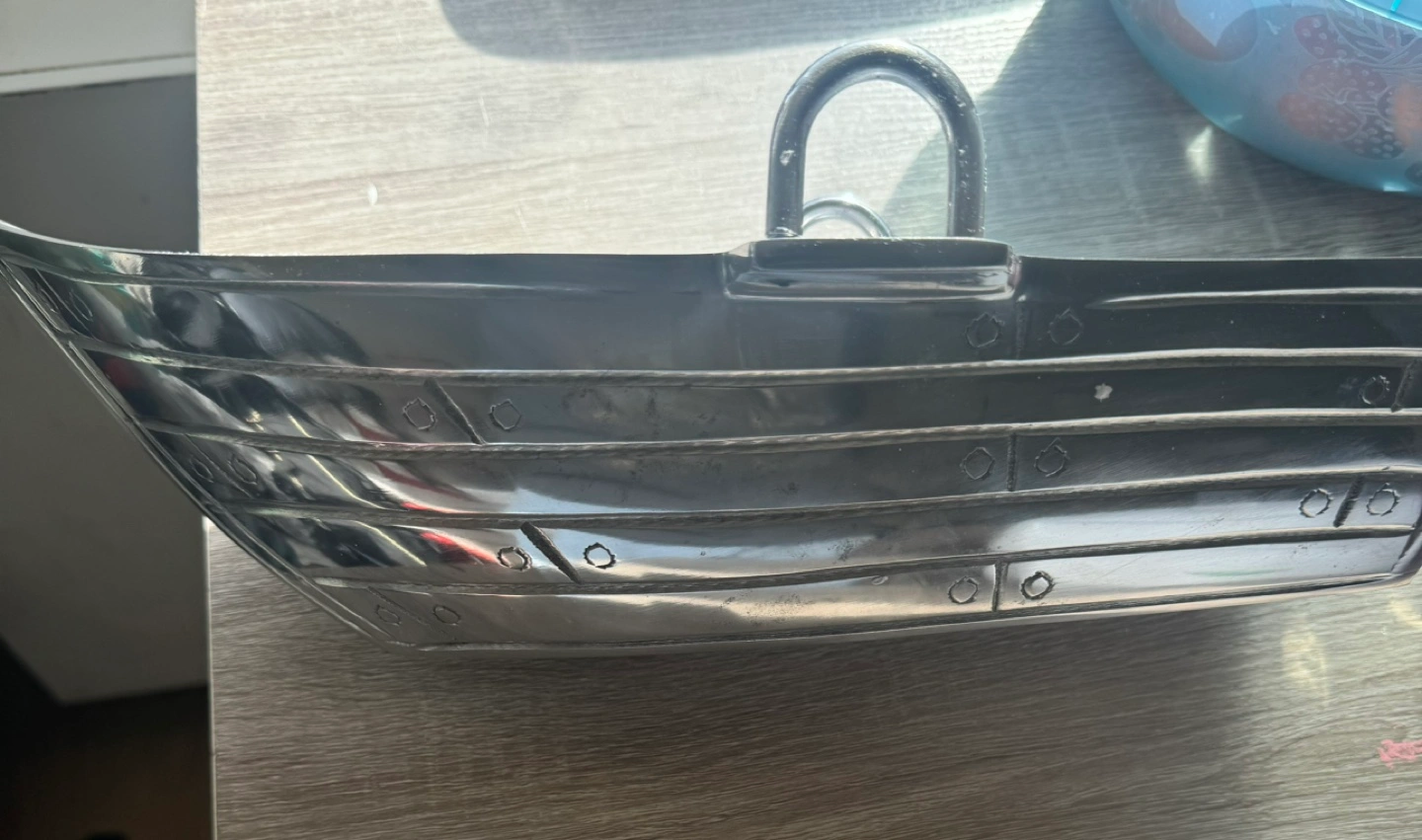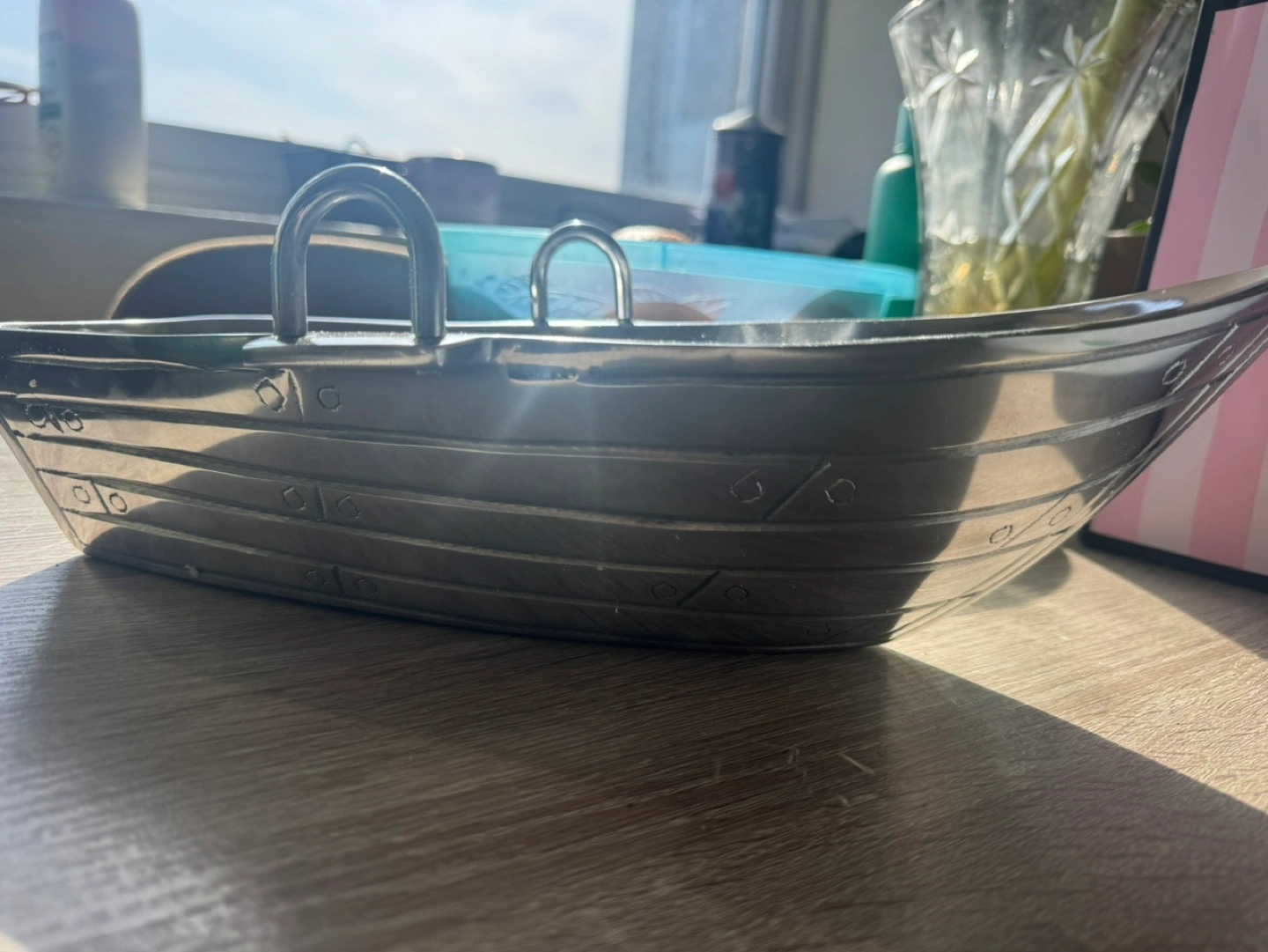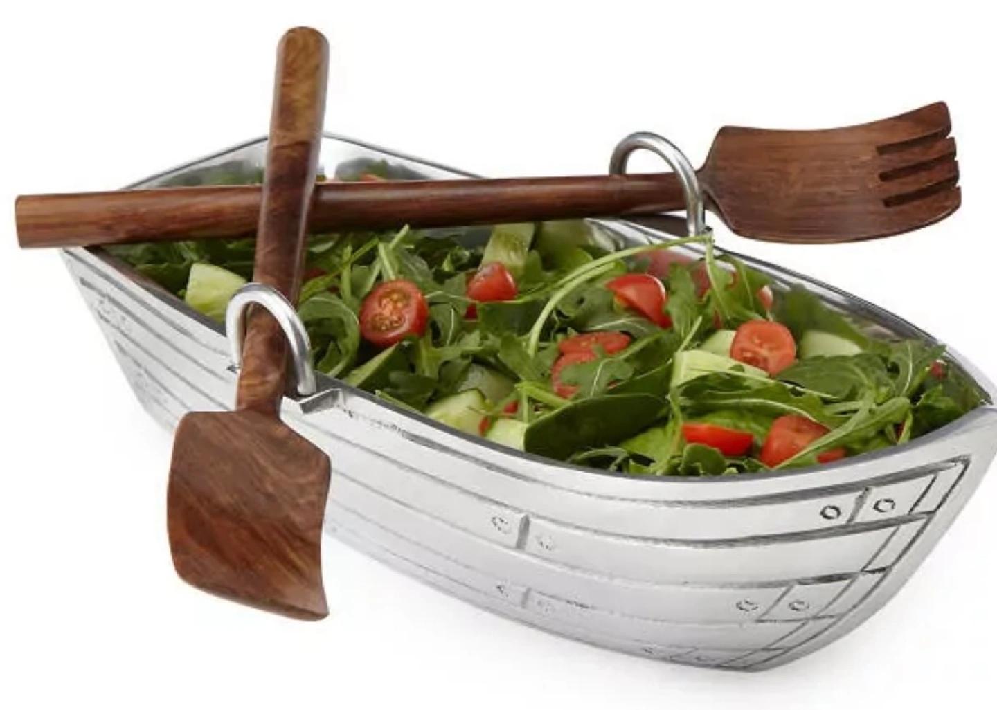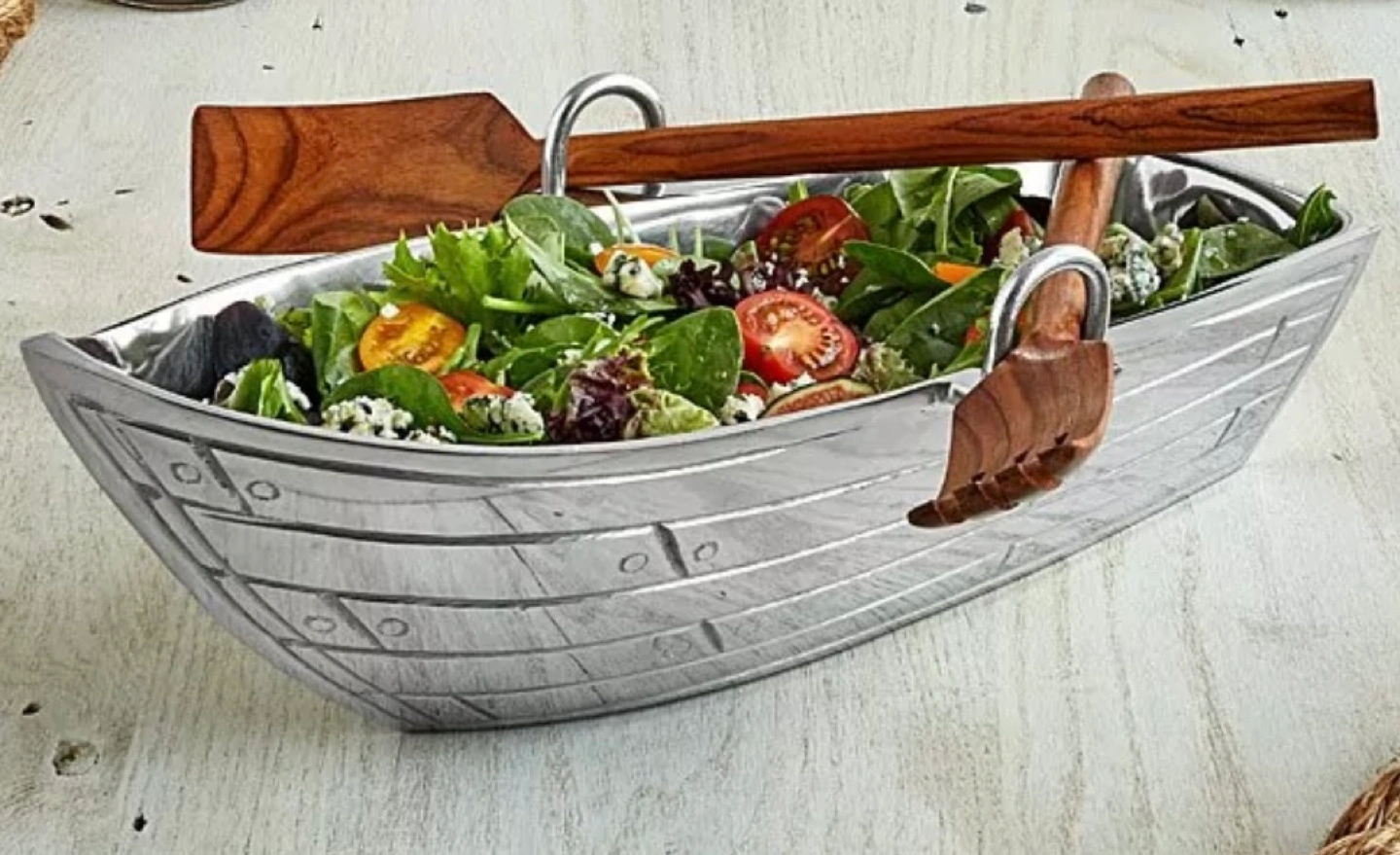 Aluminum boat-shaped serving bowl. Wooden Utensils included.Perfect for salads or other dishes. Nautical theme.