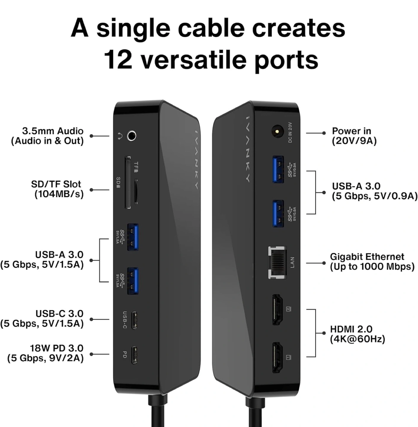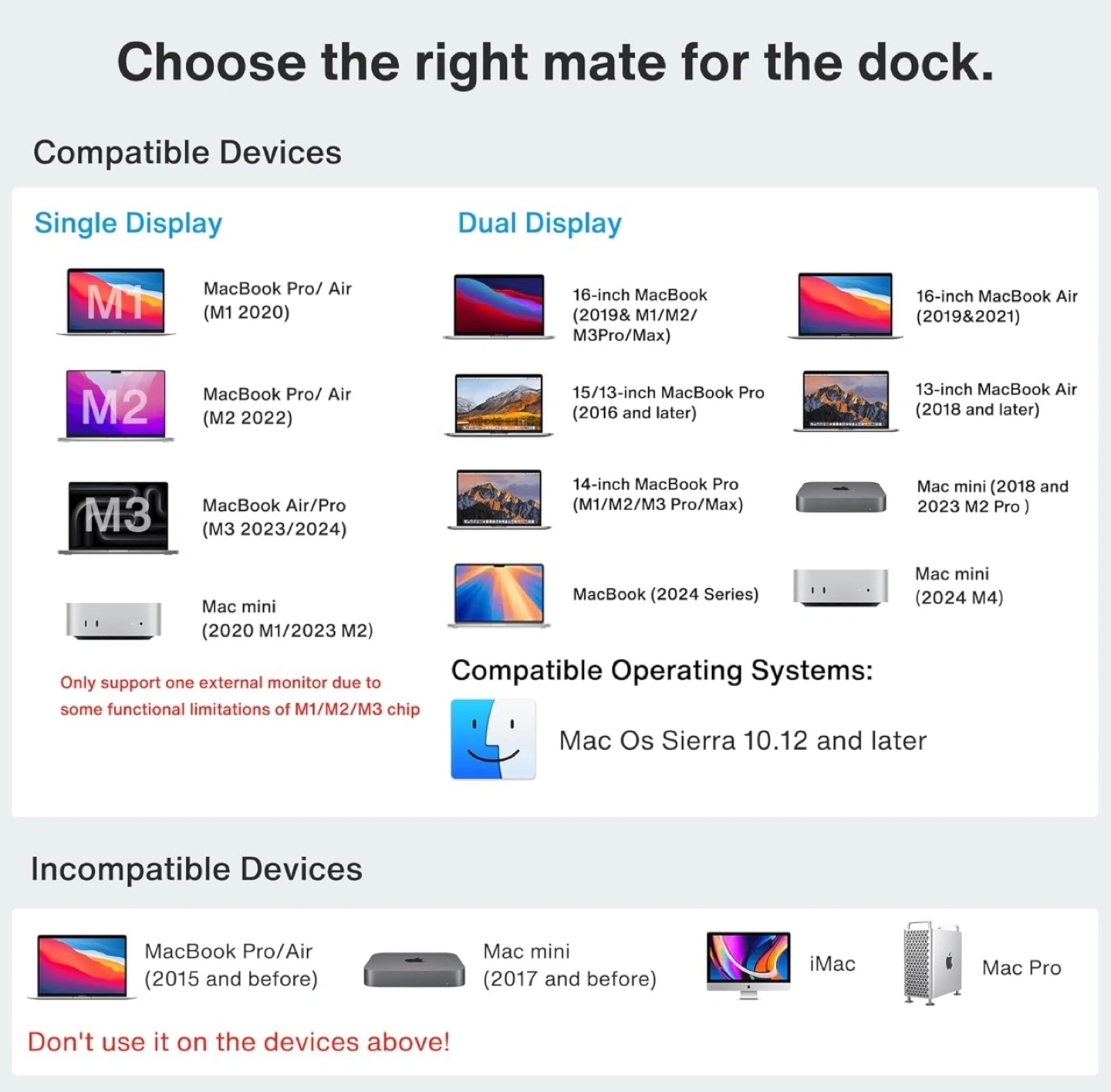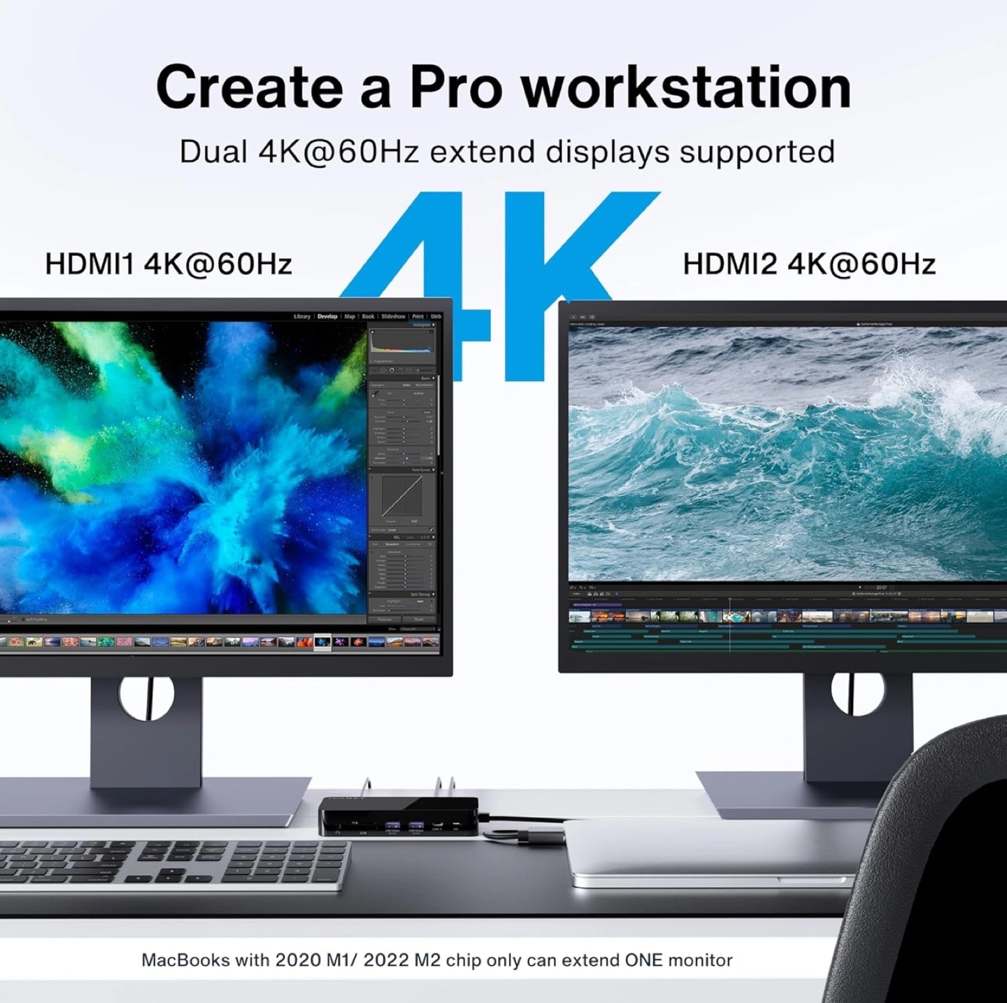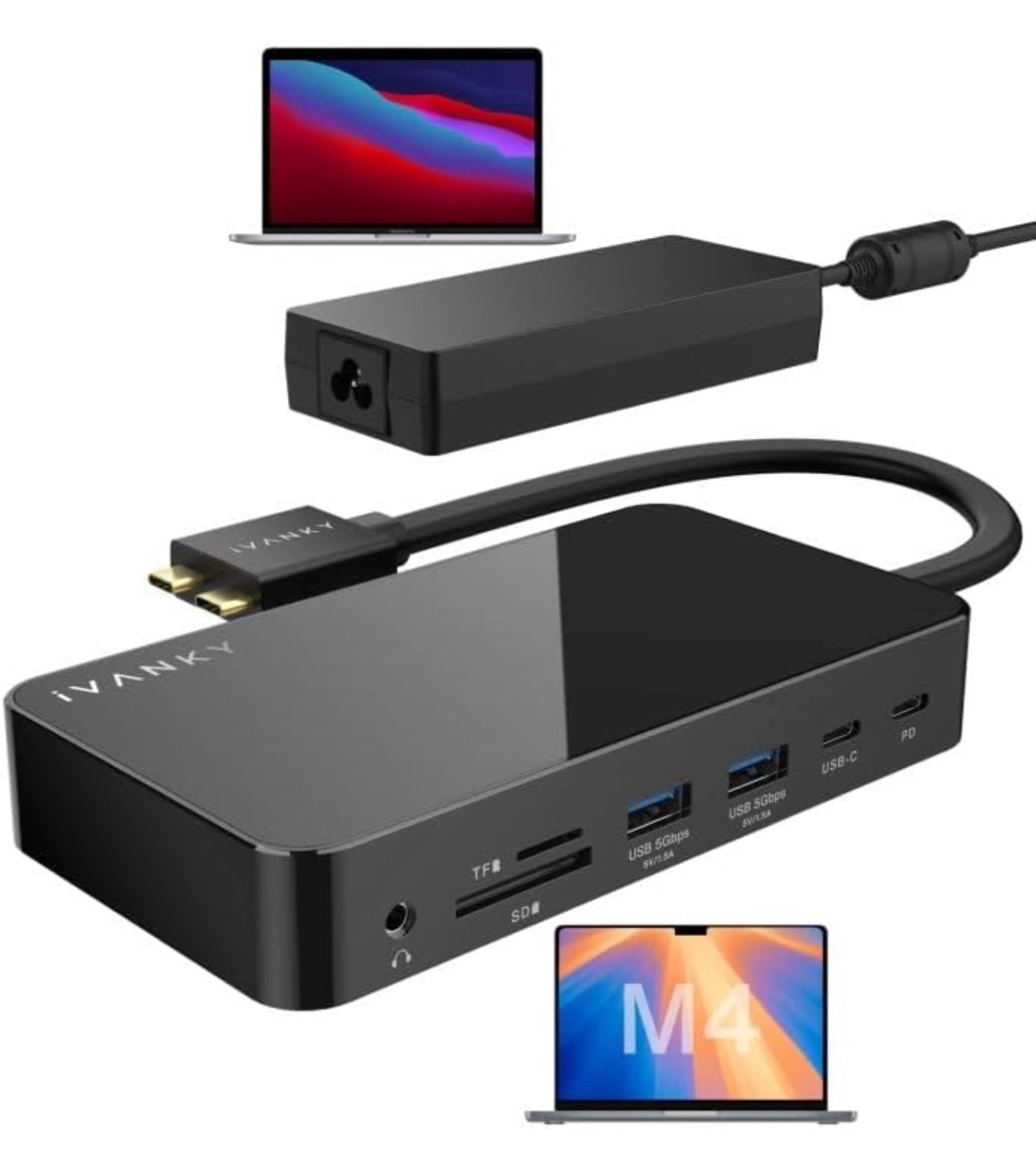 62BRAND NEW OPEN BOX FOR PICTURES PURPOSE iVANKY FusionDock 1. Compact design. Supports dual external monitors up to 4K@60Hz. 96W PD power supply. Multiple ports including USB-A, USB-C, SD card reader, and headphone jack. Compatible with various MacBooks and other devices. Check compatibility chart for specifics.