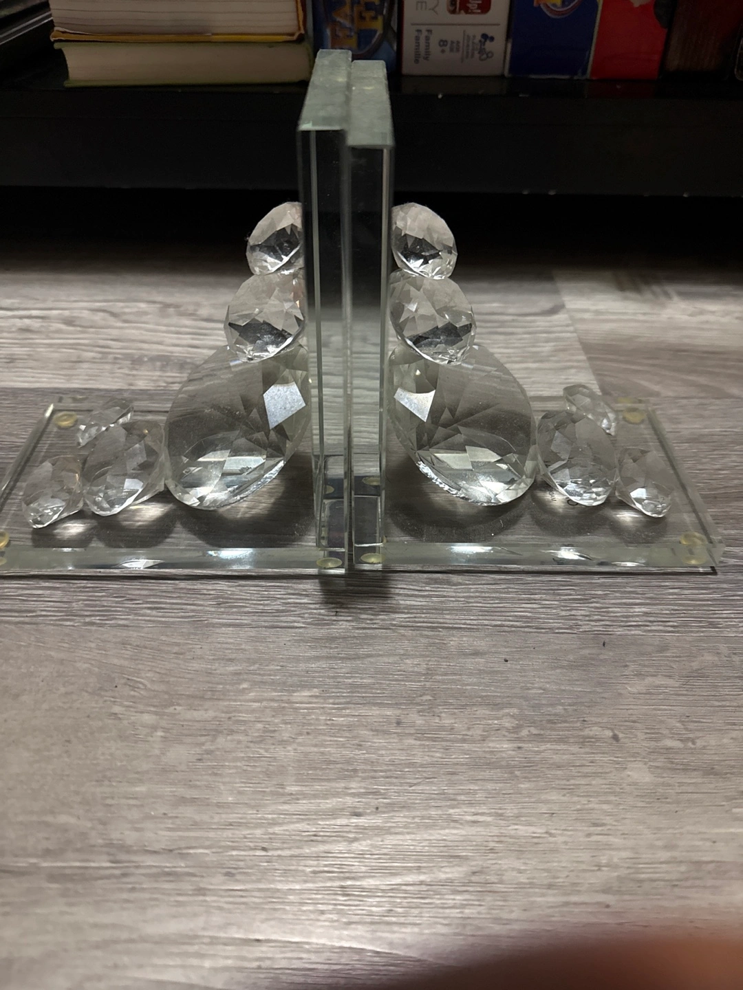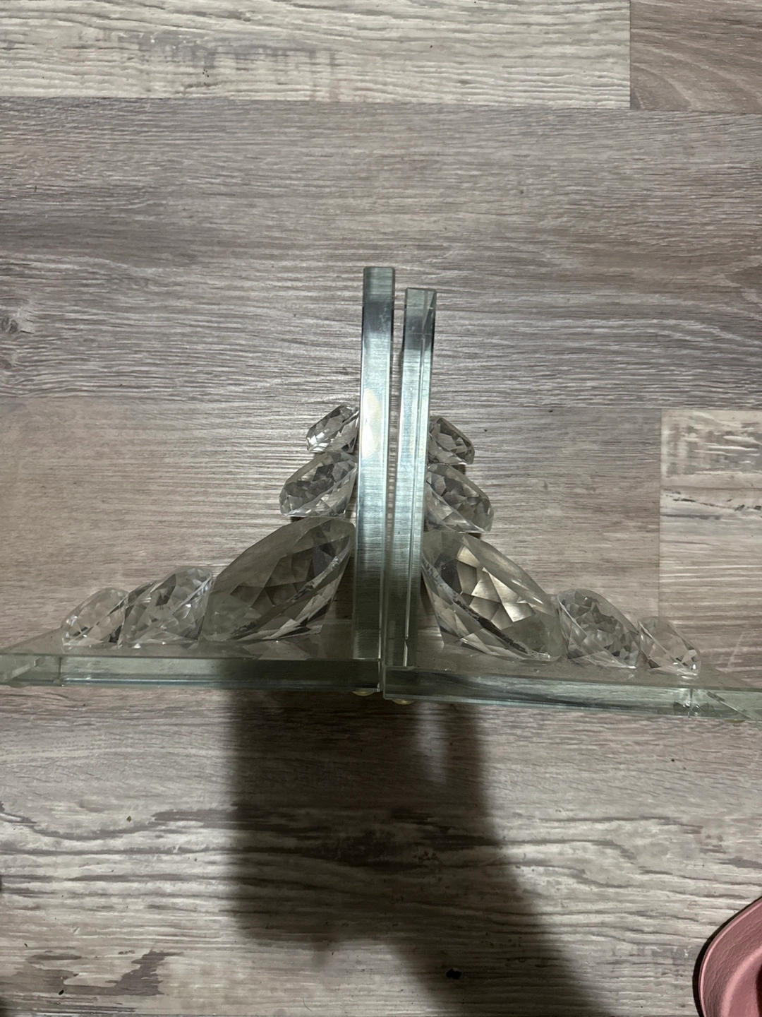 Pair of clear glass bookends. Features faceted crystal accents. Elegant design. Perfect for a desk or shelf.