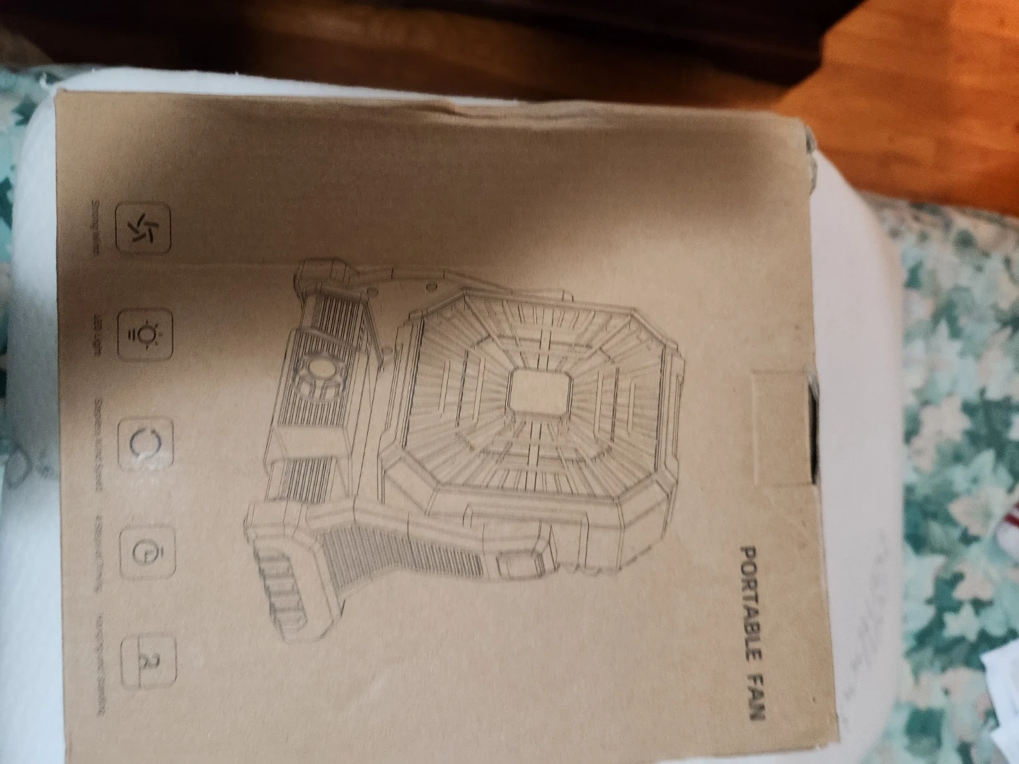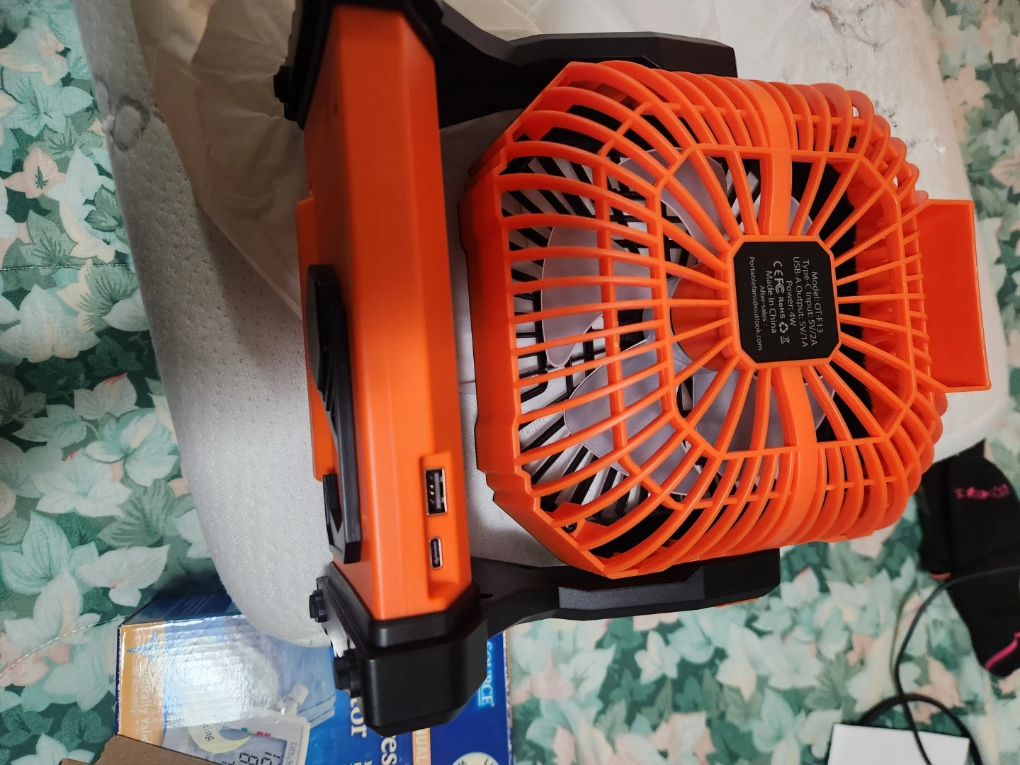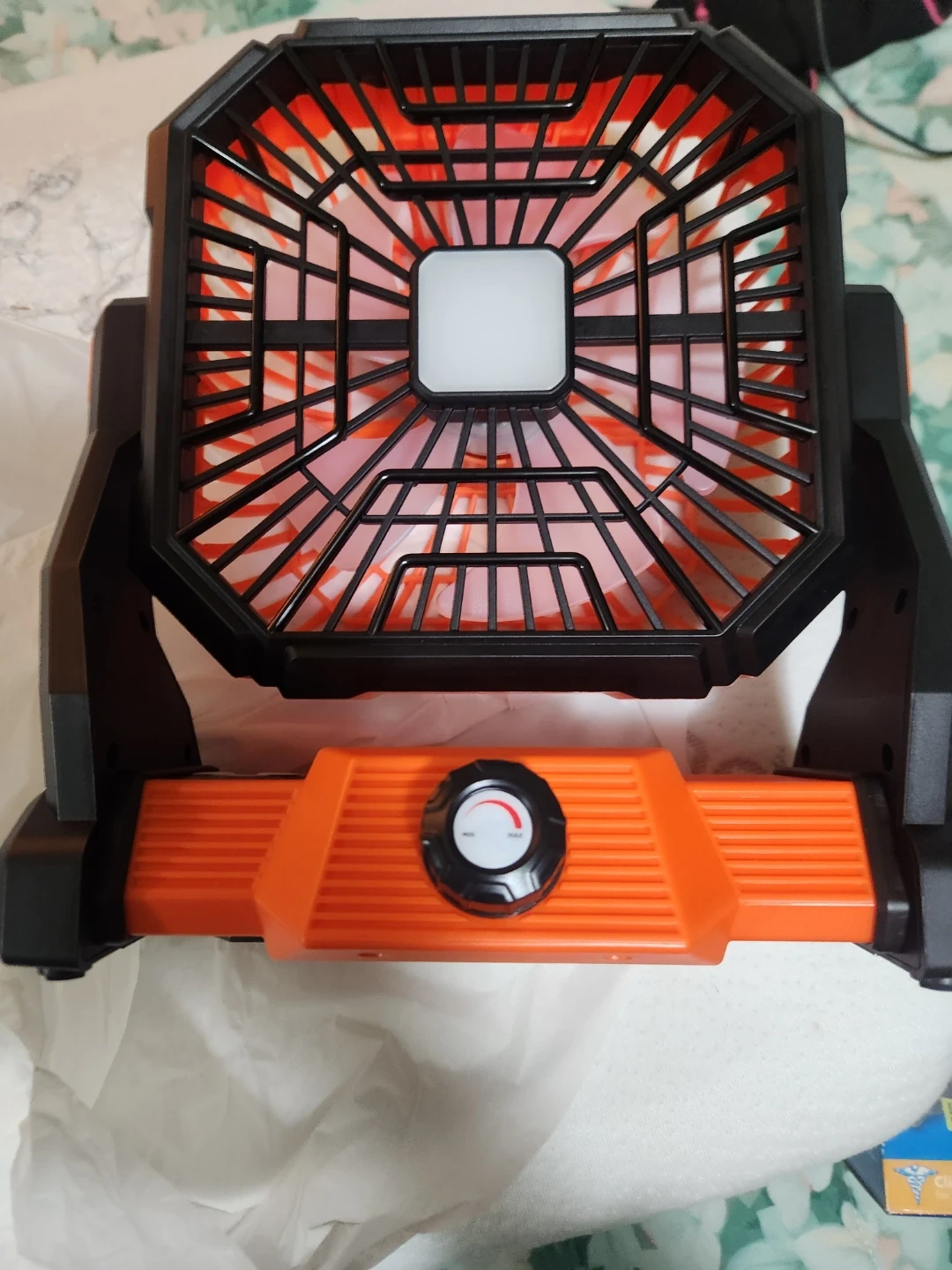 This portable fan has adjustable speed settings and includes an LED light. It's orange and black. The fan is designed for outdoor use.