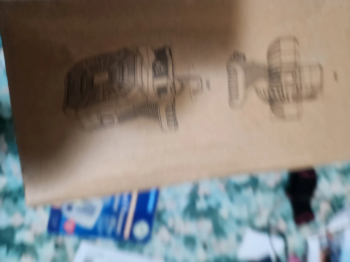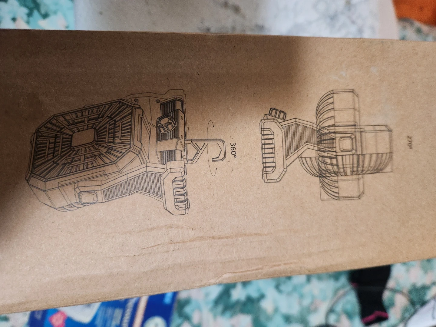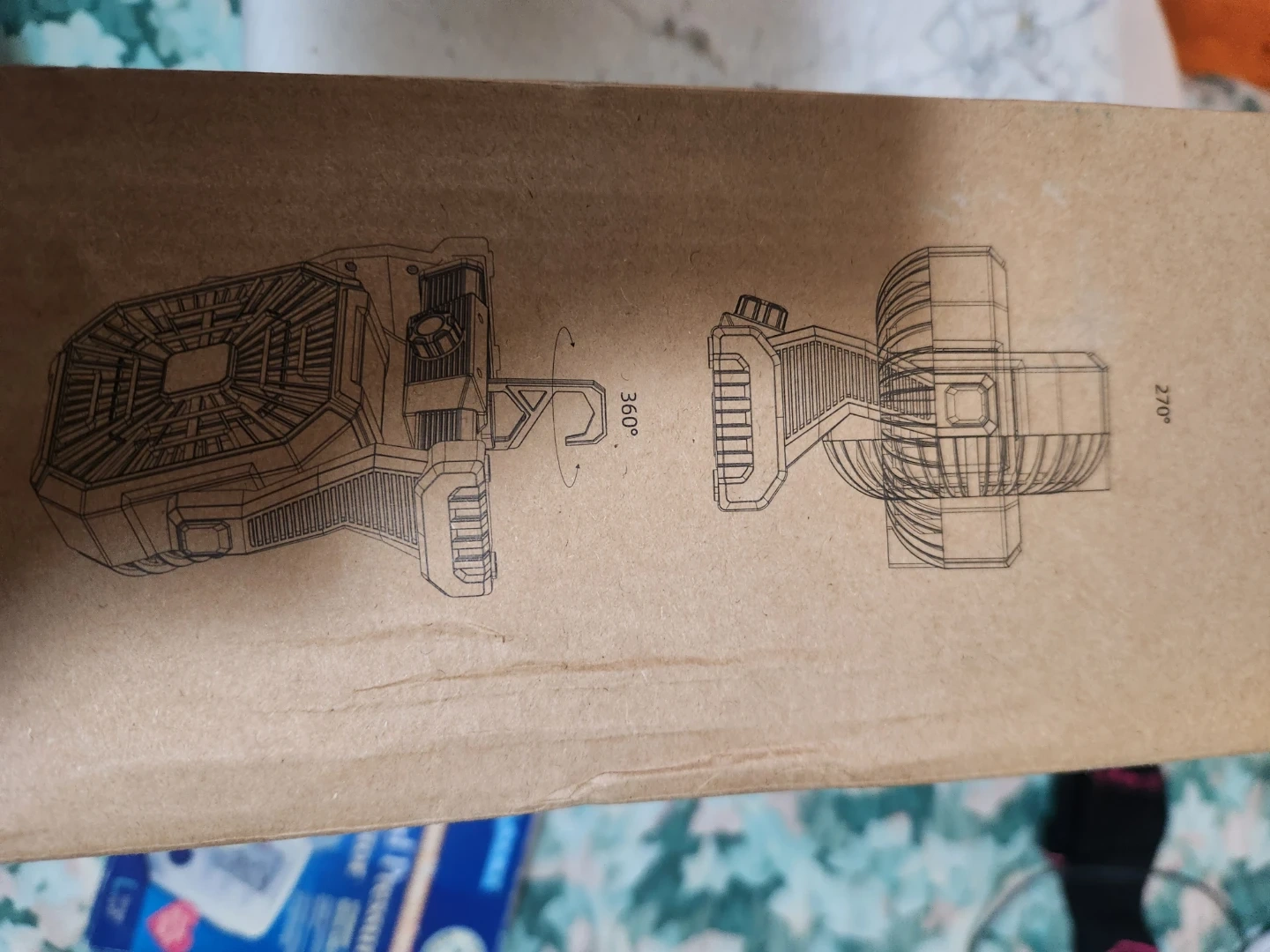 This portable fan has adjustable speed settings and includes an LED light. It's orange and black. The fan is designed for outdoor use.