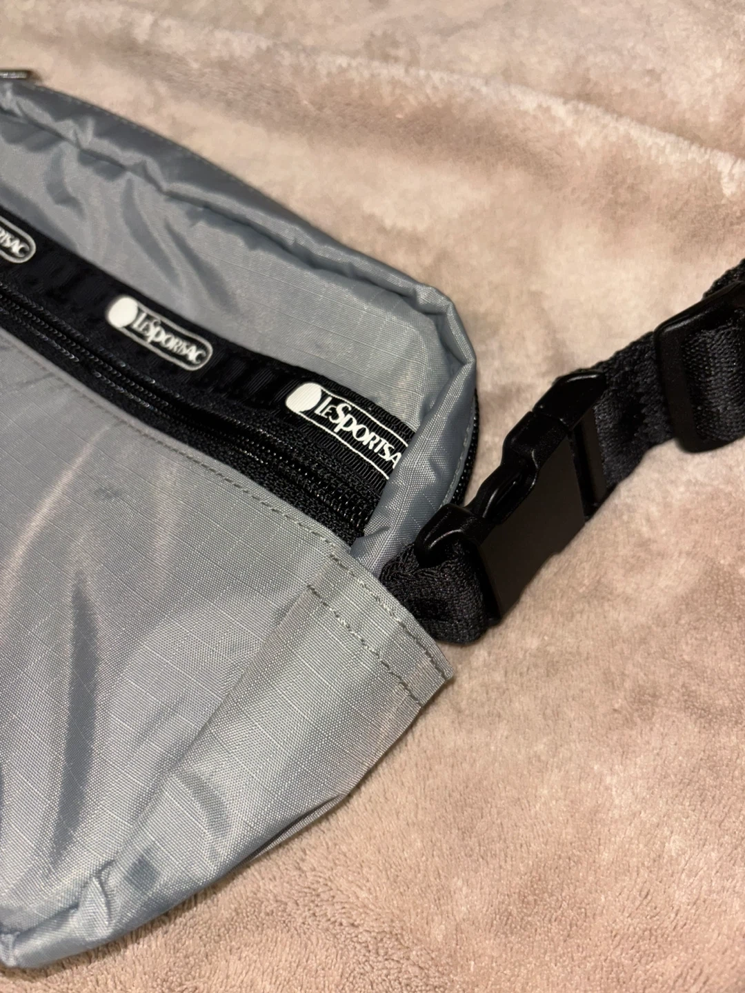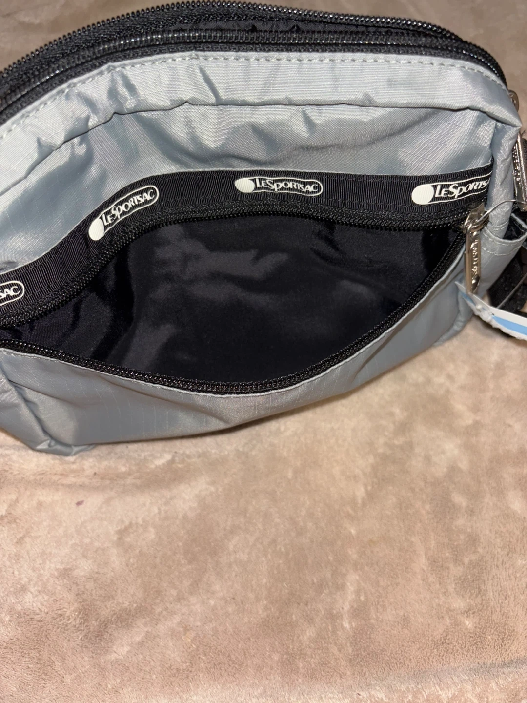 Selling a LeSportsac crossbody bag! It's a stylish and practical bag for everyday use. The bag is gray and features a black strap and zipper. It has multiple compartments to keep your belongings organized. Great for travel or running errands!