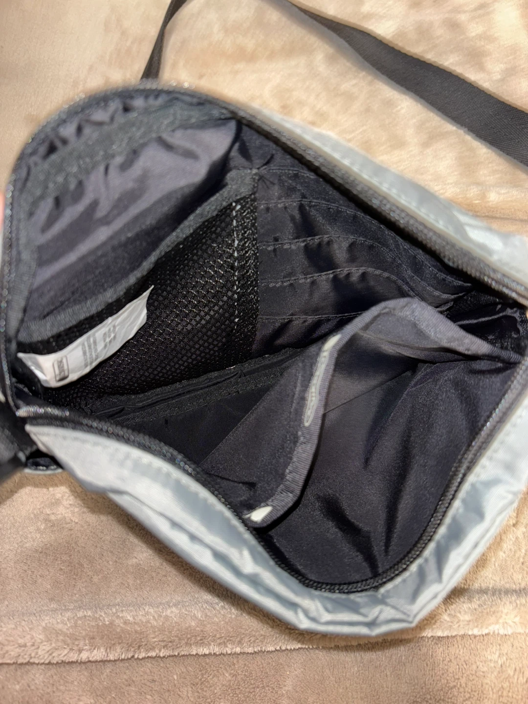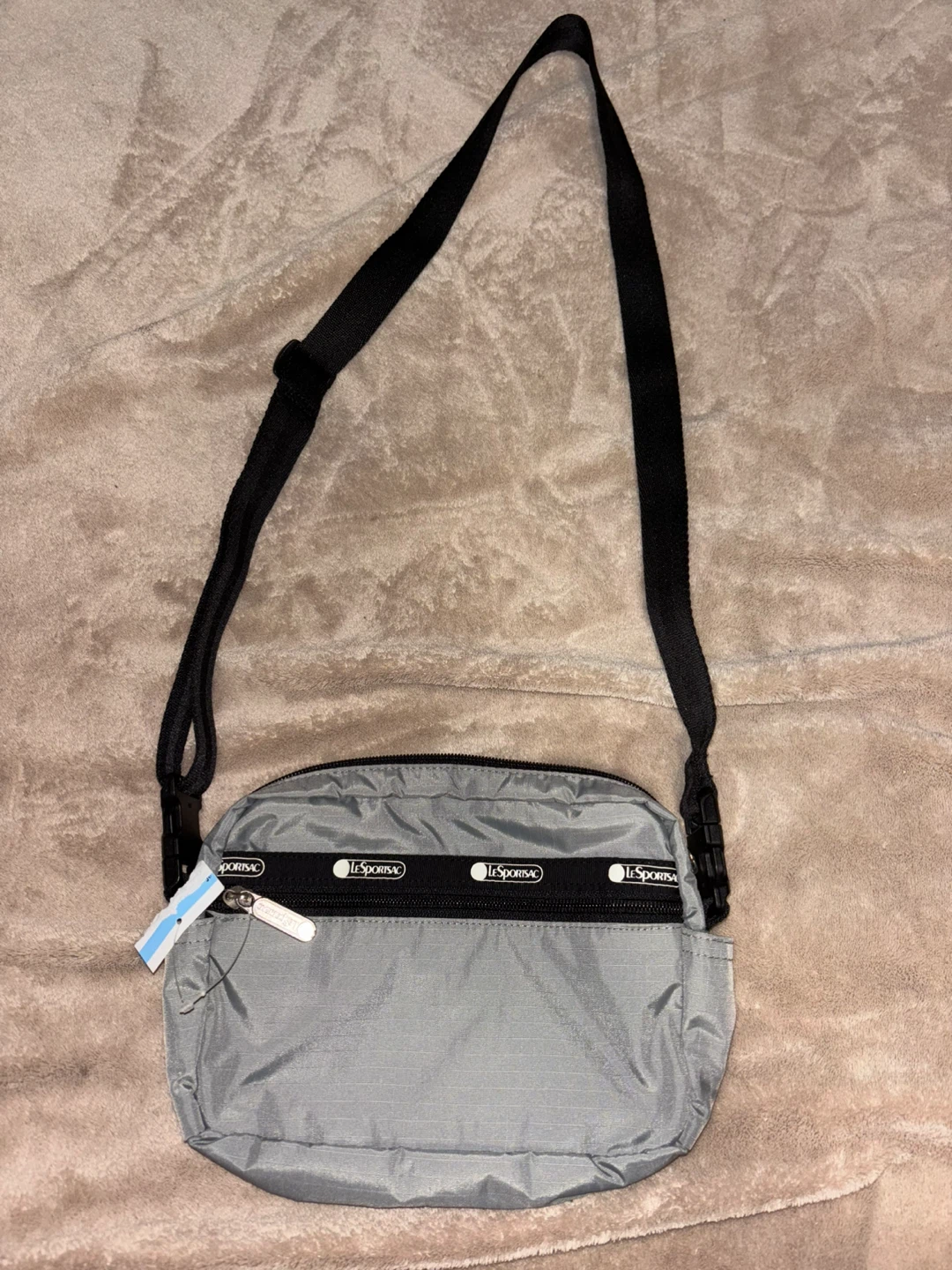 Selling a LeSportsac crossbody bag! It's a stylish and practical bag for everyday use. The bag is gray and features a black strap and zipper. It has multiple compartments to keep your belongings organized. Great for travel or running errands!