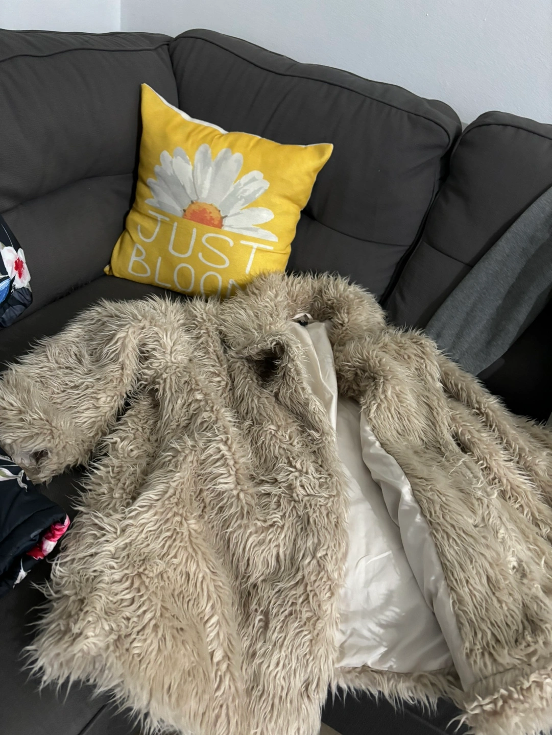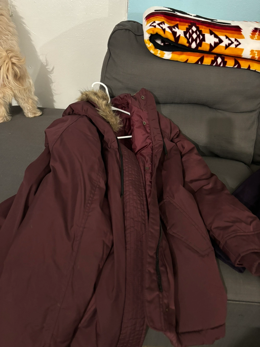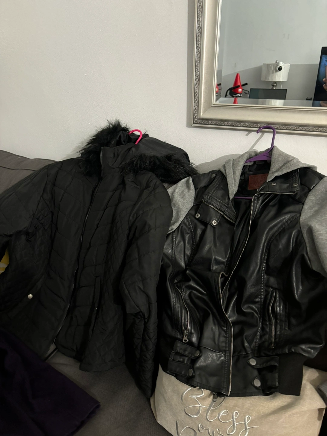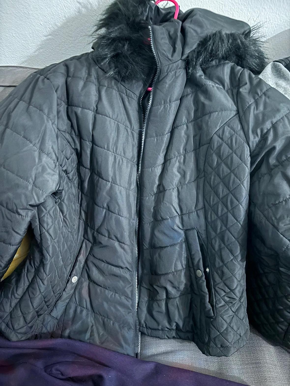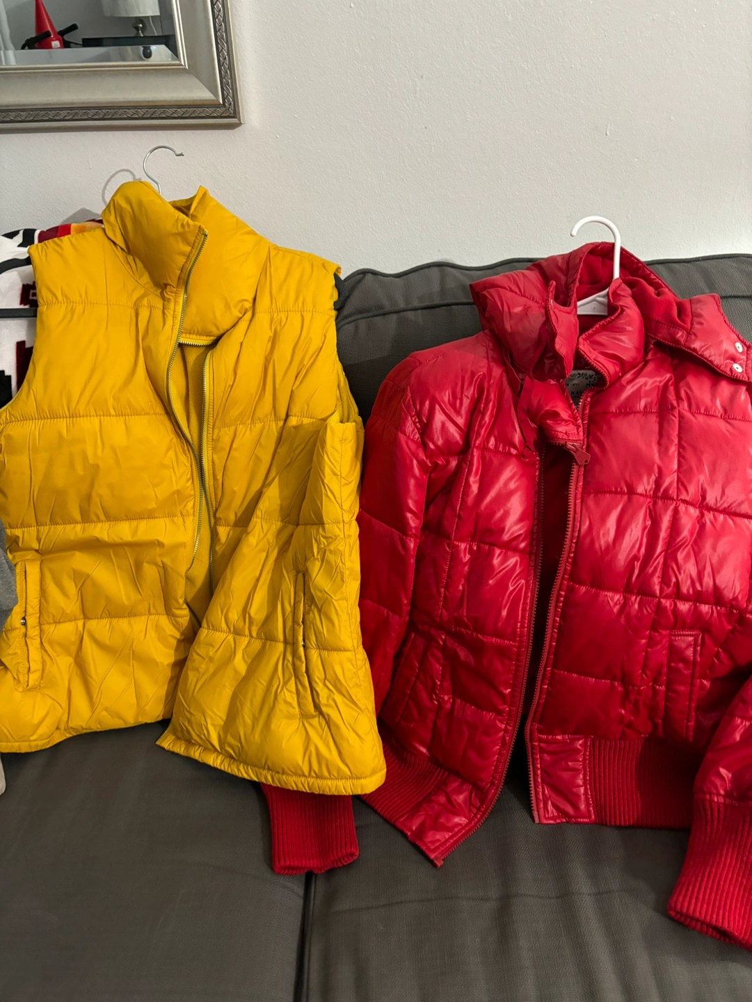 women's coats: 1 faux fur coat, 1 yellow puffer vest, 1 red puffer jacket, A coat $15 each item.