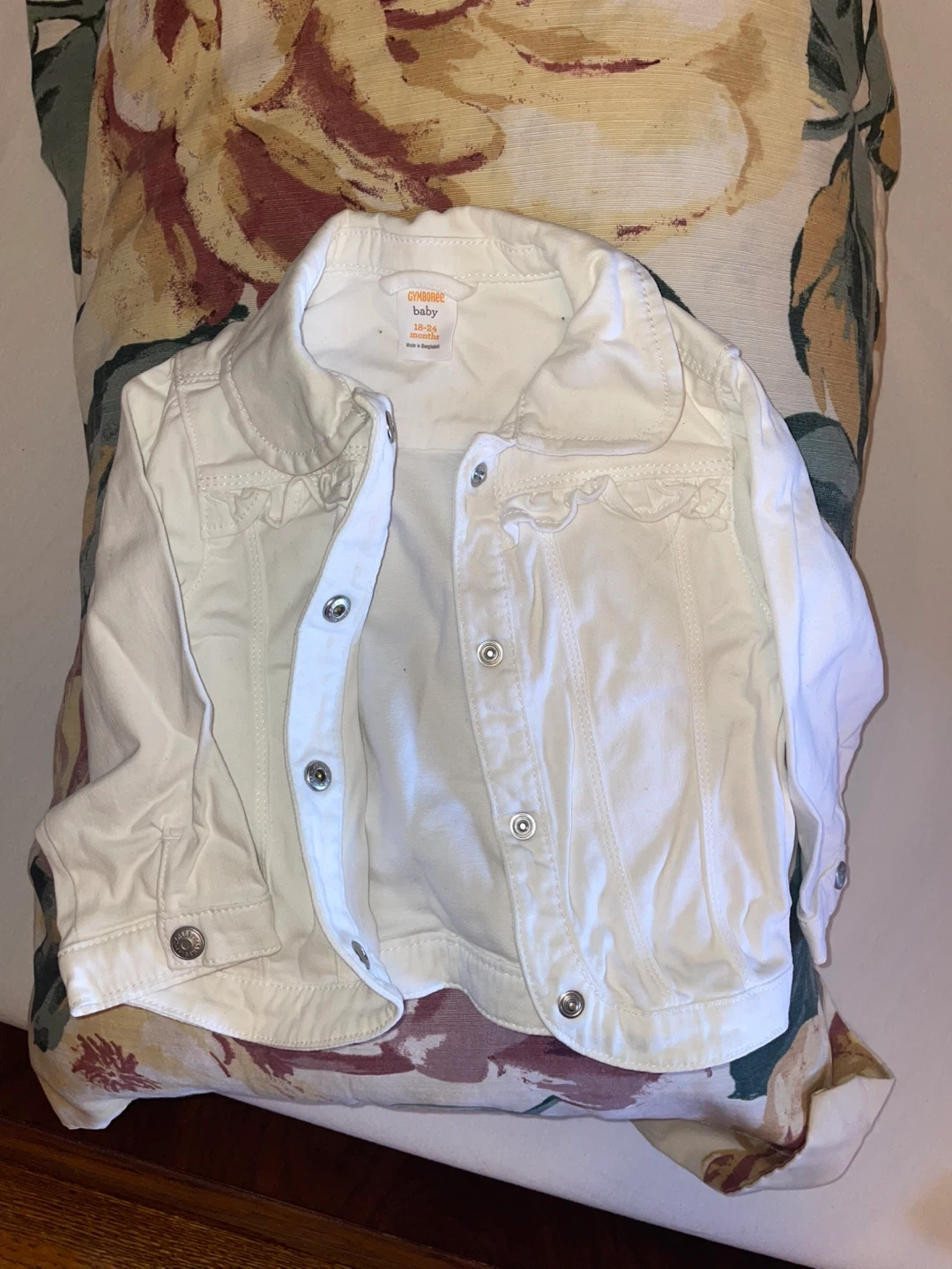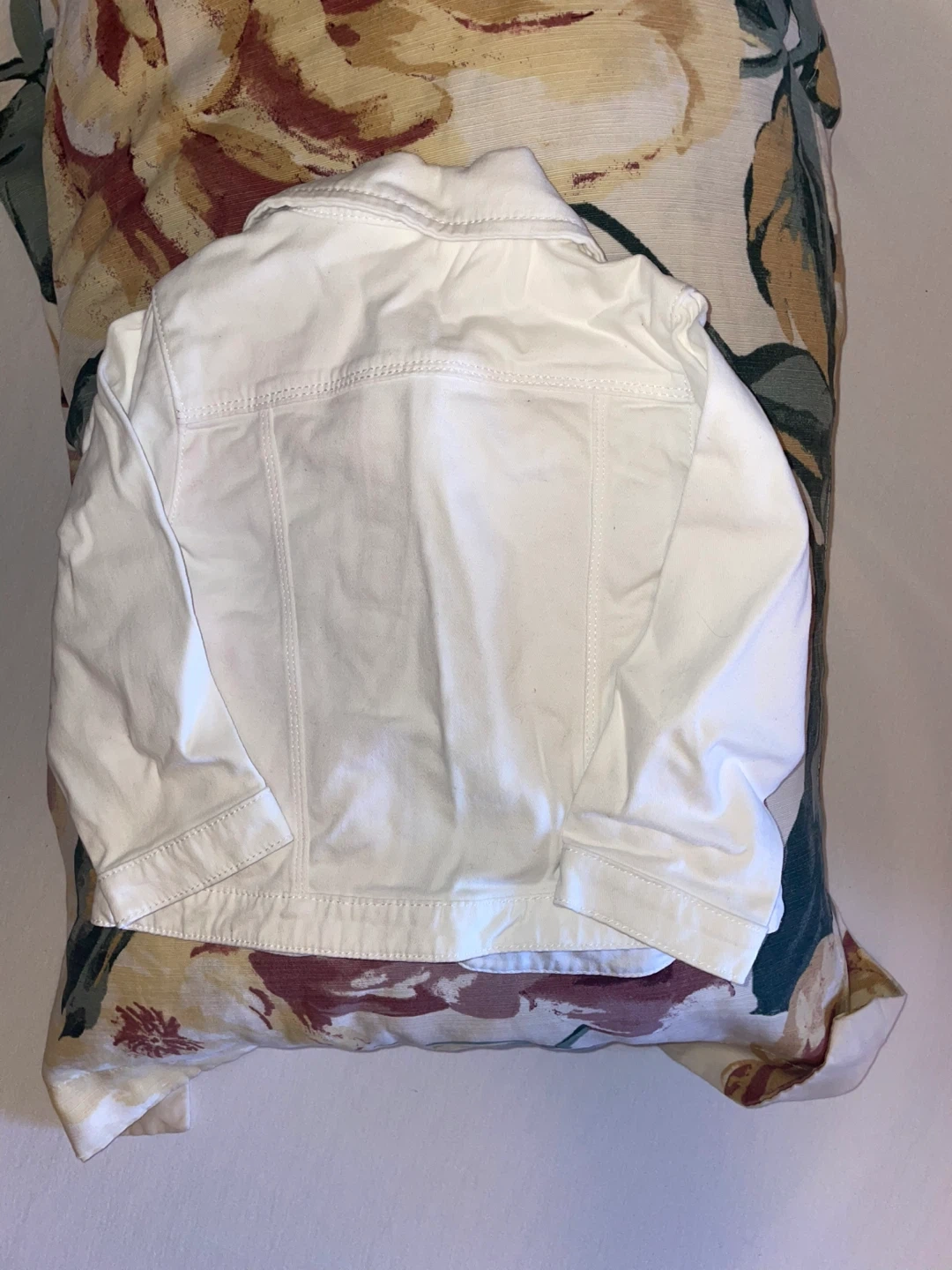 Stylish white jean jacket by Gymboree. Very comfy stretchy material. Features button-up front and ruffle details. Ideal for layering. In excellent, like new condition. Pick up & cash only.