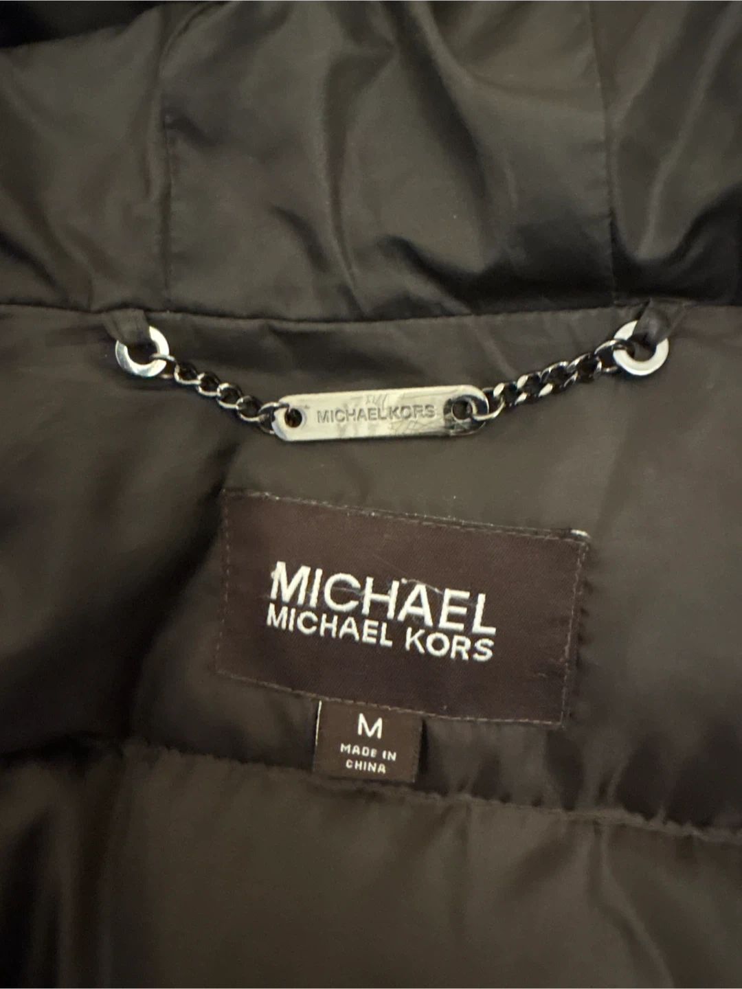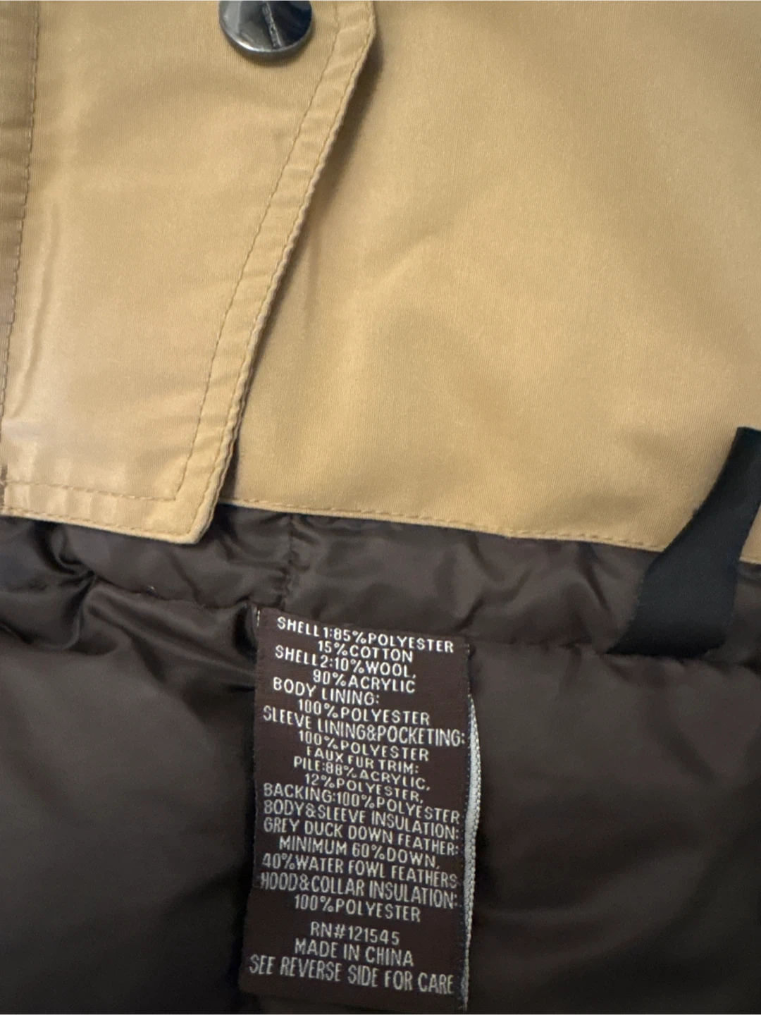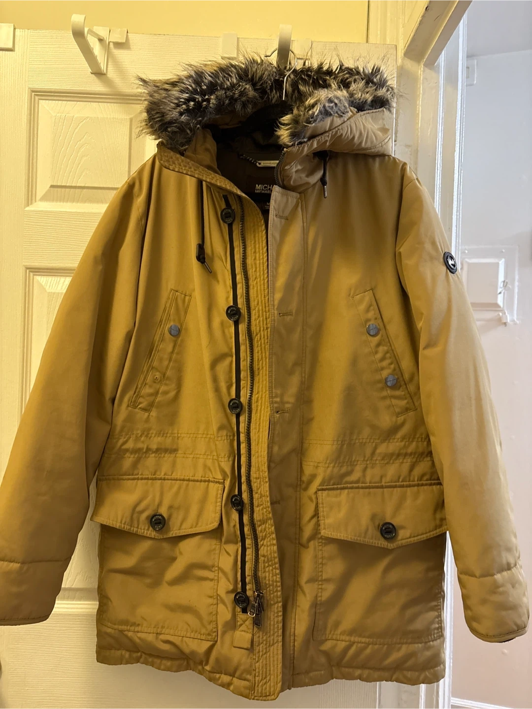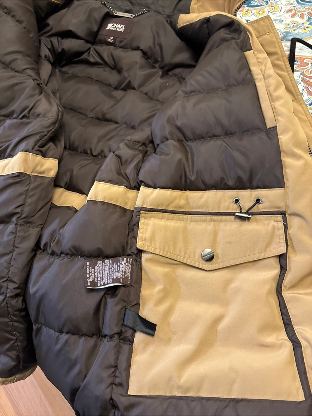 Michael Kors parka jacket in tan. Features a fur-lined hood and multiple pockets. Shell is 85% polyester and 15% cotton. Filling is 60% down and 40% water fowl feathers. Made in China.