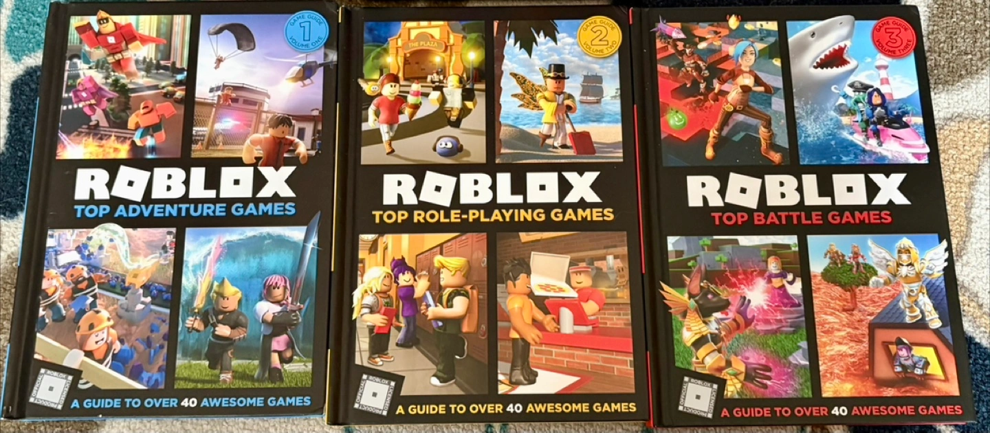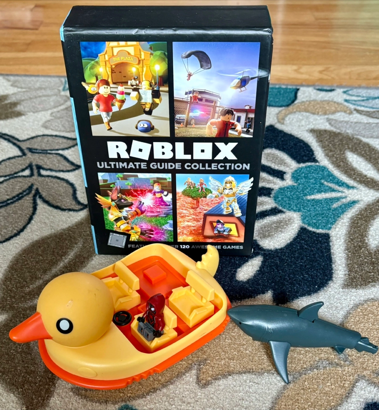 Gently used Cute yellow duck boat (with 3 wheels) with small Roblox figurine inside. Includes a gray shark . Great for imaginative play. Also in very great condition, Roblox Ultimate Guide collection , includes 3 books . Selling as a bundle.