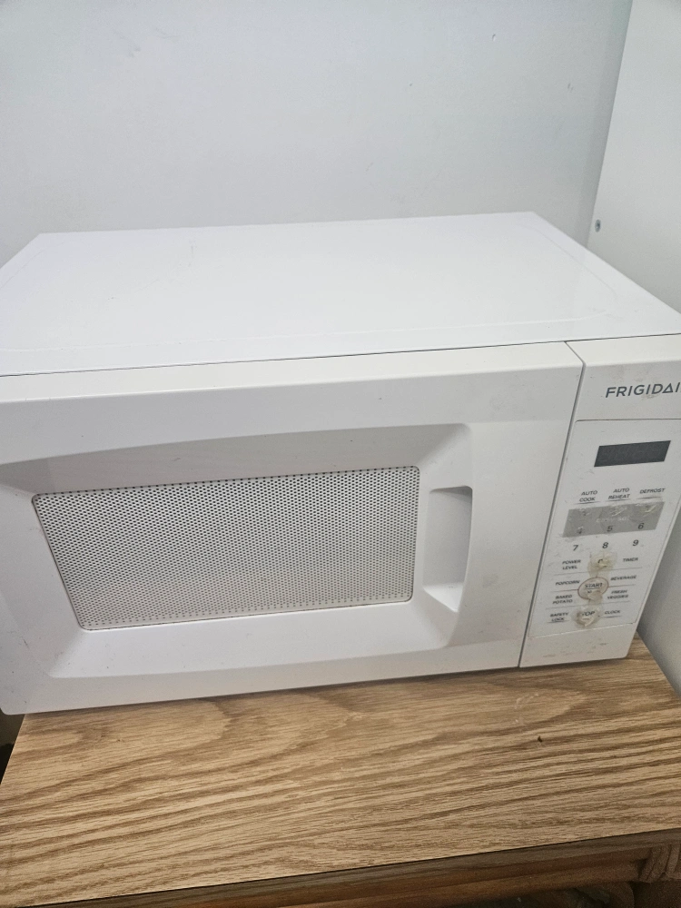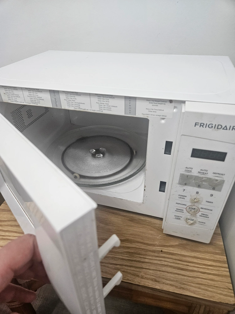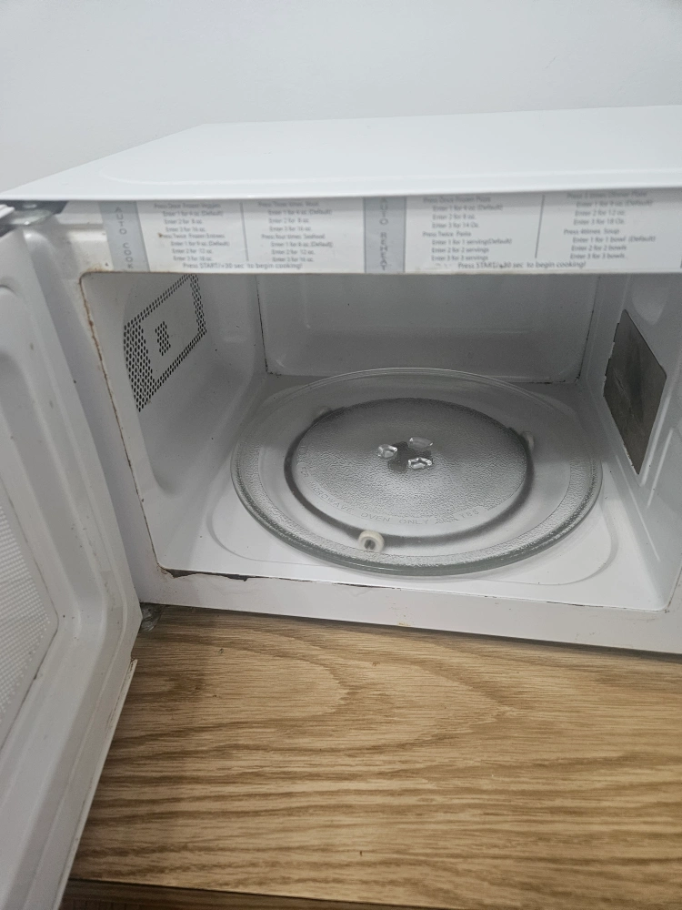 A white microwave oven. It features a digital control panel, a handle, and a glass turntable. The door opens to reveal the interior. It's perfect for warming up leftovers on a cold day.