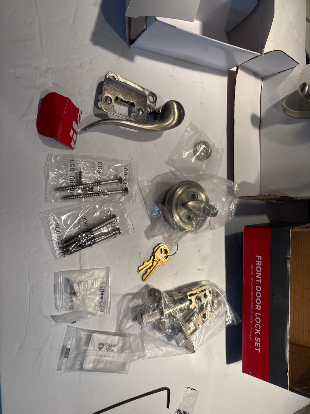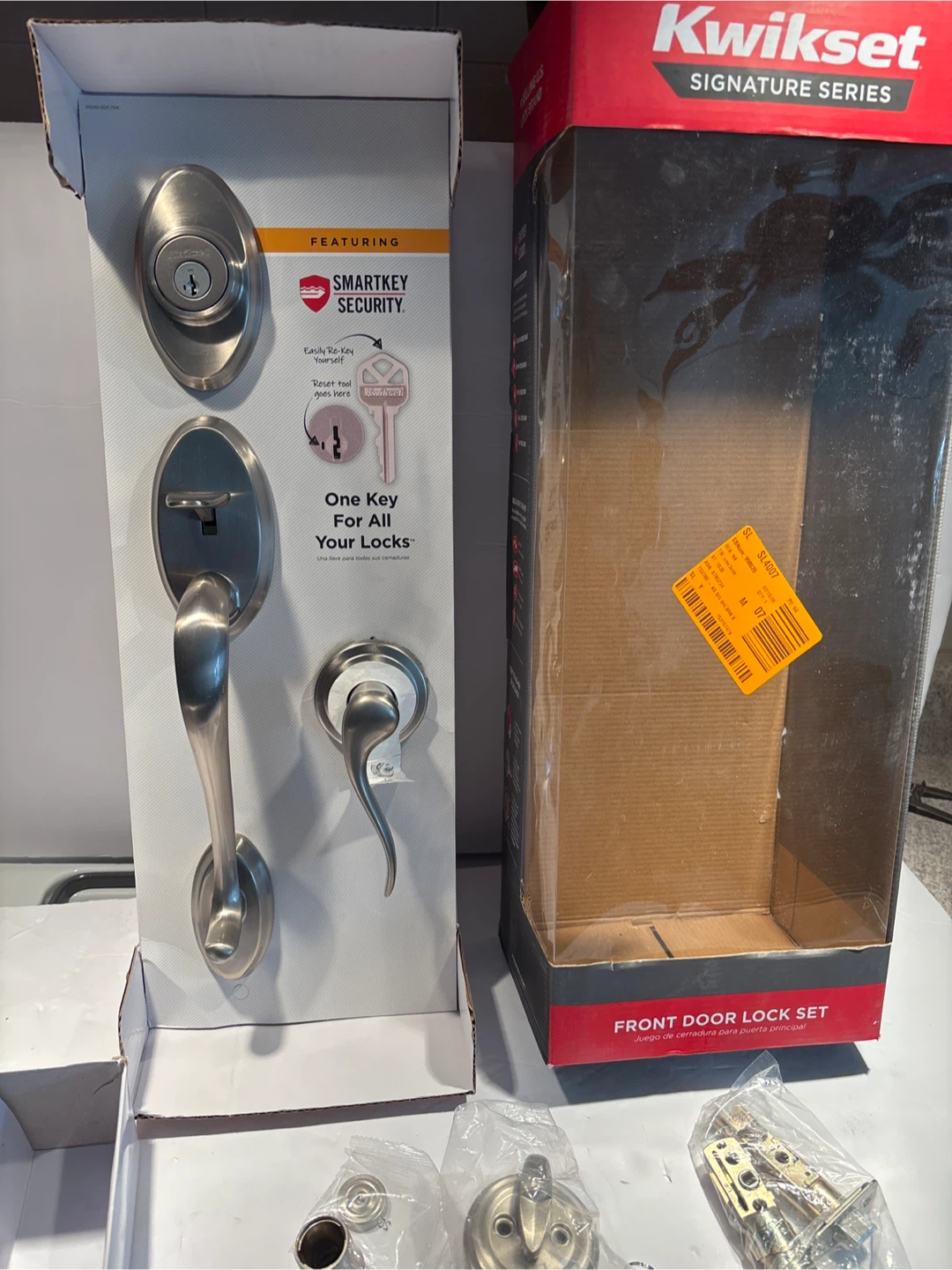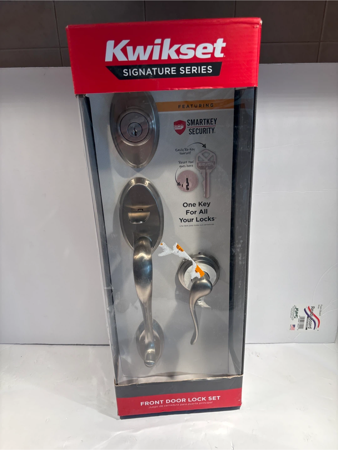 This Kwikset Signature Series front door lock set features SmartKey Security for re-keying convenience. It includes a handle, deadbolt, and interior/exterior components. Satin nickel finish.