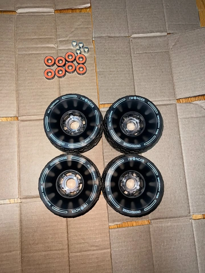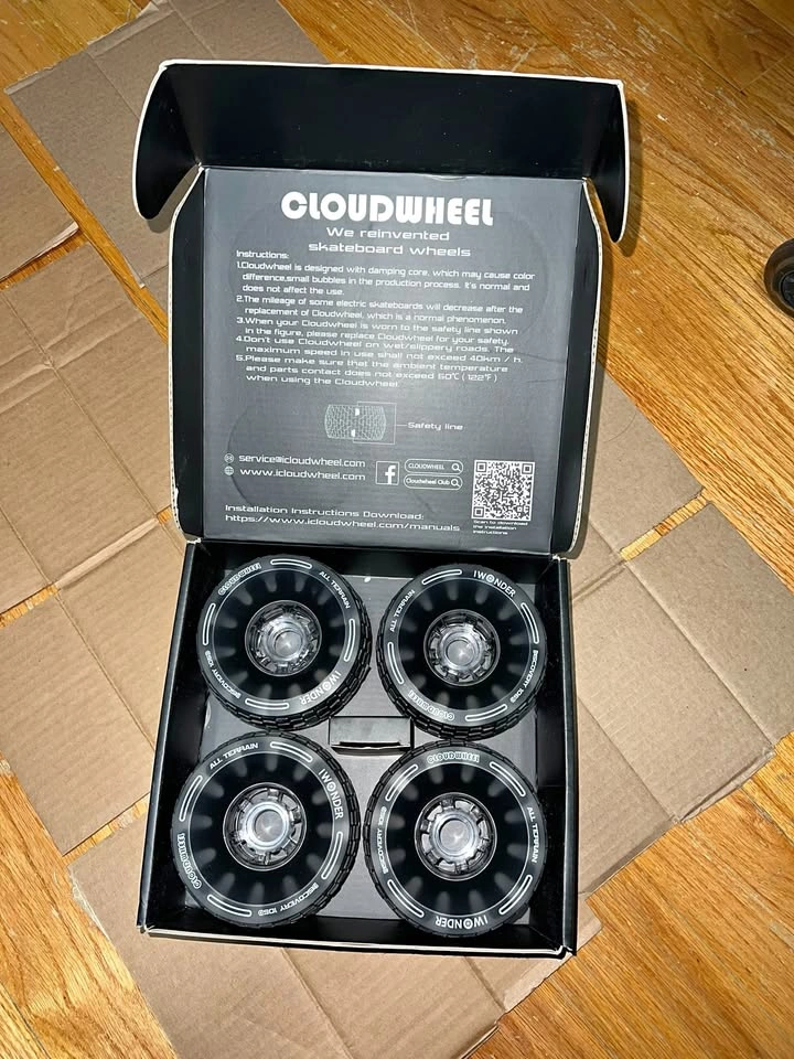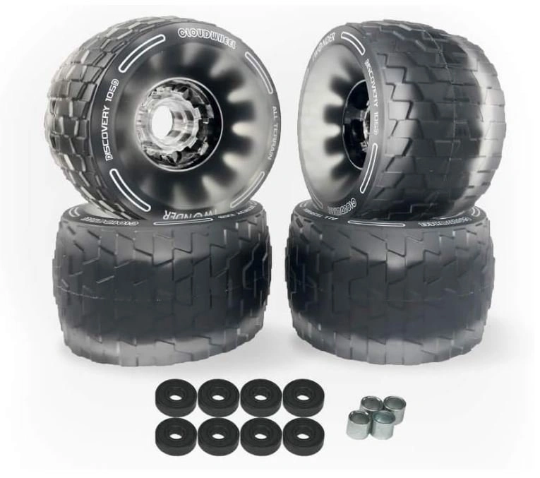 iWONDER CLOUDWHEEL 105MM DISCOVERY - ALL TERRAIN Wheel Size: 105mm Wheel Color: Obsidian Black Wheel Pulley Kit: Not Included Reason: Supposed to be a backup to my old wheels. Since I broke my skateboard, I won't be needing these anymore. *Brand new; not used; come with original box* *Open to offers*