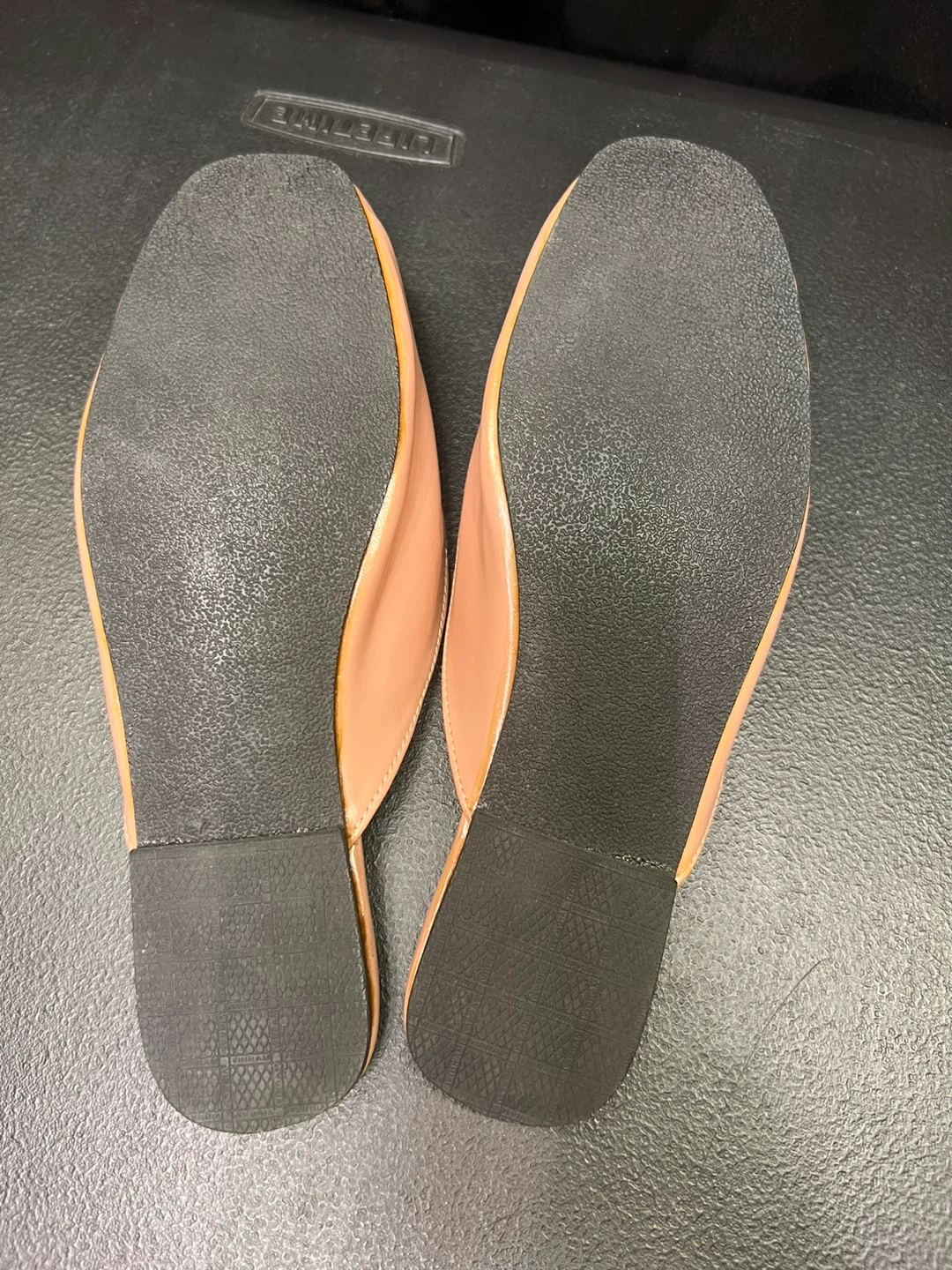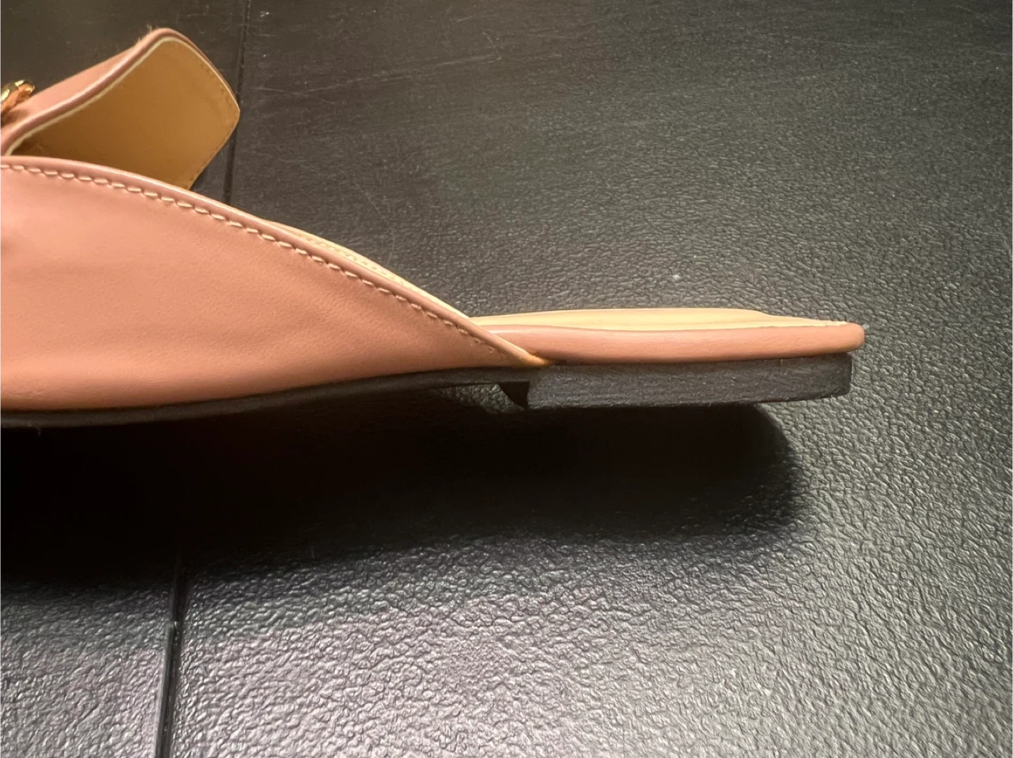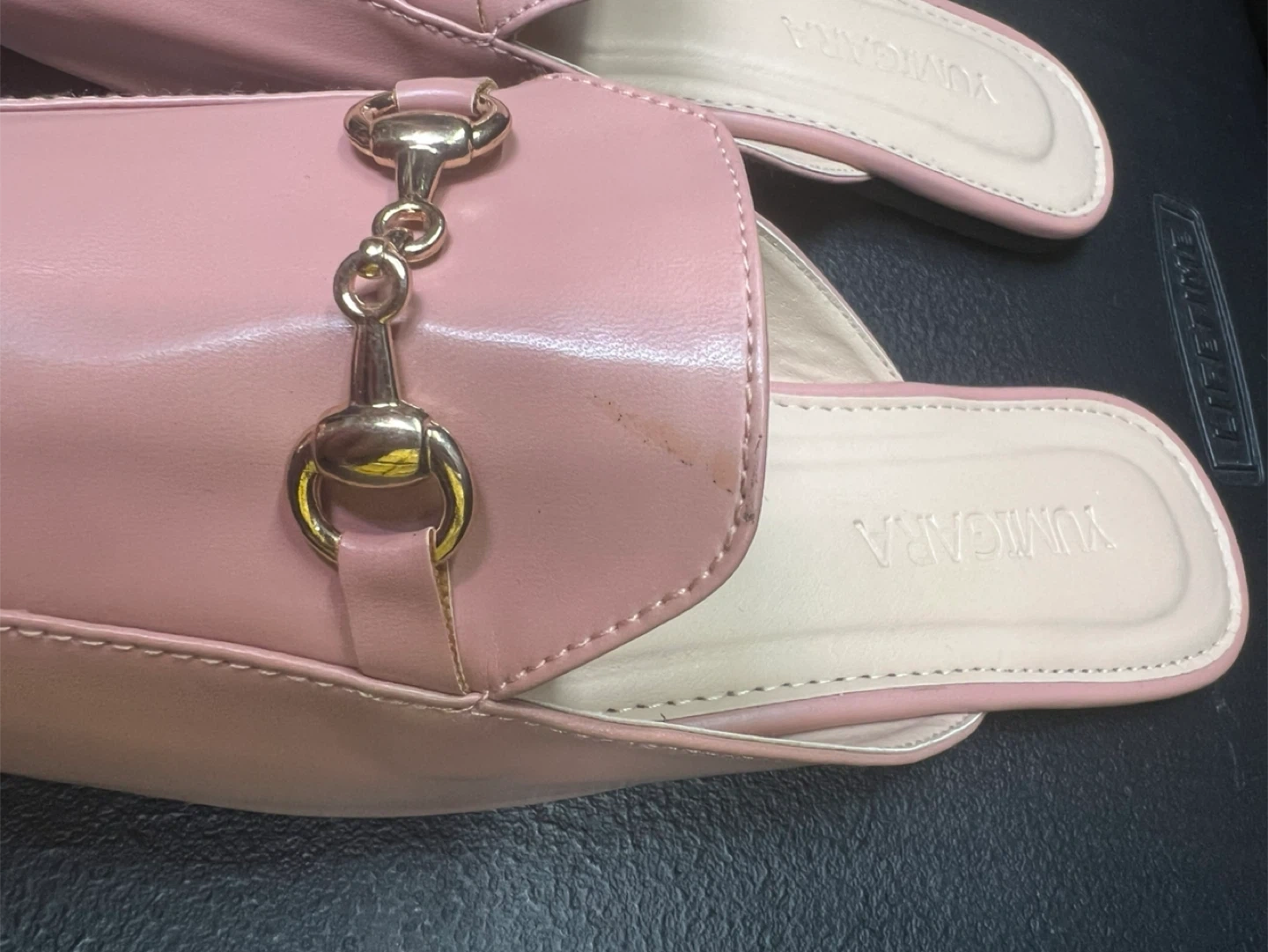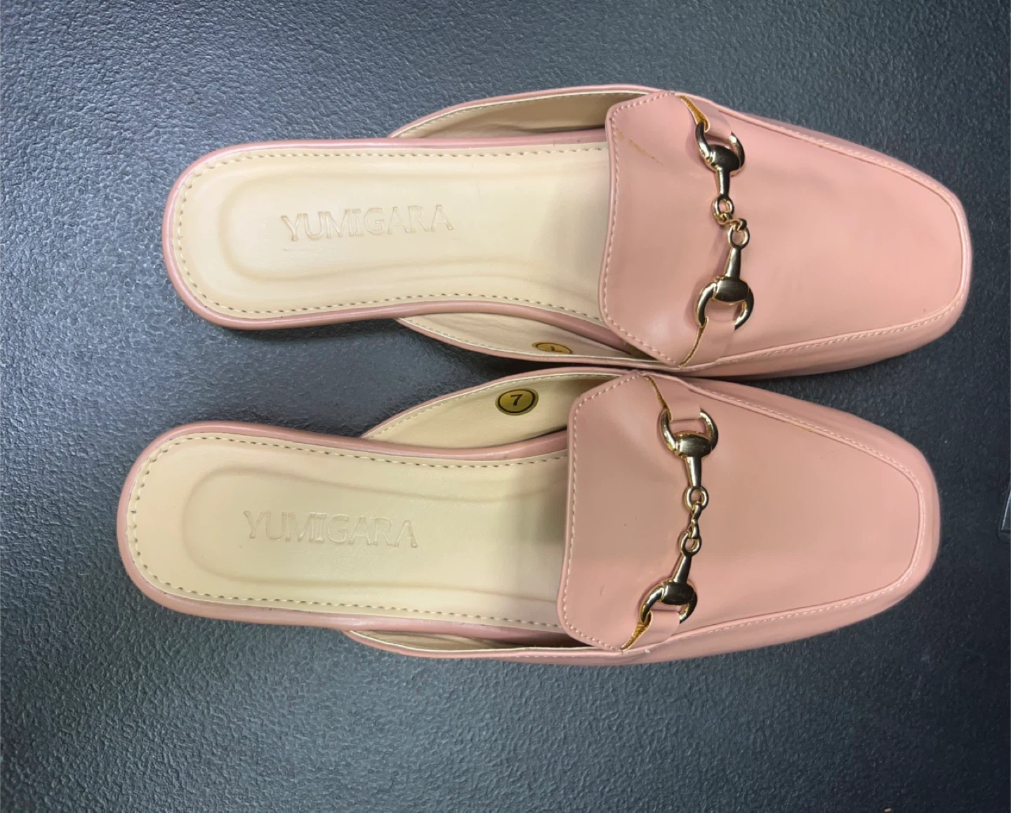 Yumigara pink slip-on mules with gold hardware. Synthetic material. Size 7. These slides are easy to wear!